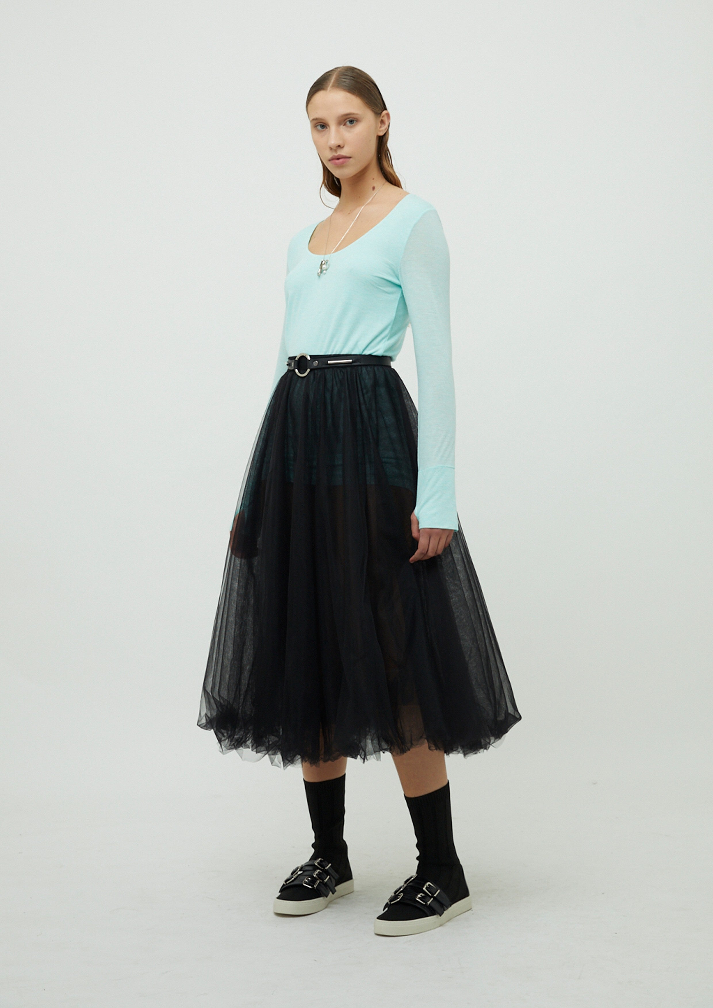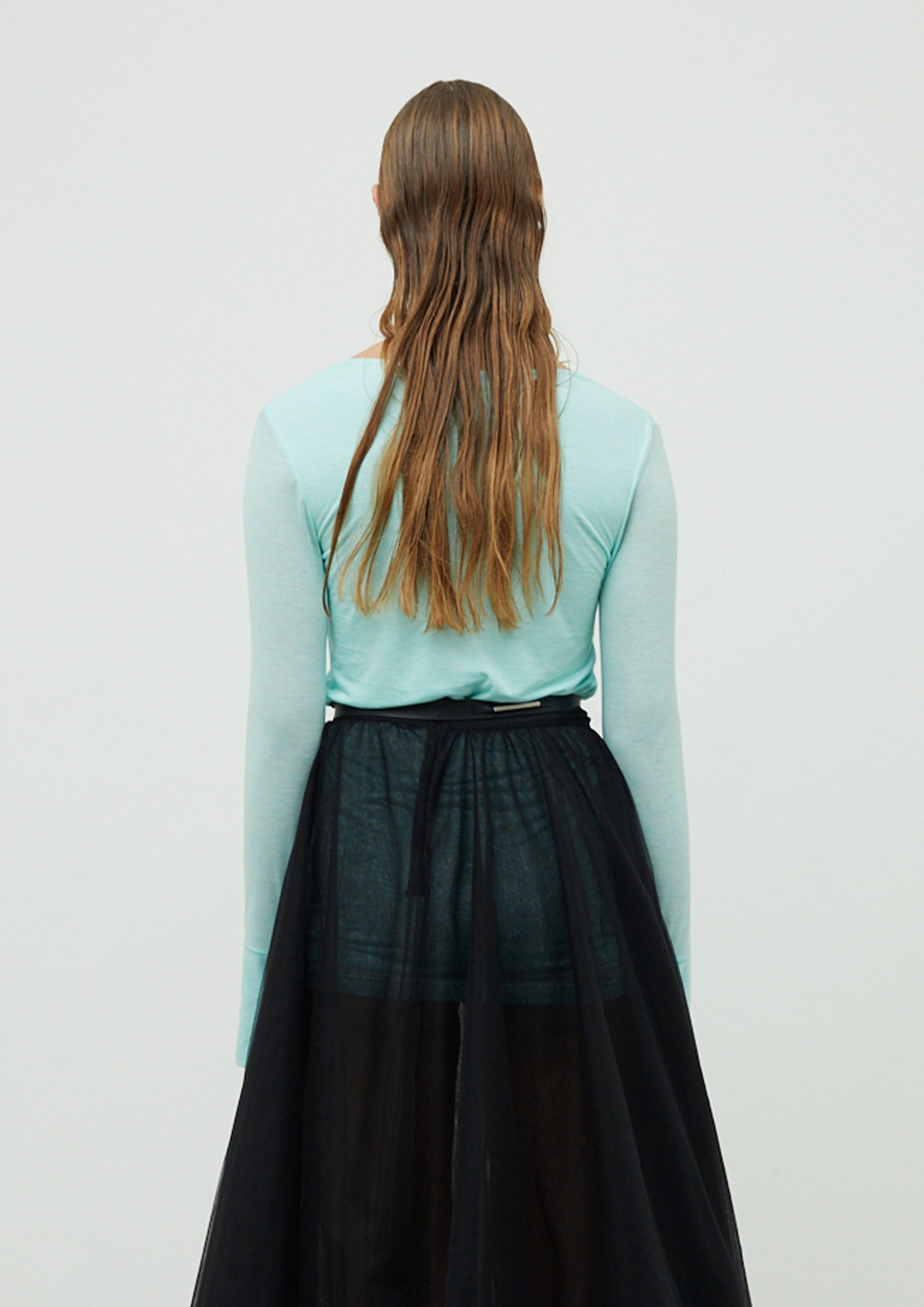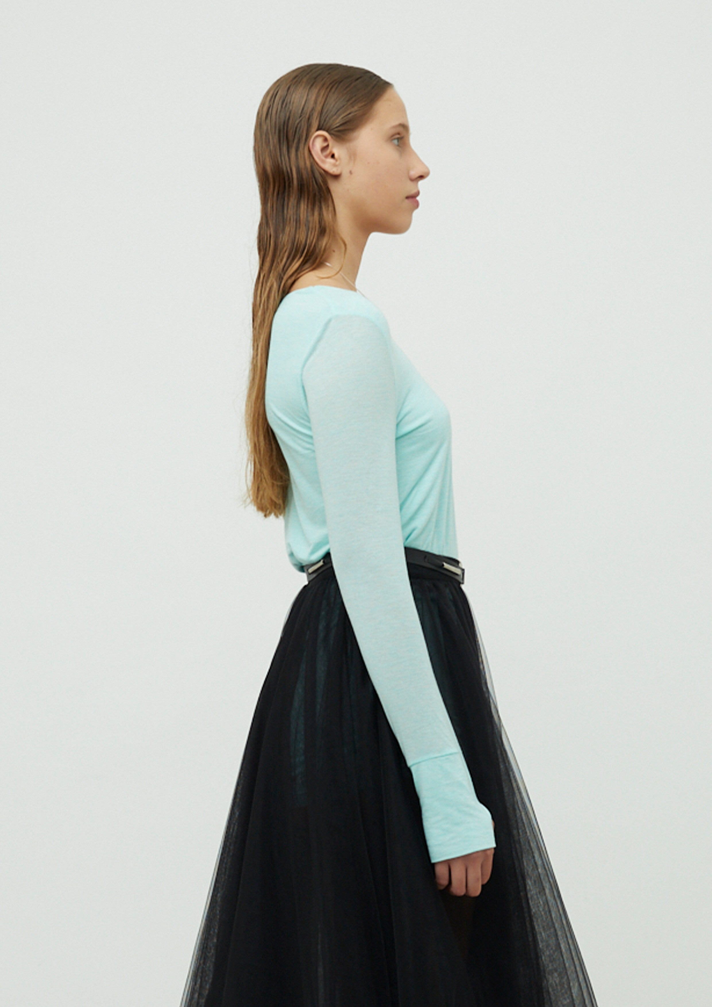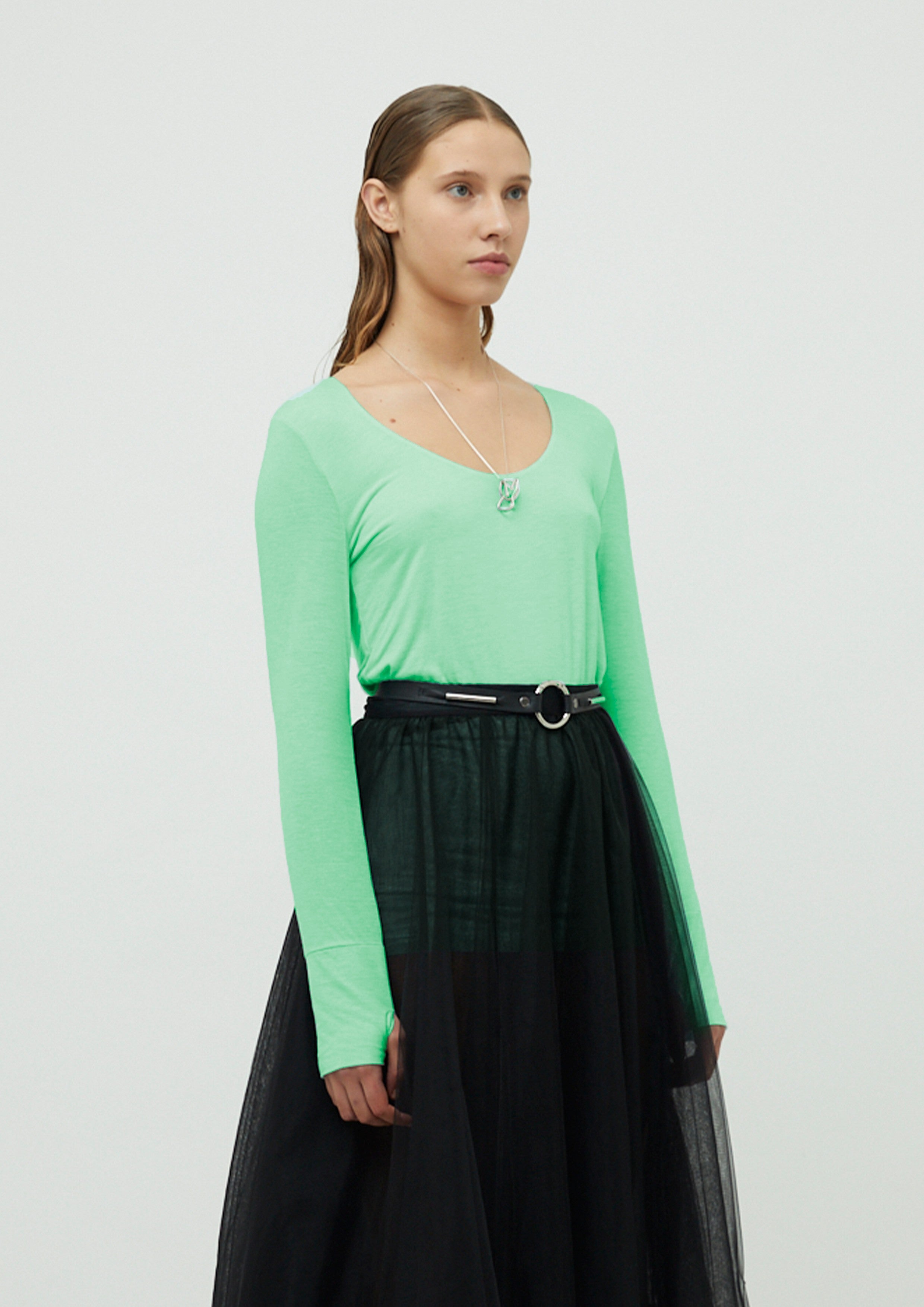 Blusa com decote U e mangas longas com leve transparência. Leve e prática para o dia a dia.