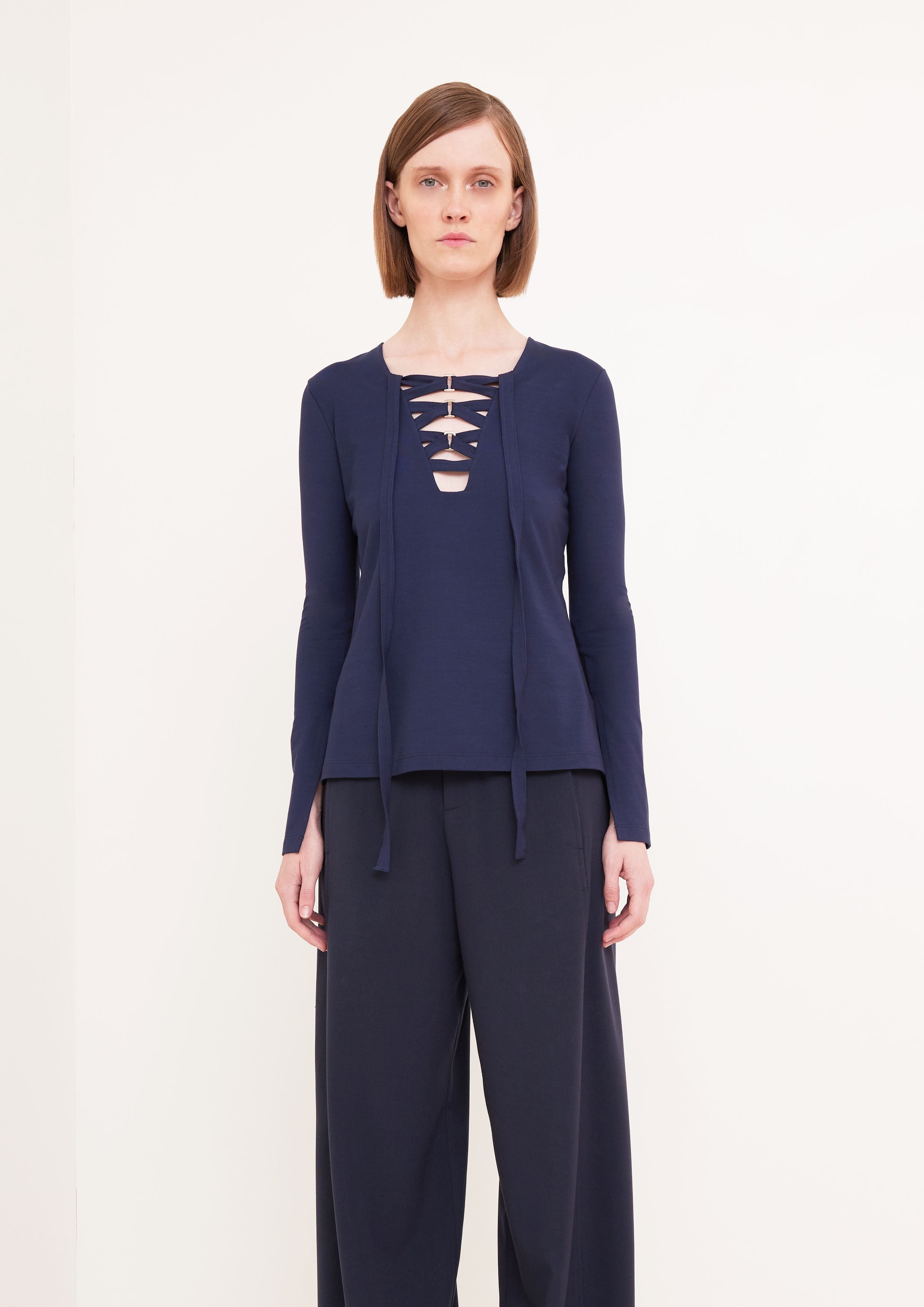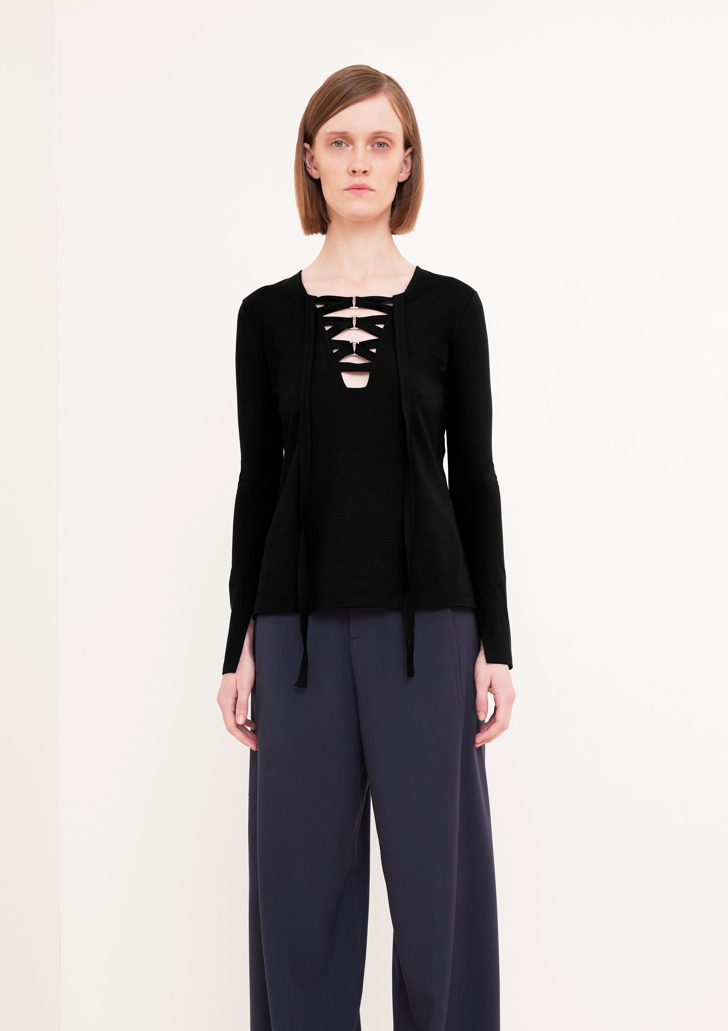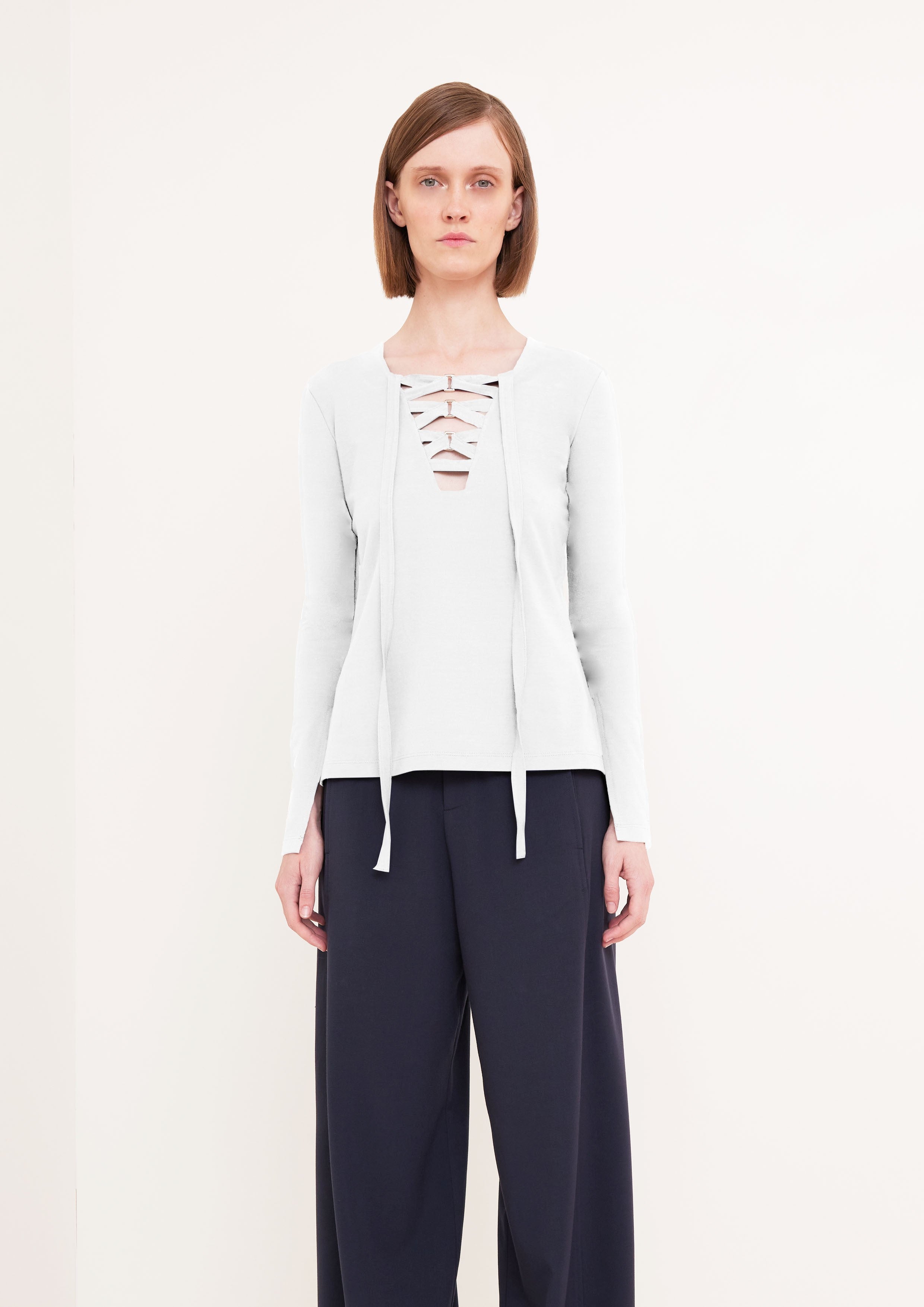 Blusa de mangas longas e decote V com detalhe de fita transpassada e fivelas.