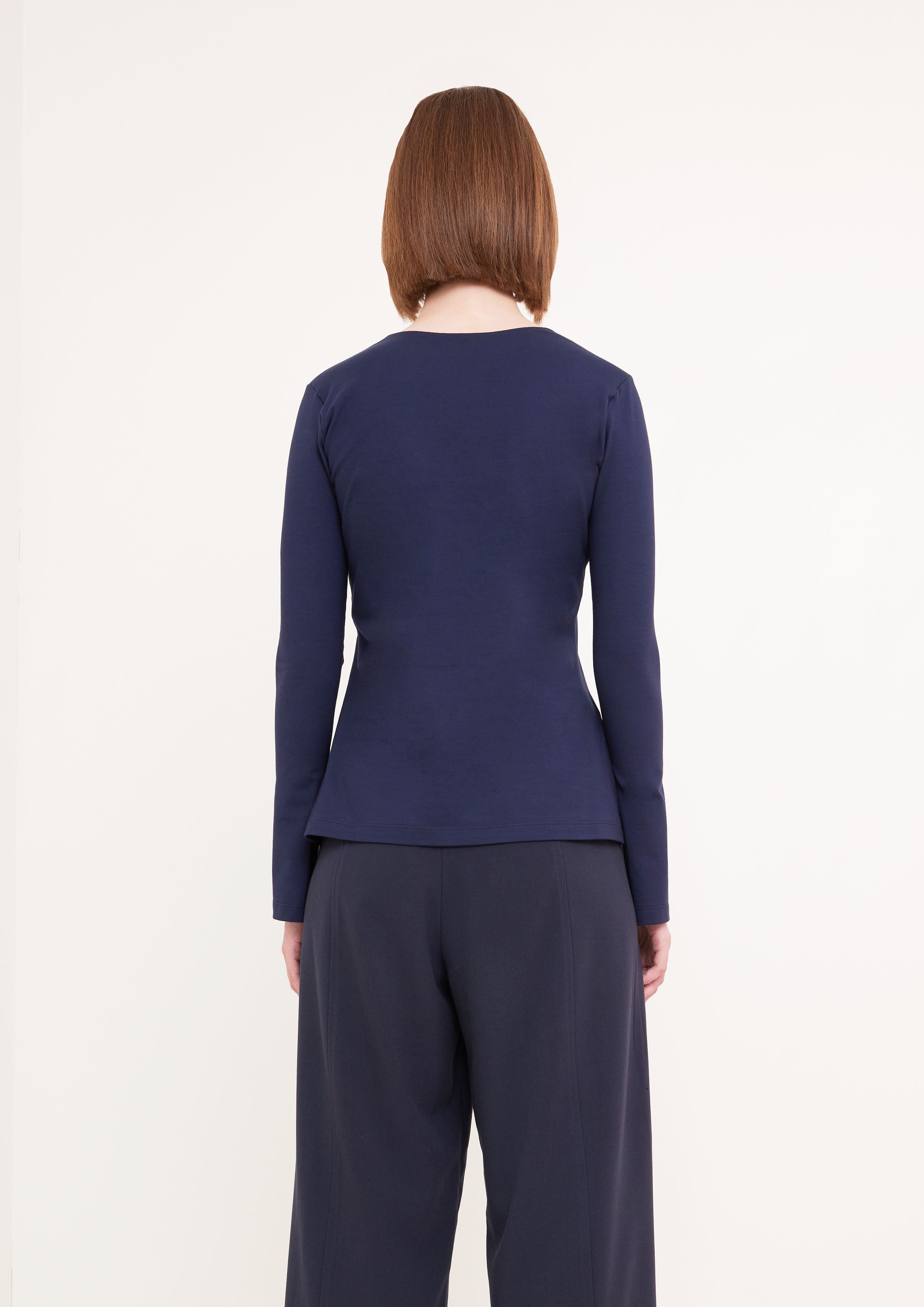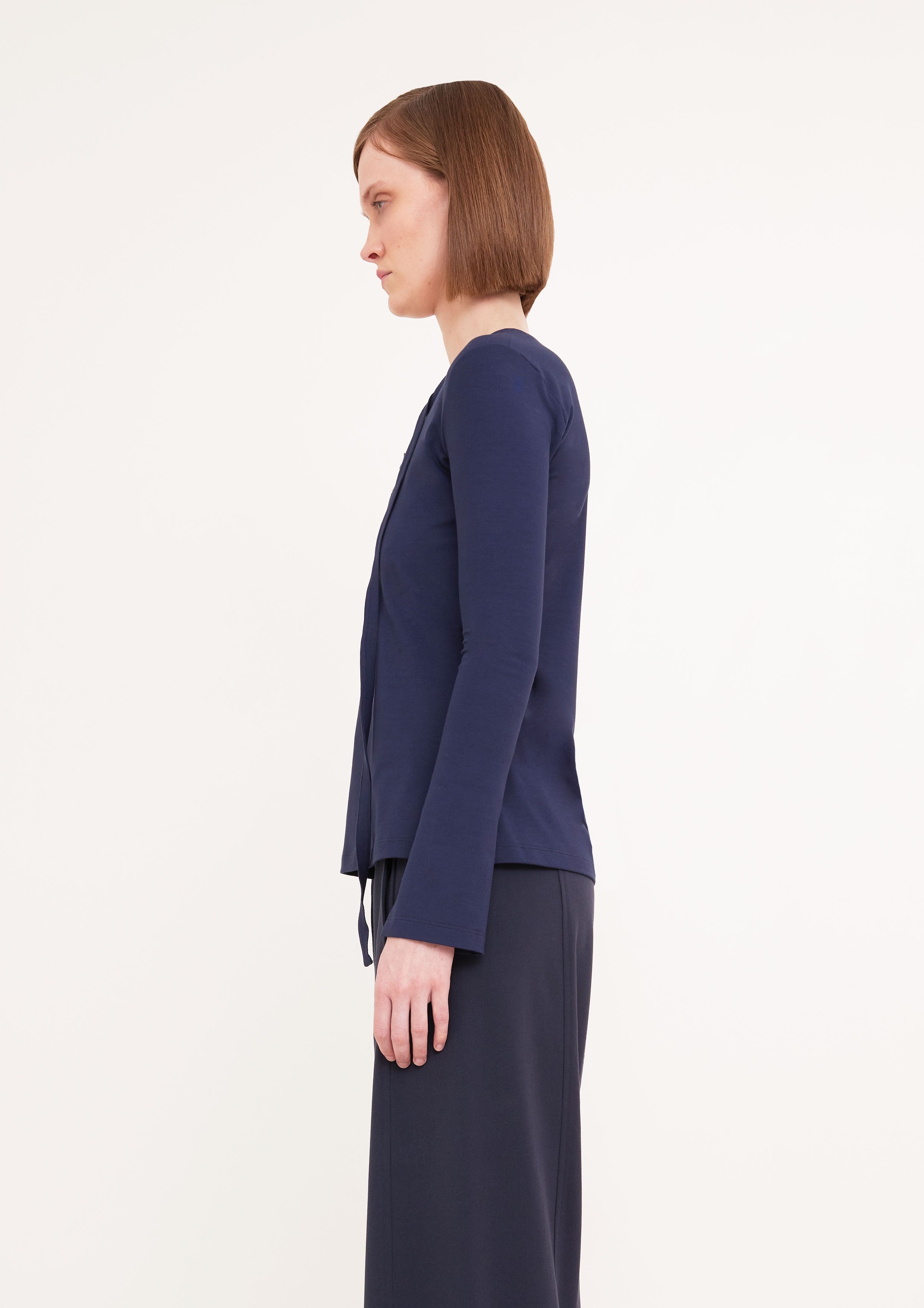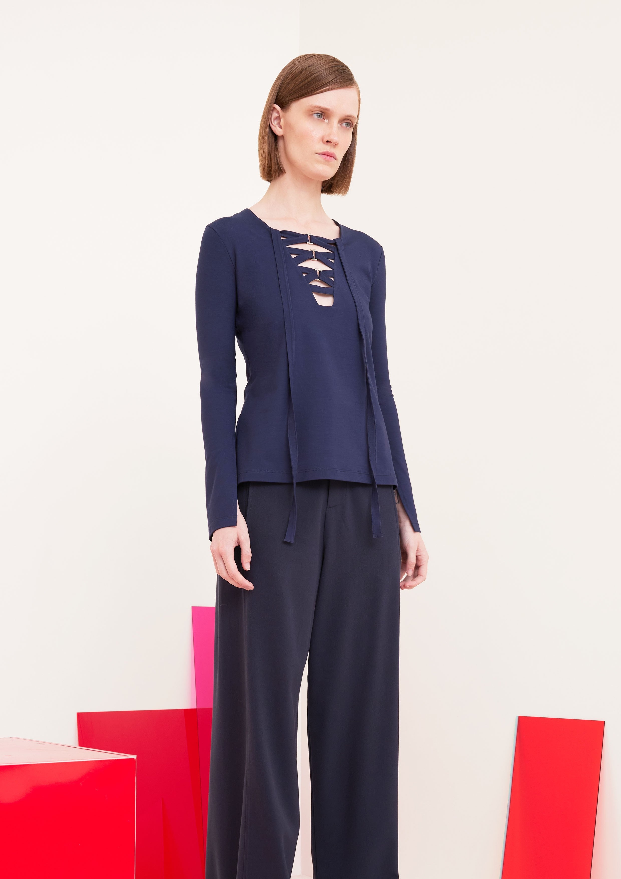 Blusa de mangas longas e decote V com detalhe de fita transpassada e fivelas.