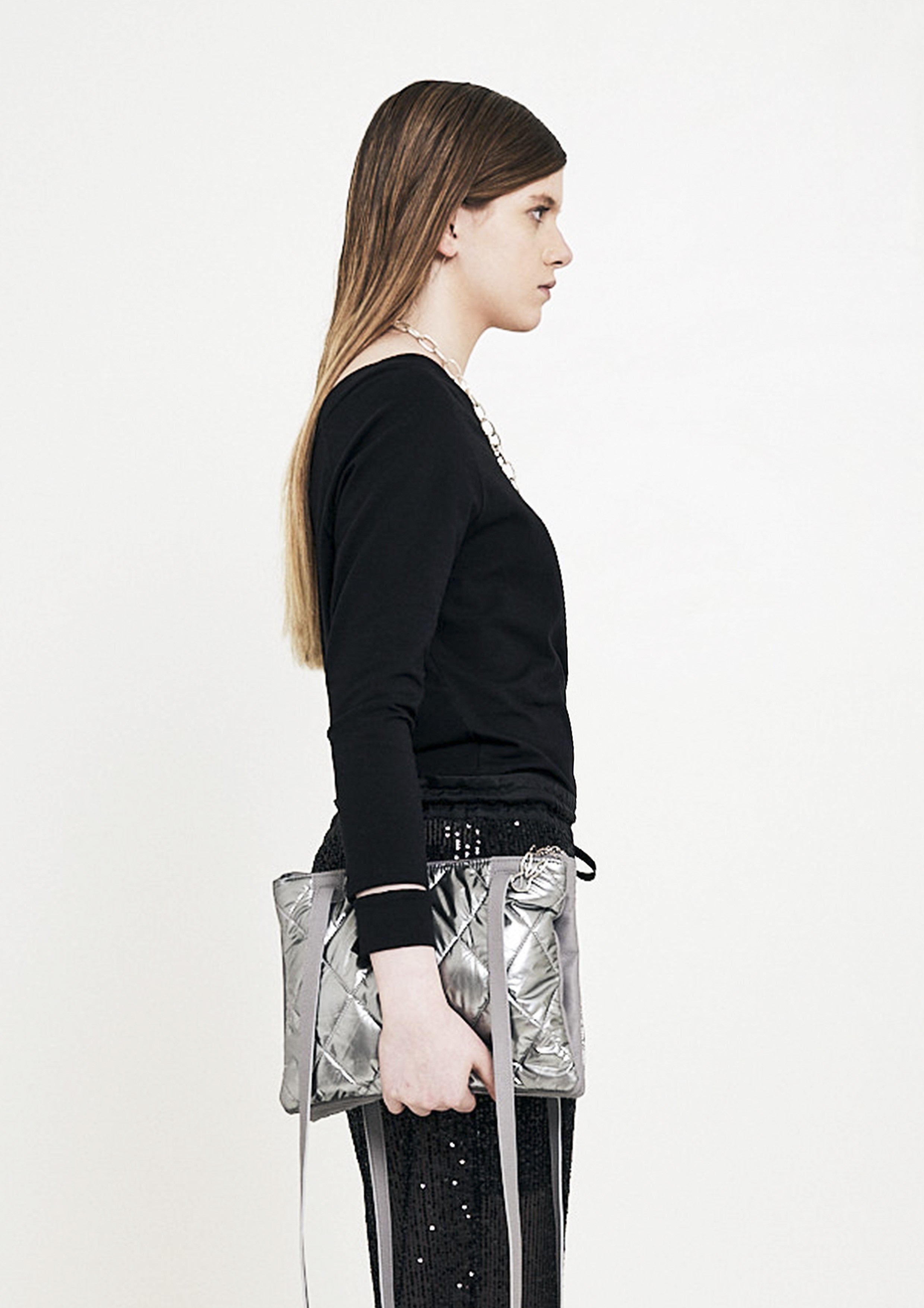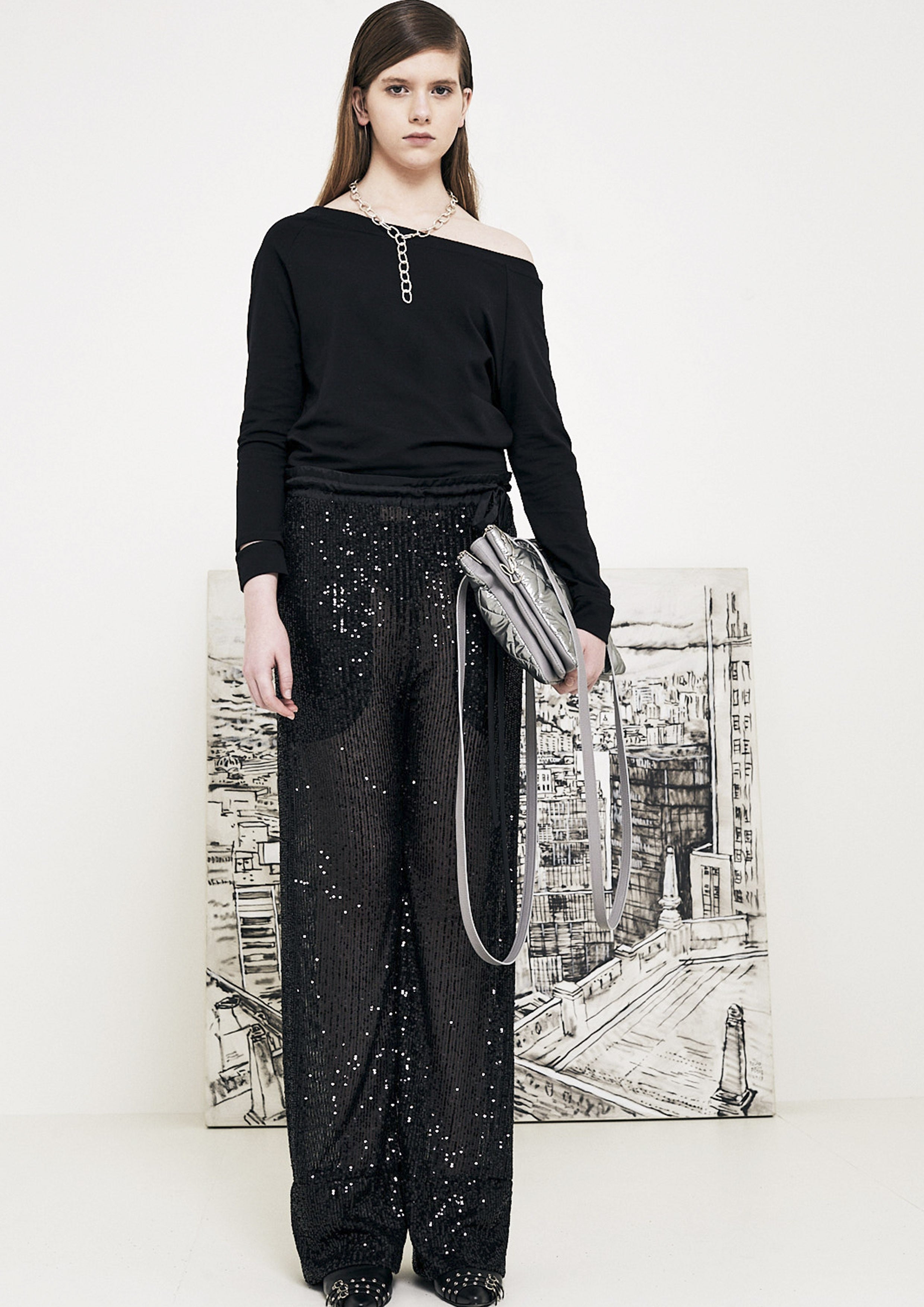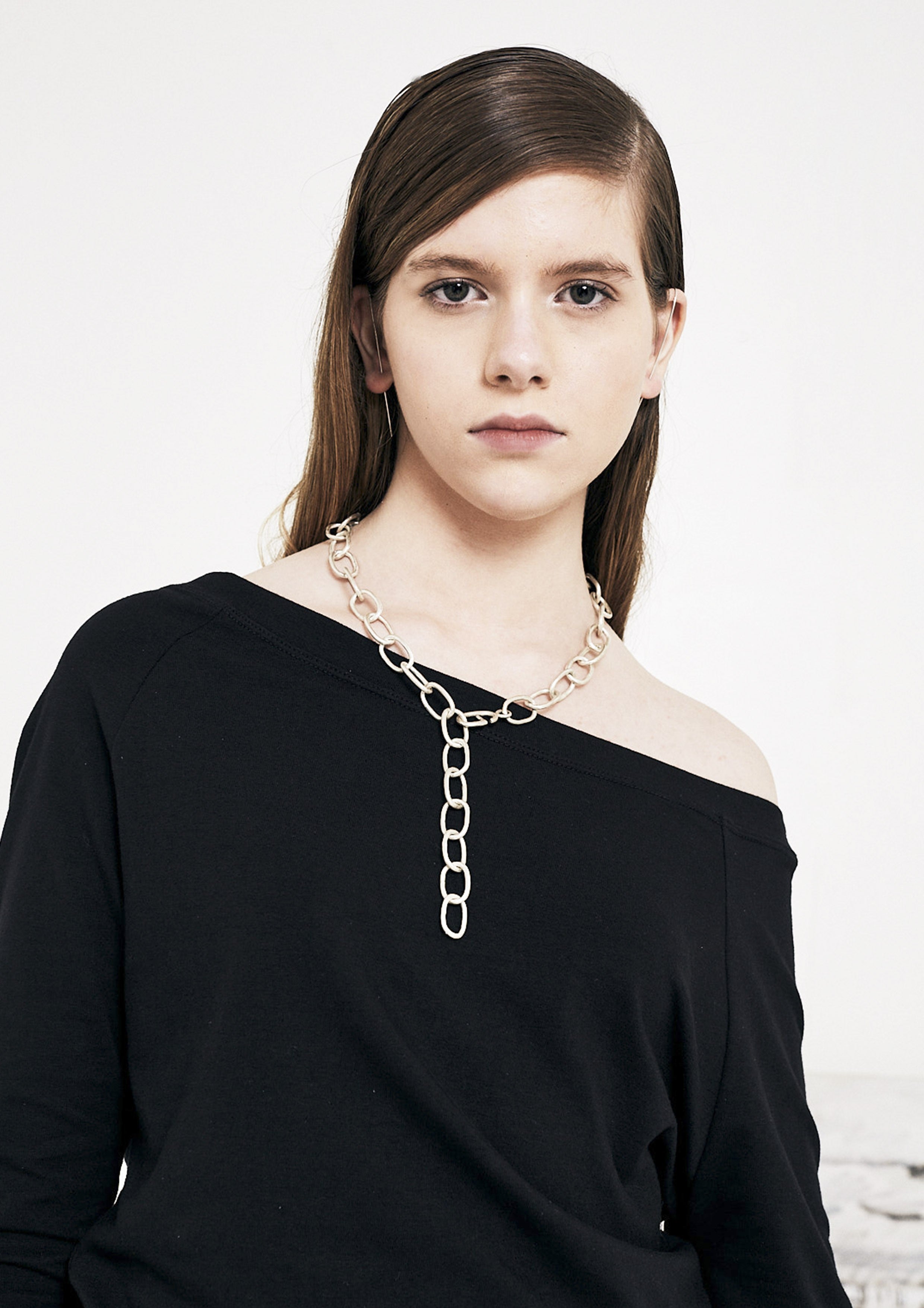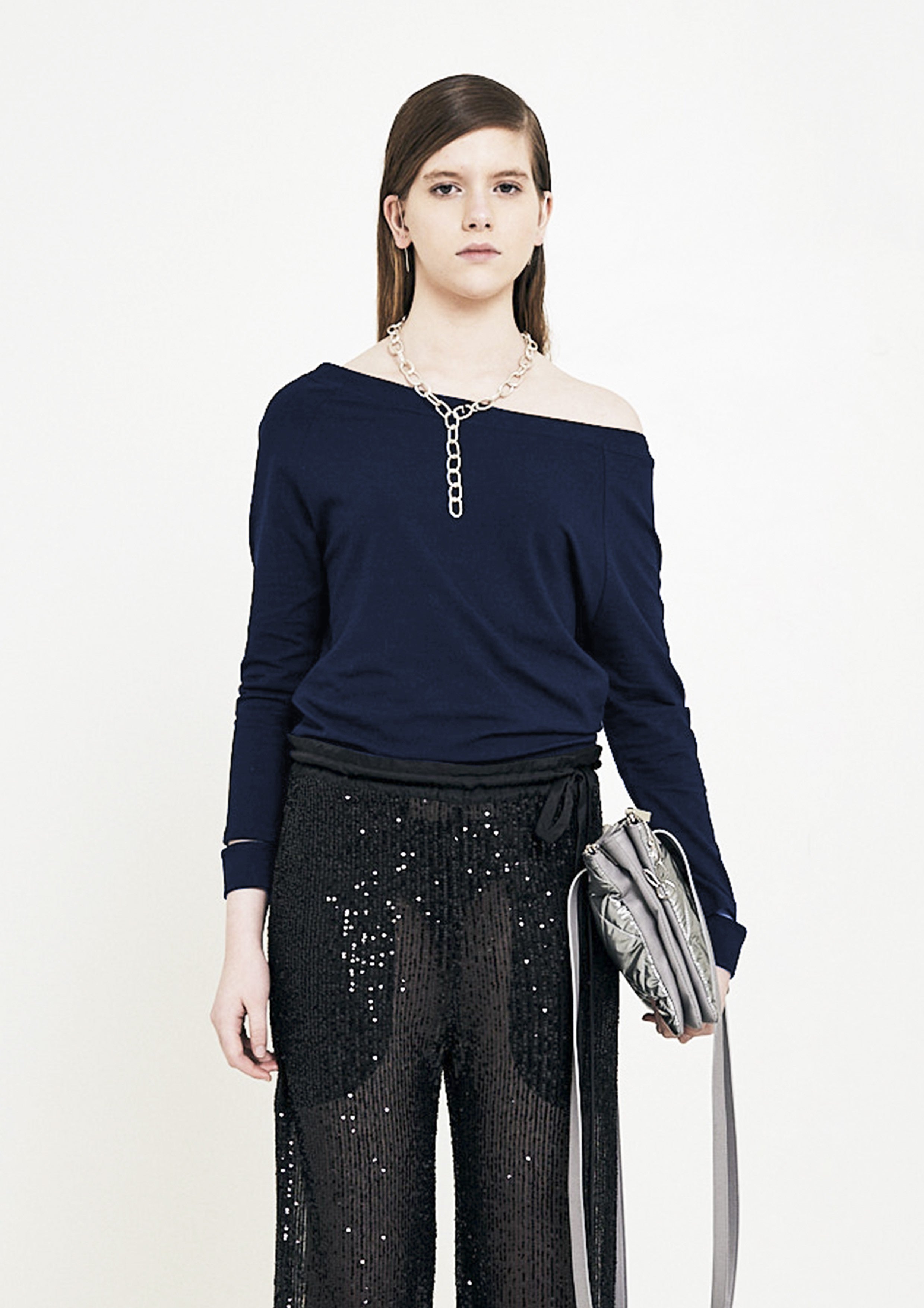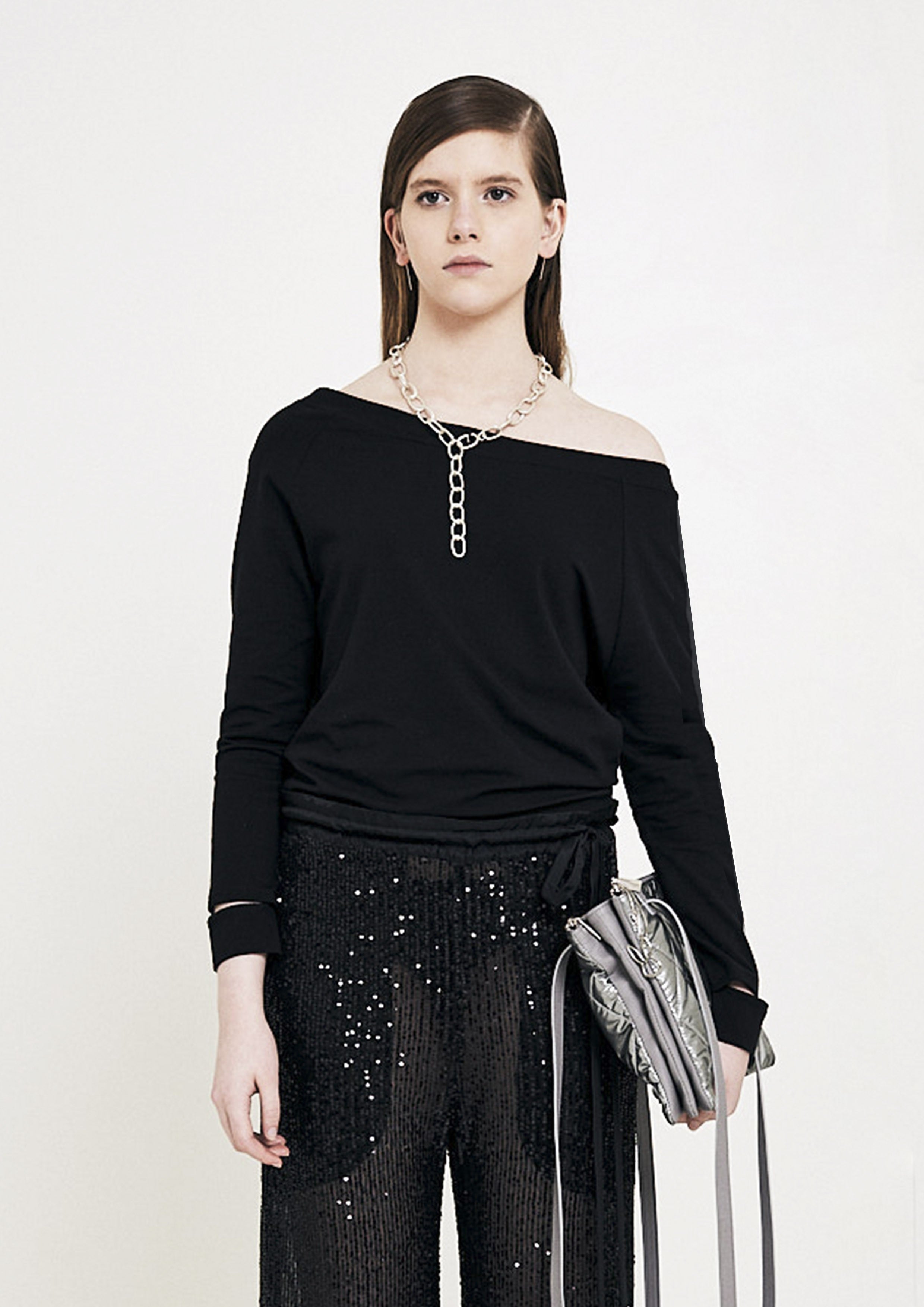 T-shirt de decote canoa e mangas longas. Possui modelagem leve e detalhes de recortes nos punhos.