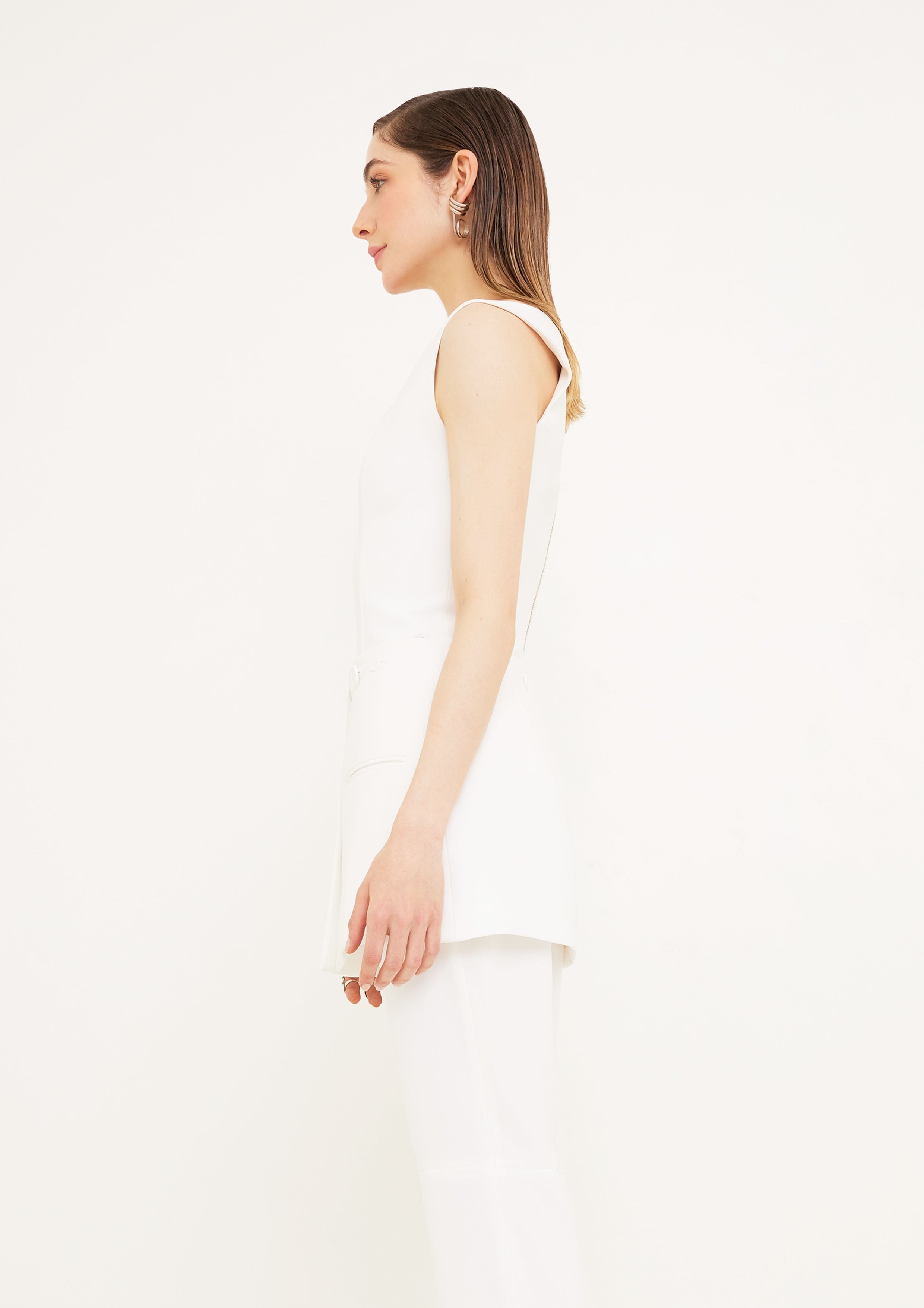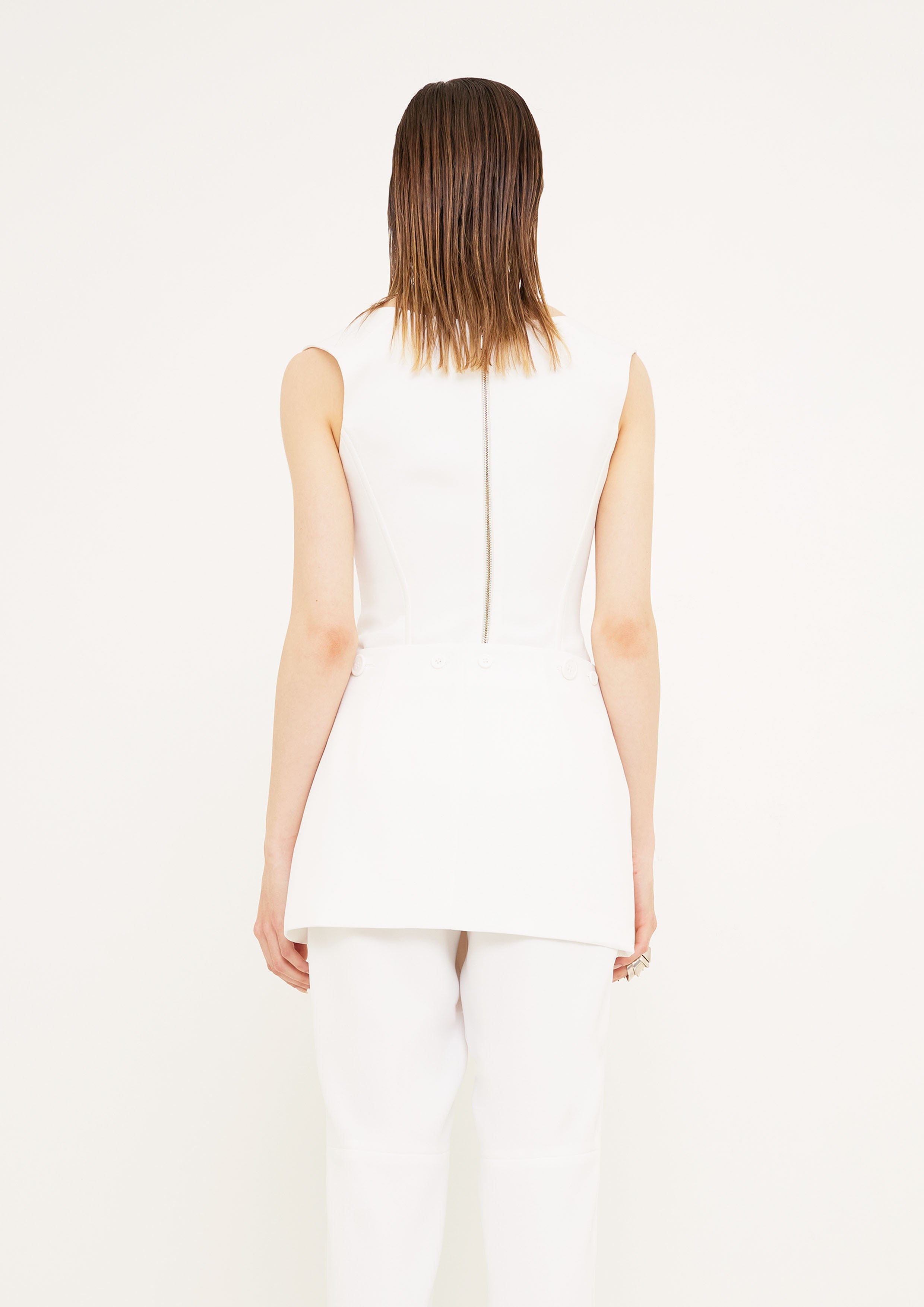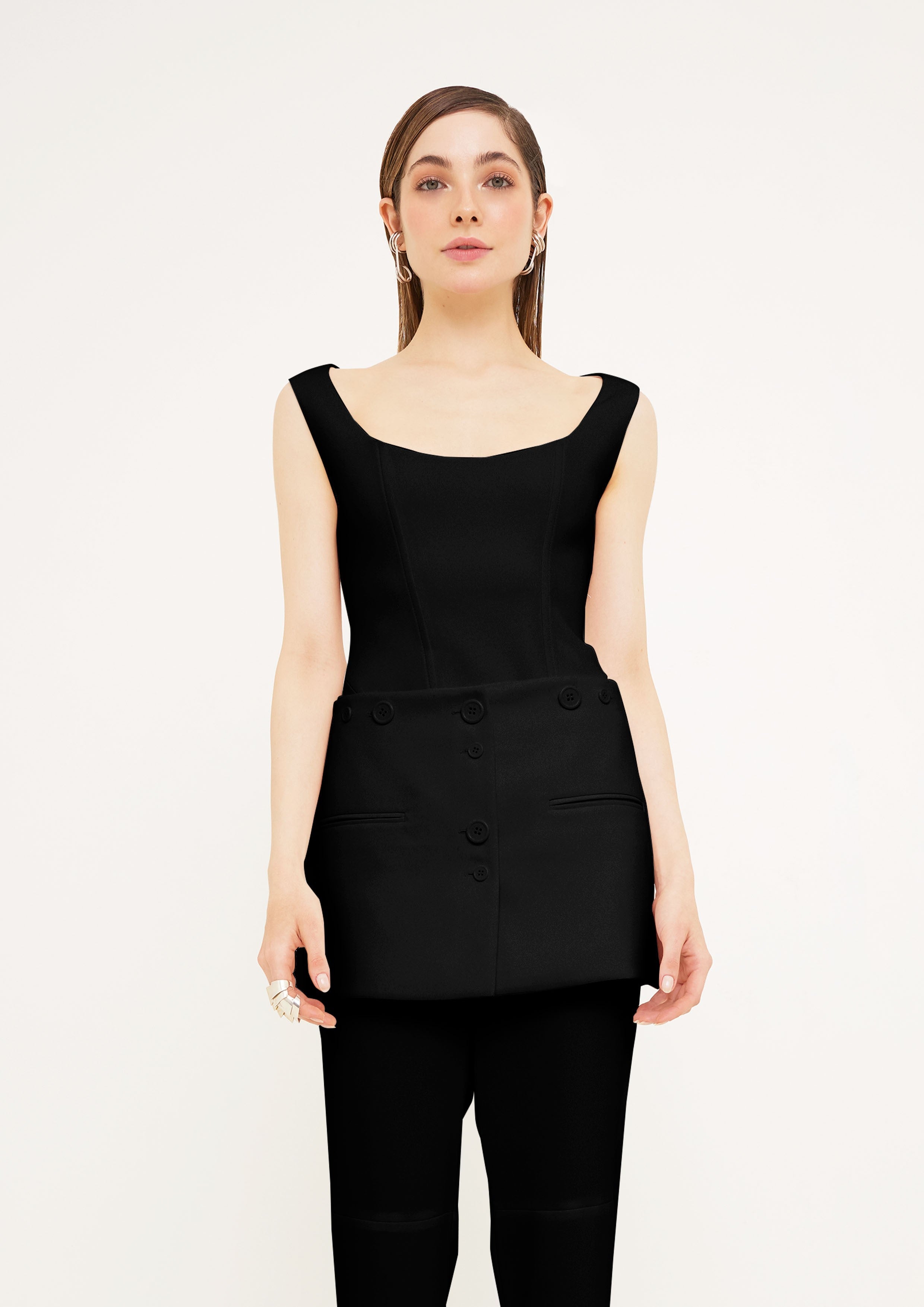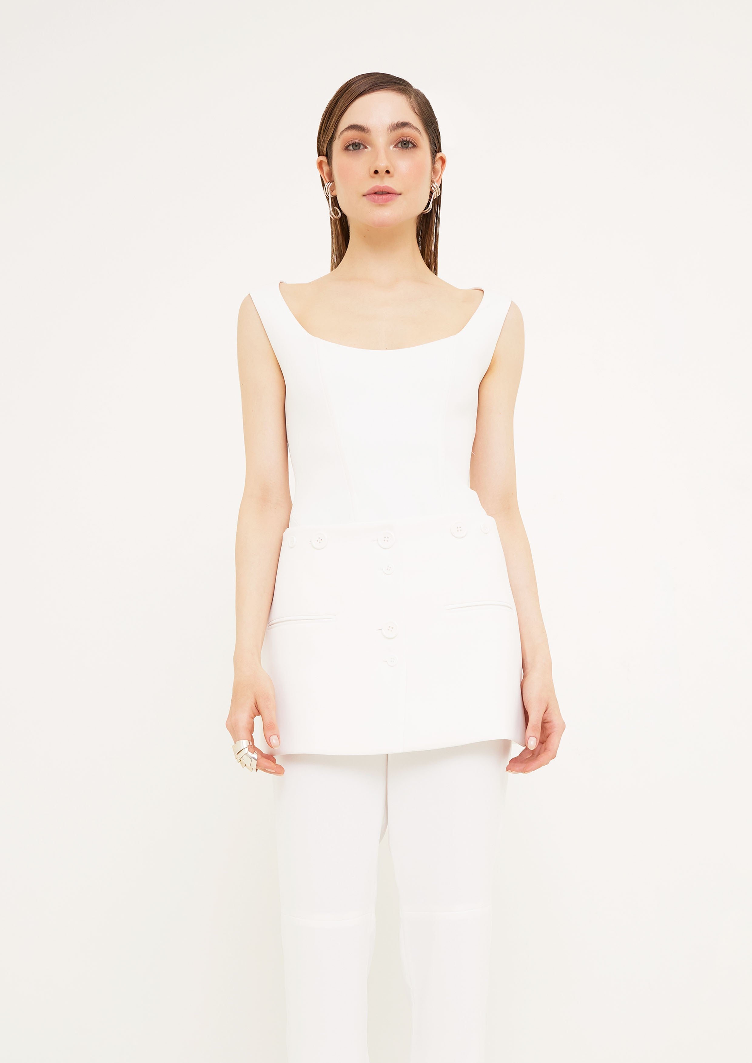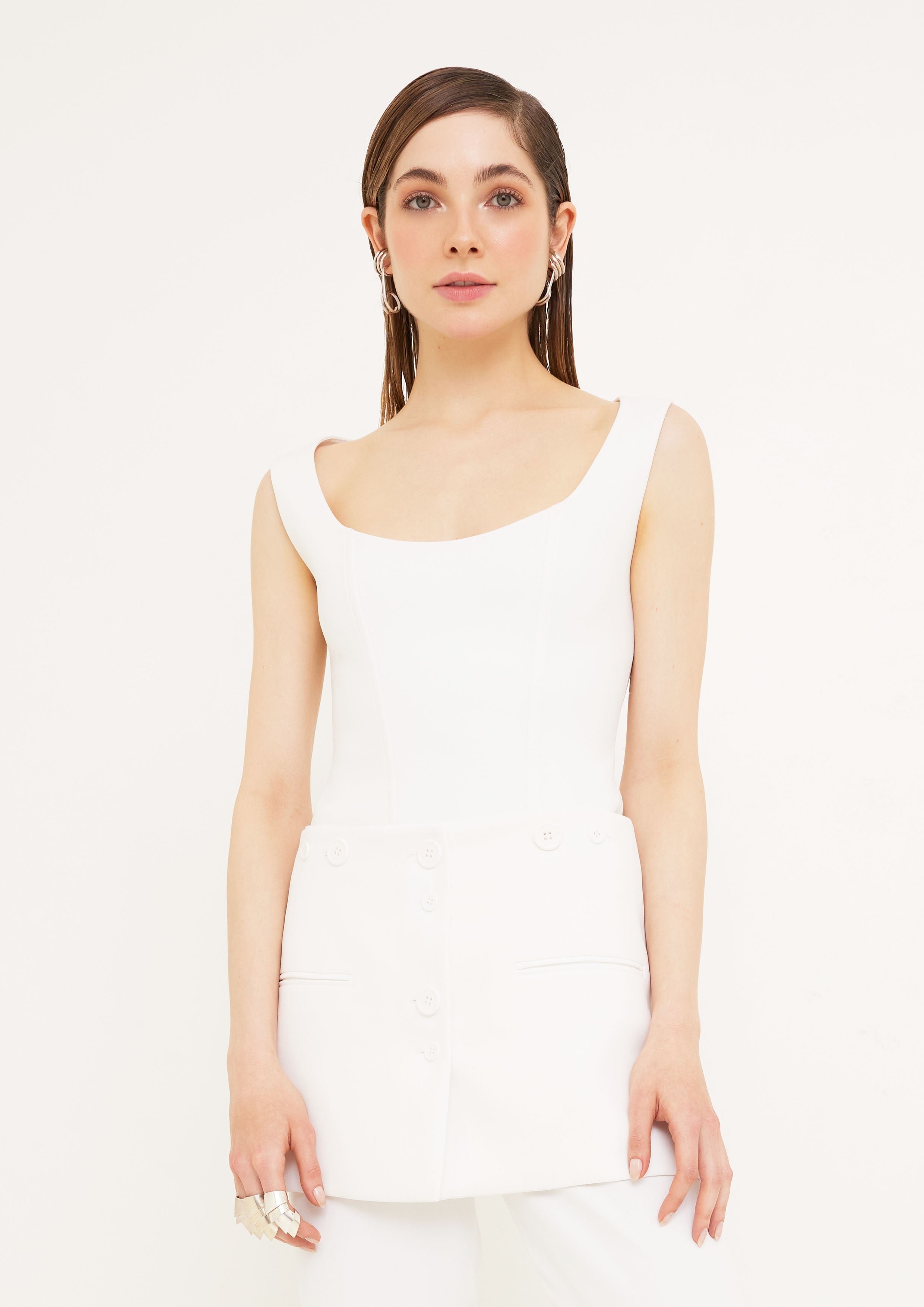 Blusa de comprimento cropped estilo corselet com mangas de espessura grossa e fecho por zíper na parte traseira.