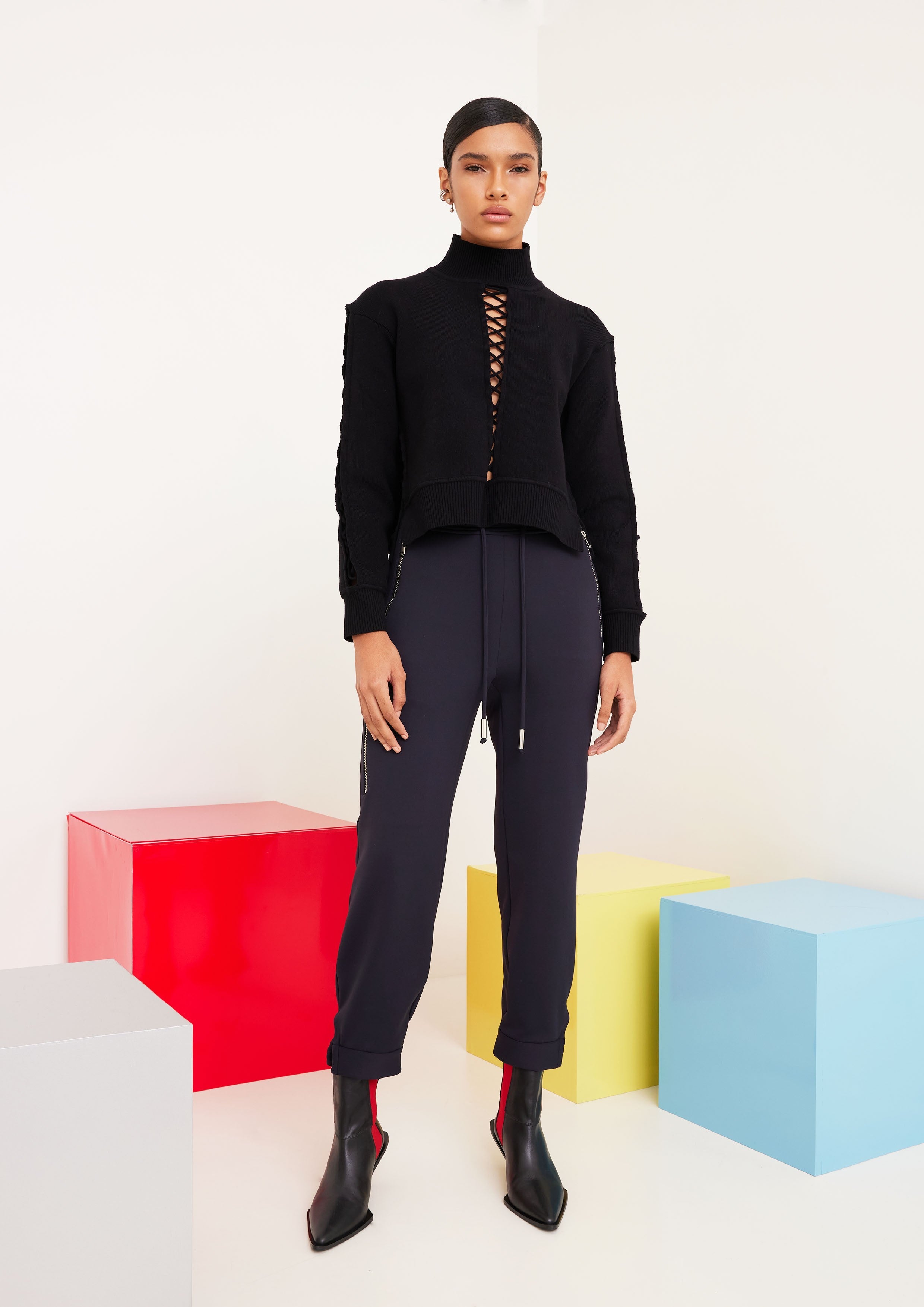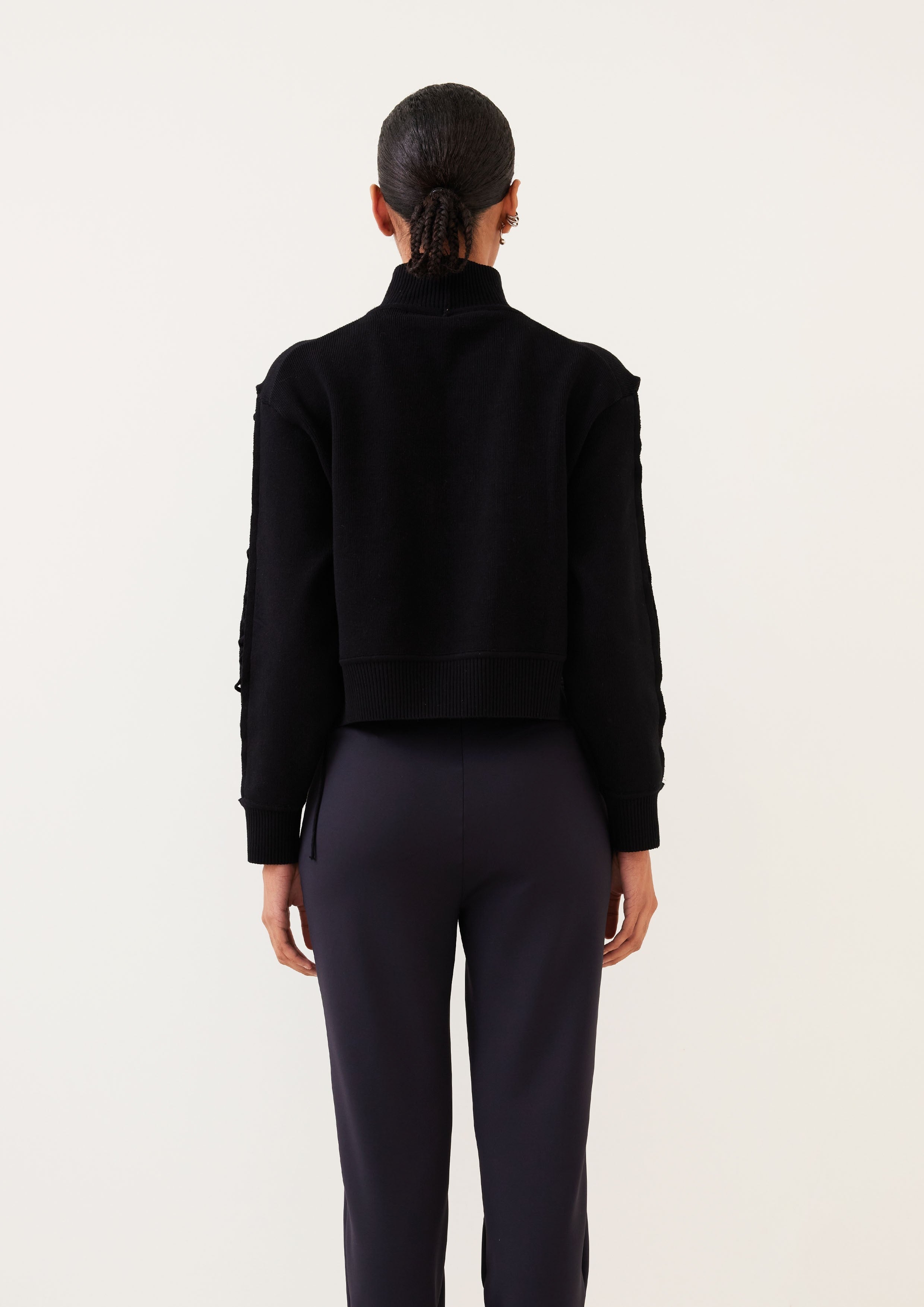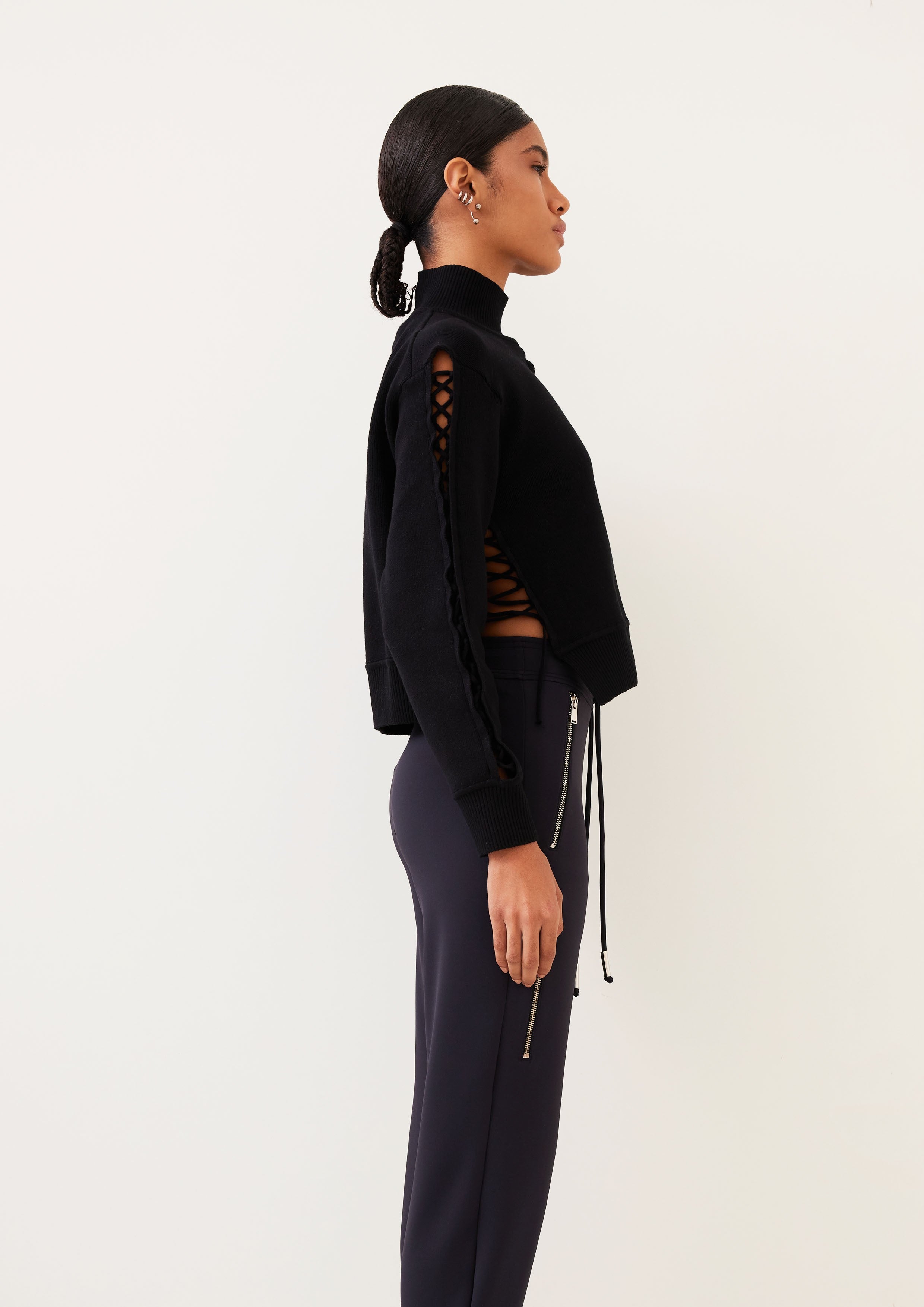Tricot de mangas compridas com gola rolê e detalhe de recortes com tiras cruzadas nas mangas, laterais e centro da peça.