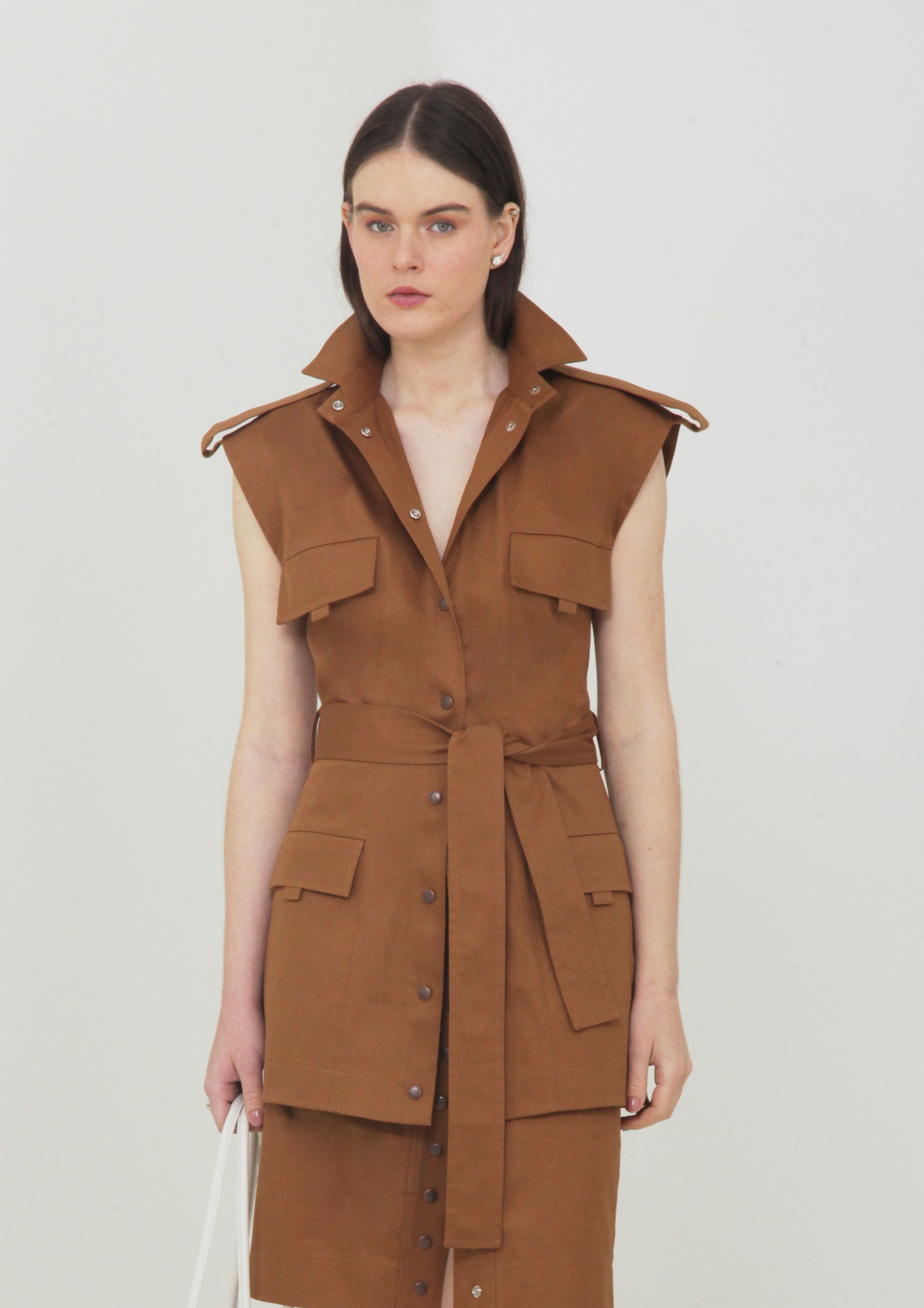 A Túnica Safari é uma peça statement que une sofisticação e utilitarismo em um design atemporal. Confeccionada em tecido premium com predominância de algodão e um leve toque de elastano, oferece conforto aliado a uma estrutura impecável. O modelo valoriza a silhueta através do cinto ajustável na cintura, enquanto os bolsos utilitários e a gola ampla remetem ao clássico estilo safari com uma releitura contemporânea. Ideal para composições urbanas sofisticadas ou produções de viagem com elegância natural.