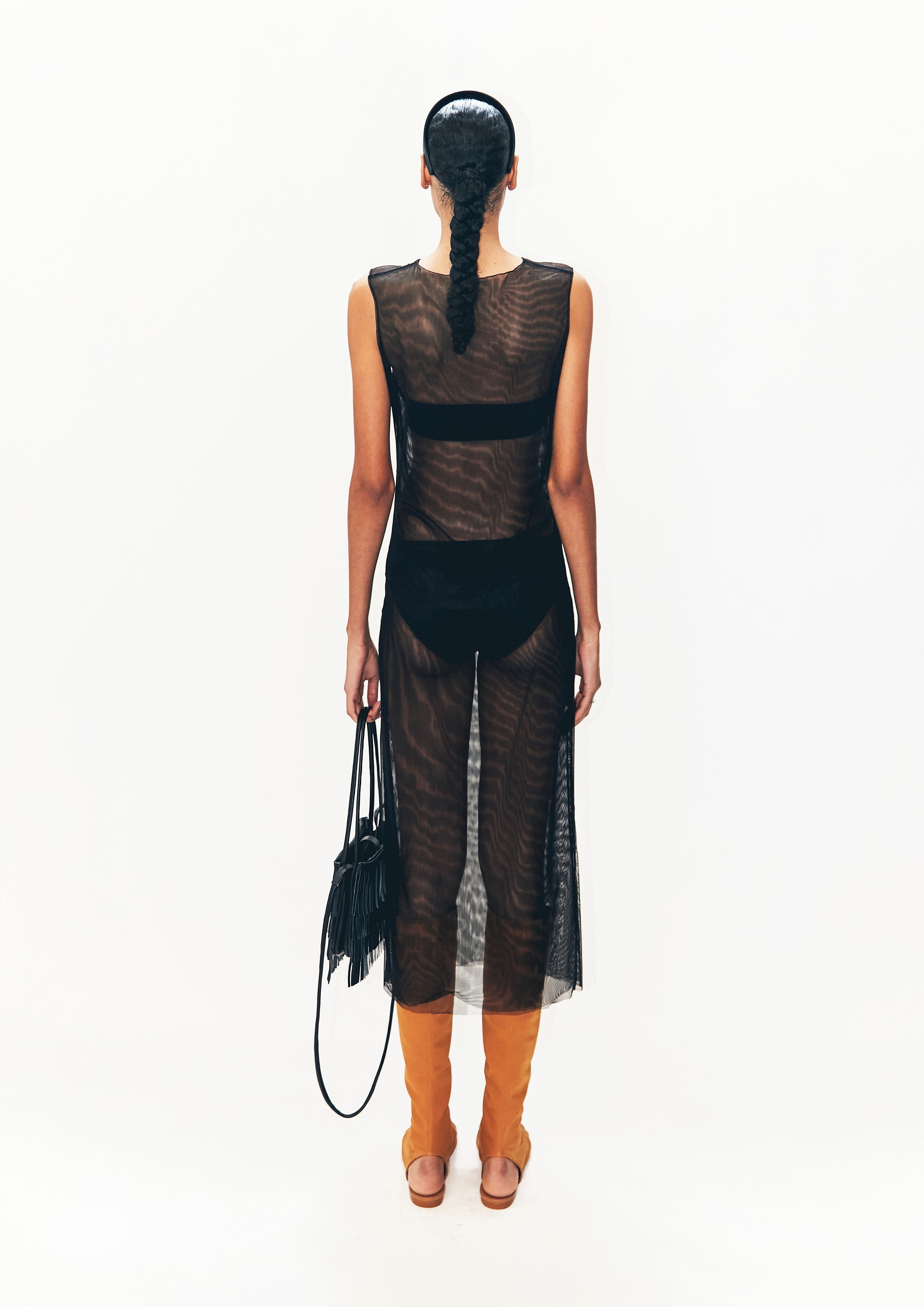 Vestido de festa longo de tule com trabalho em forma de árvore em malha, decote redondo.