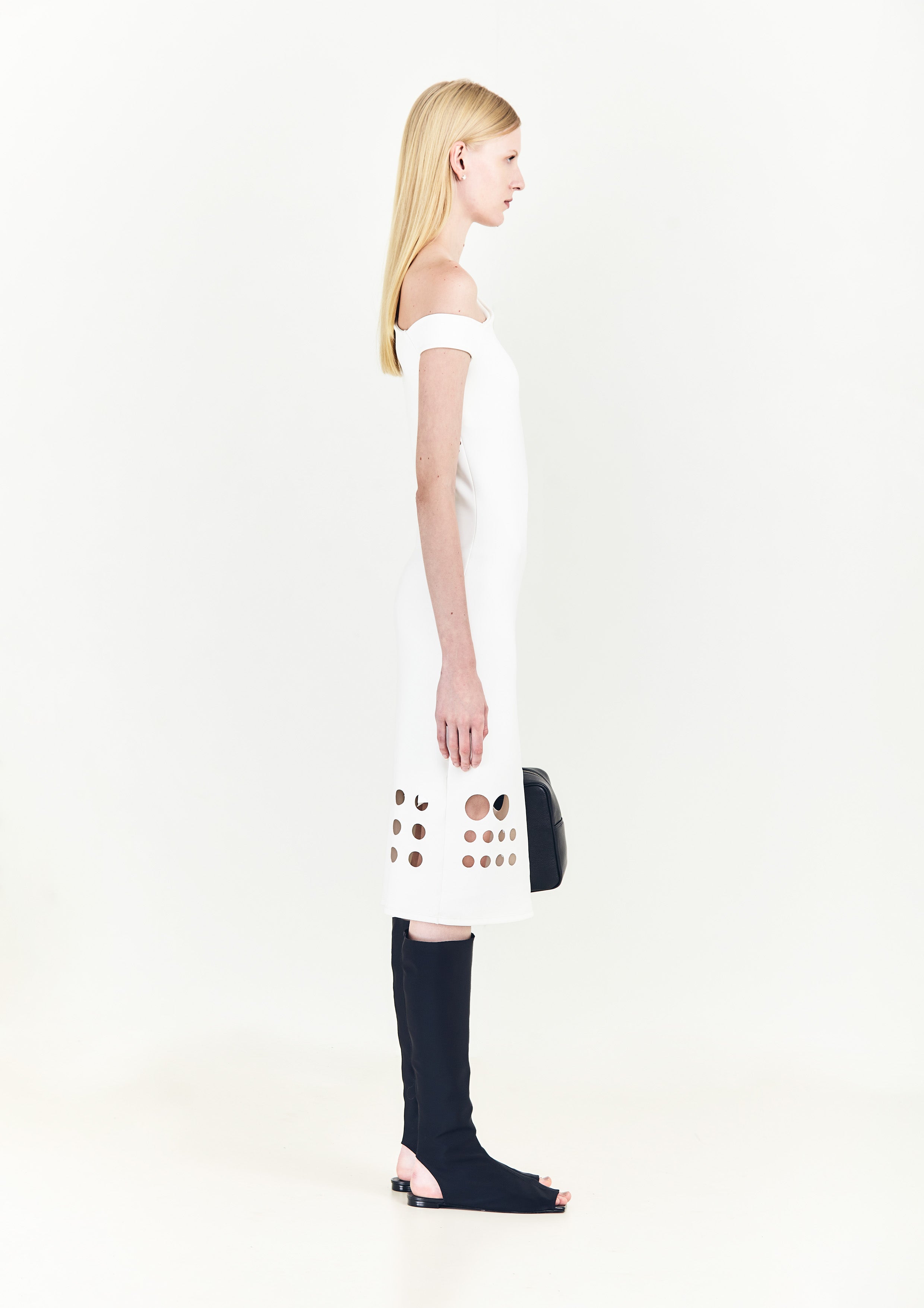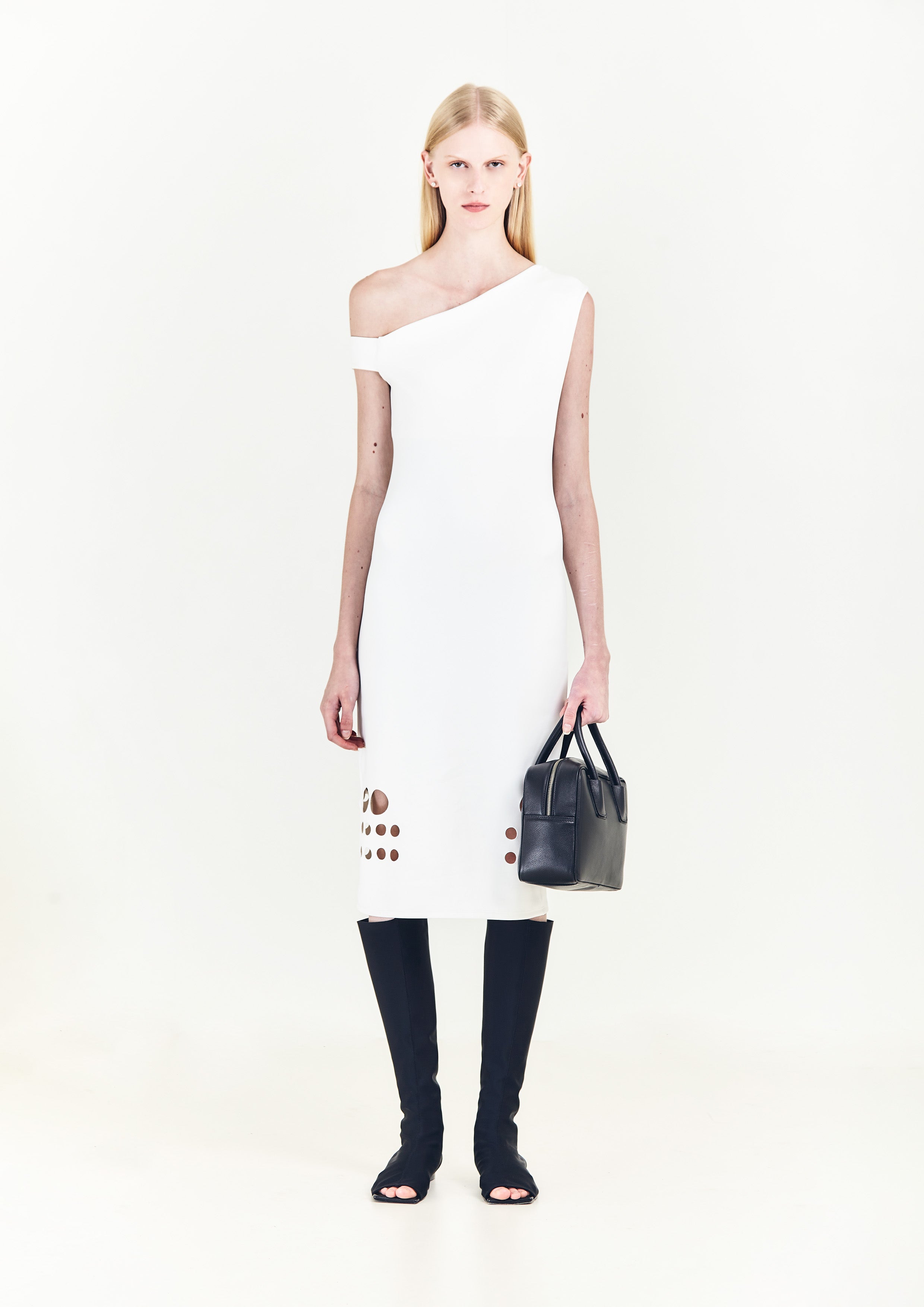 Vestido Feito em Malha, com um ombro só e detalhe de faixa em um dos braços , barra com bolas recortadas.