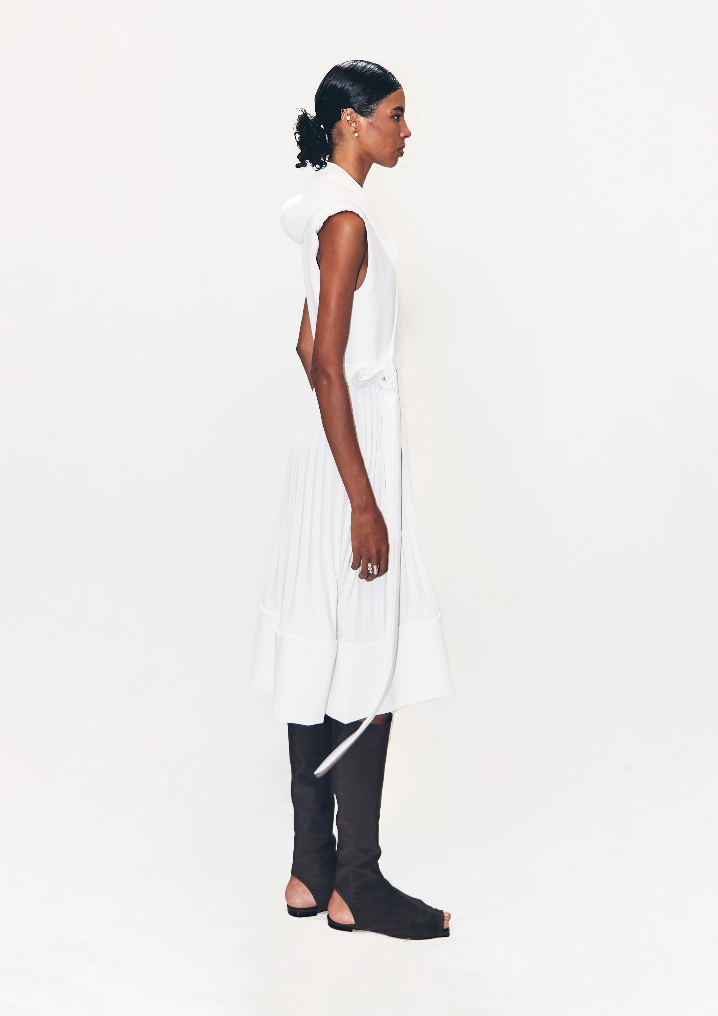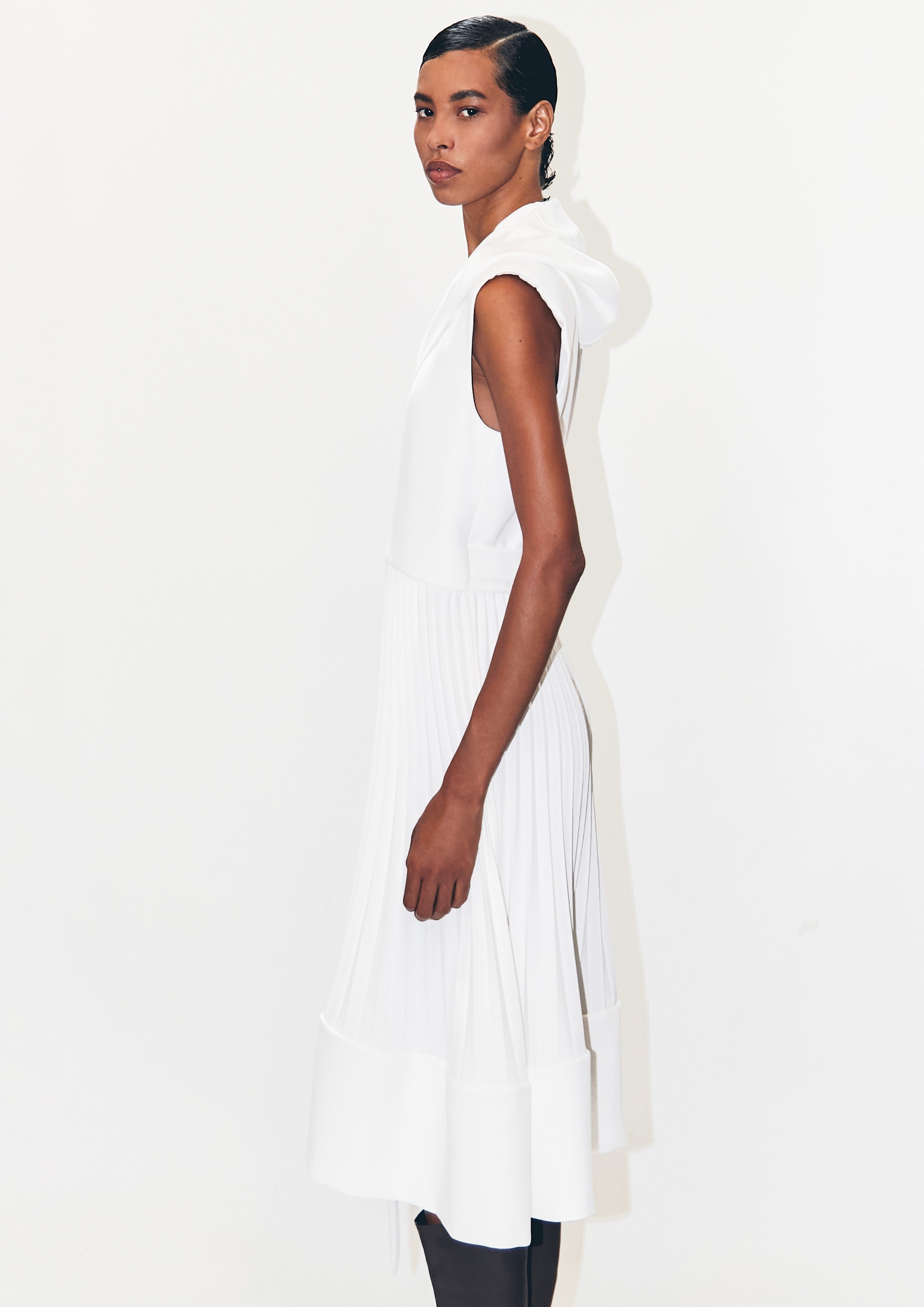 Vestido curto de crepe, com capuz, a saia é plissada com barrado liso.