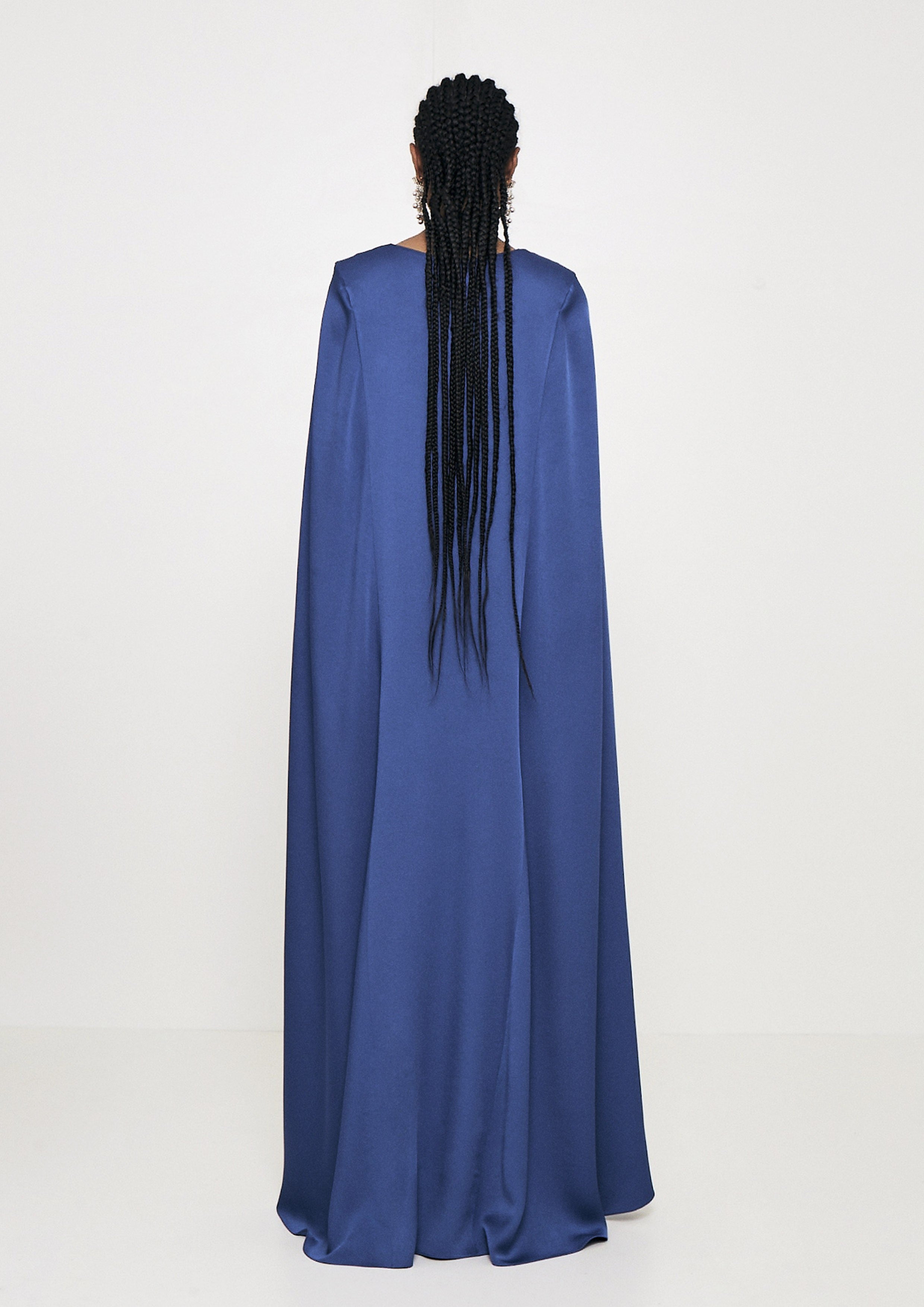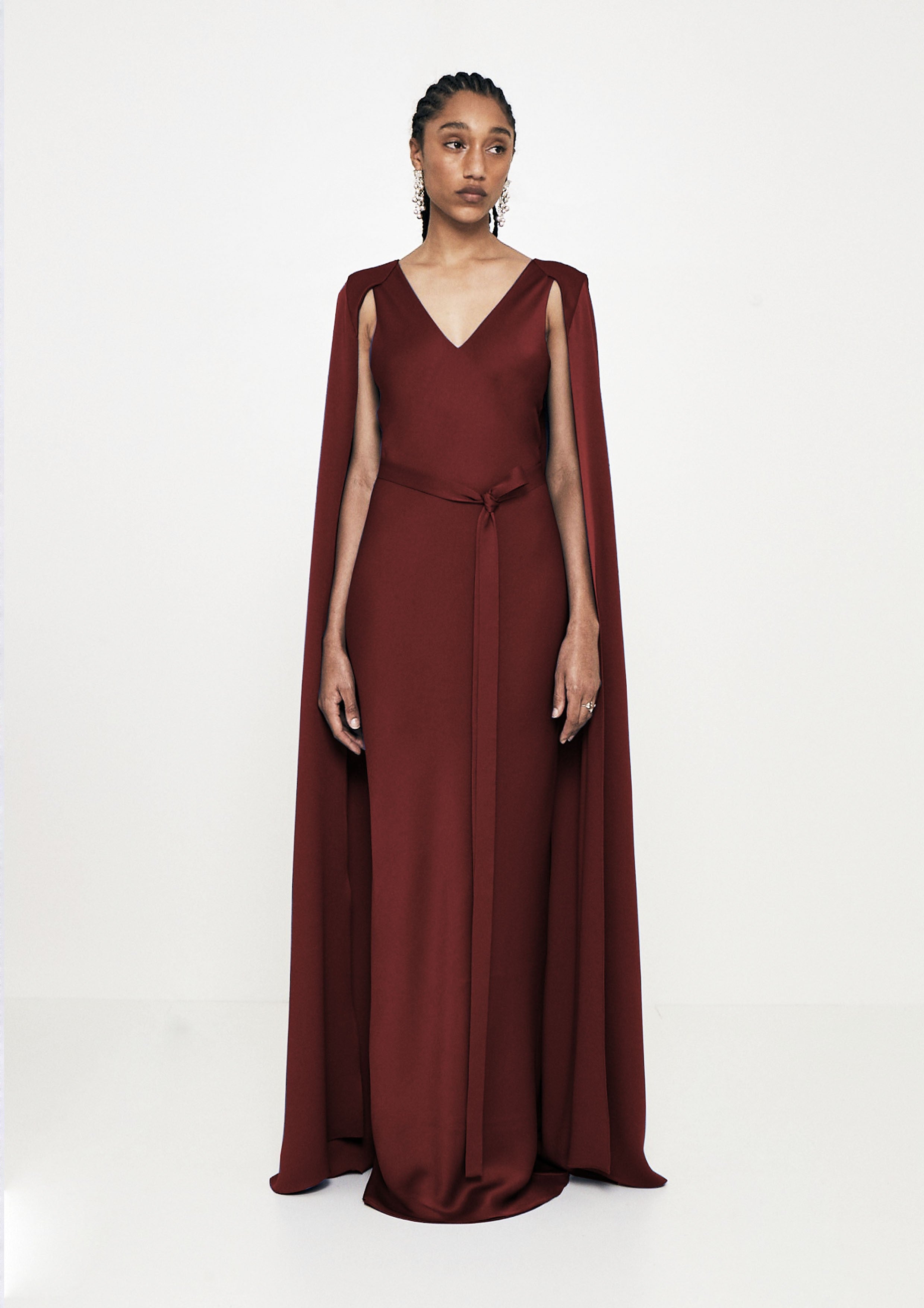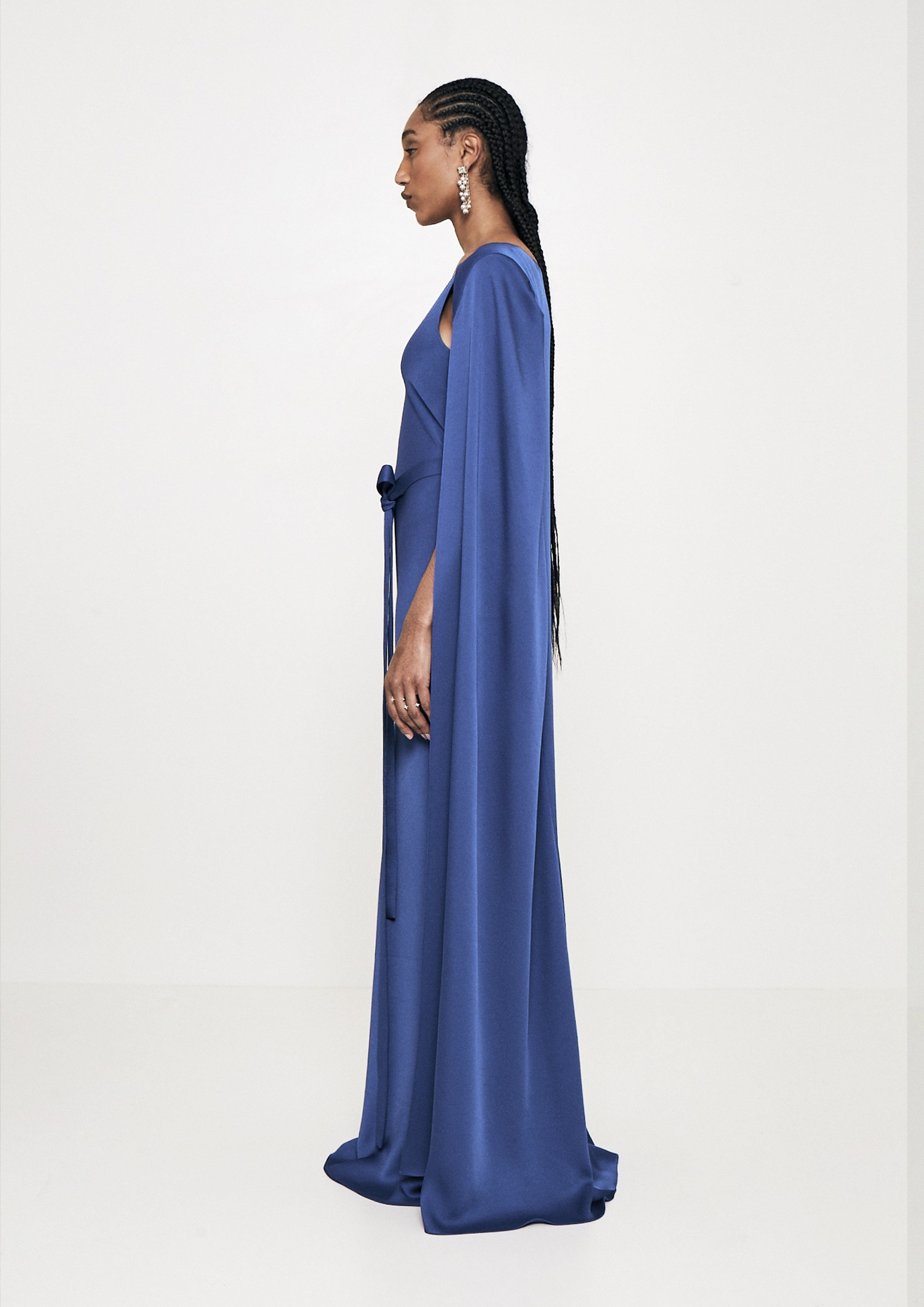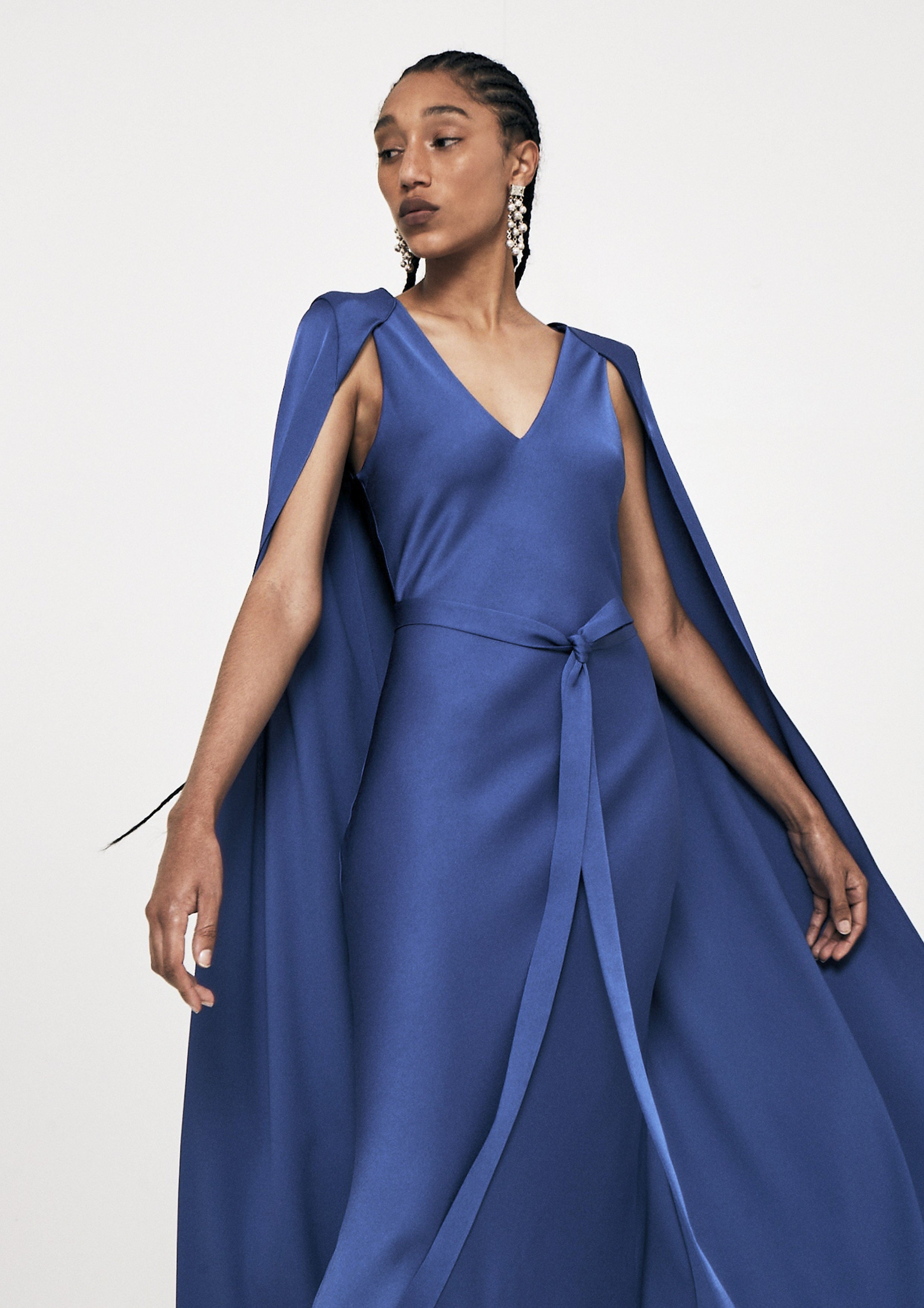 O modelo apresenta uma capa longa que adiciona um toque de sofisticação e movimento ao vestido. Além disso, a faixa a região da cintura permite ajustar a peça conforme sua preferencia, proporcionando um encaixe perfeito e ressaltando a silhueta de forma elegante.