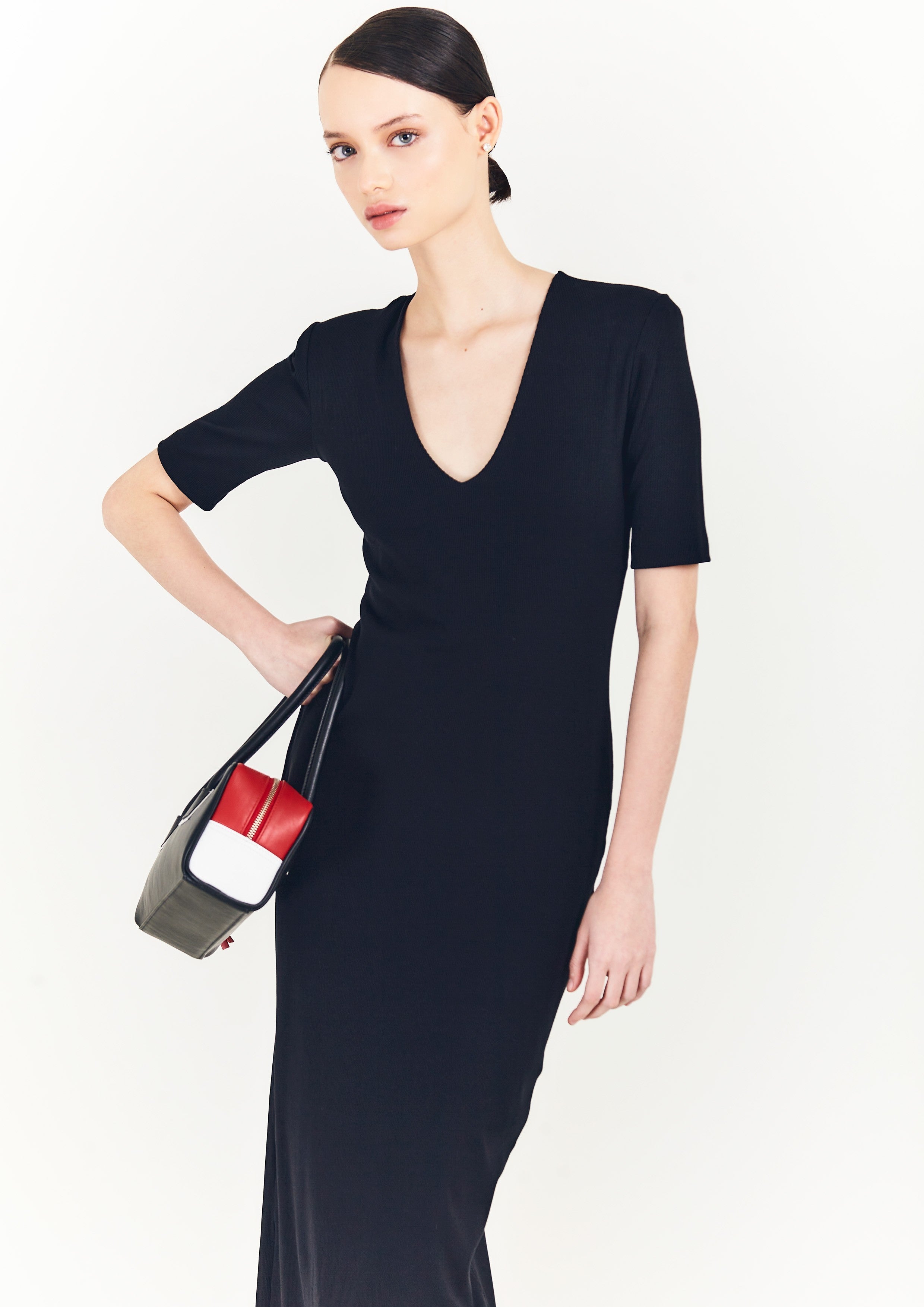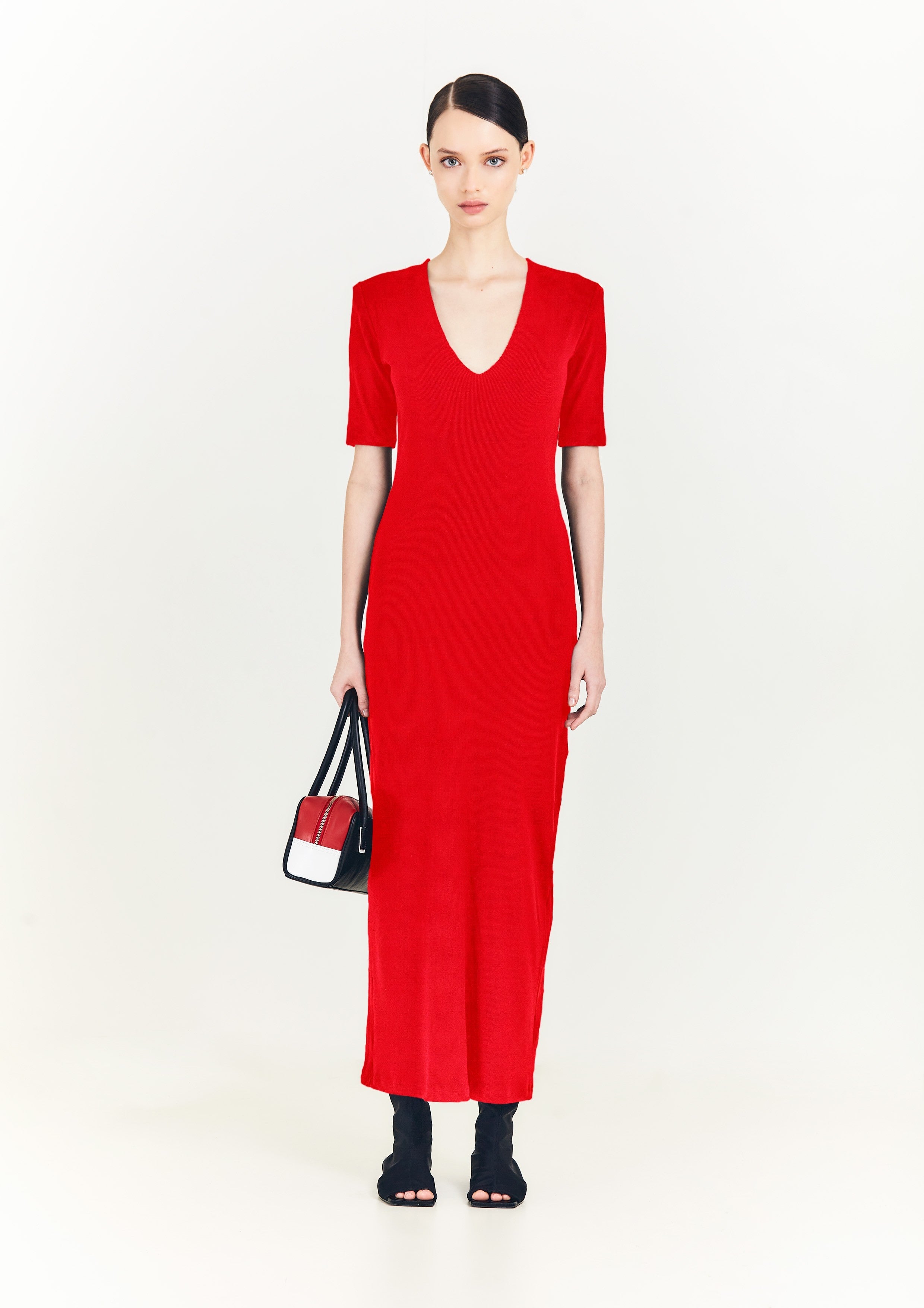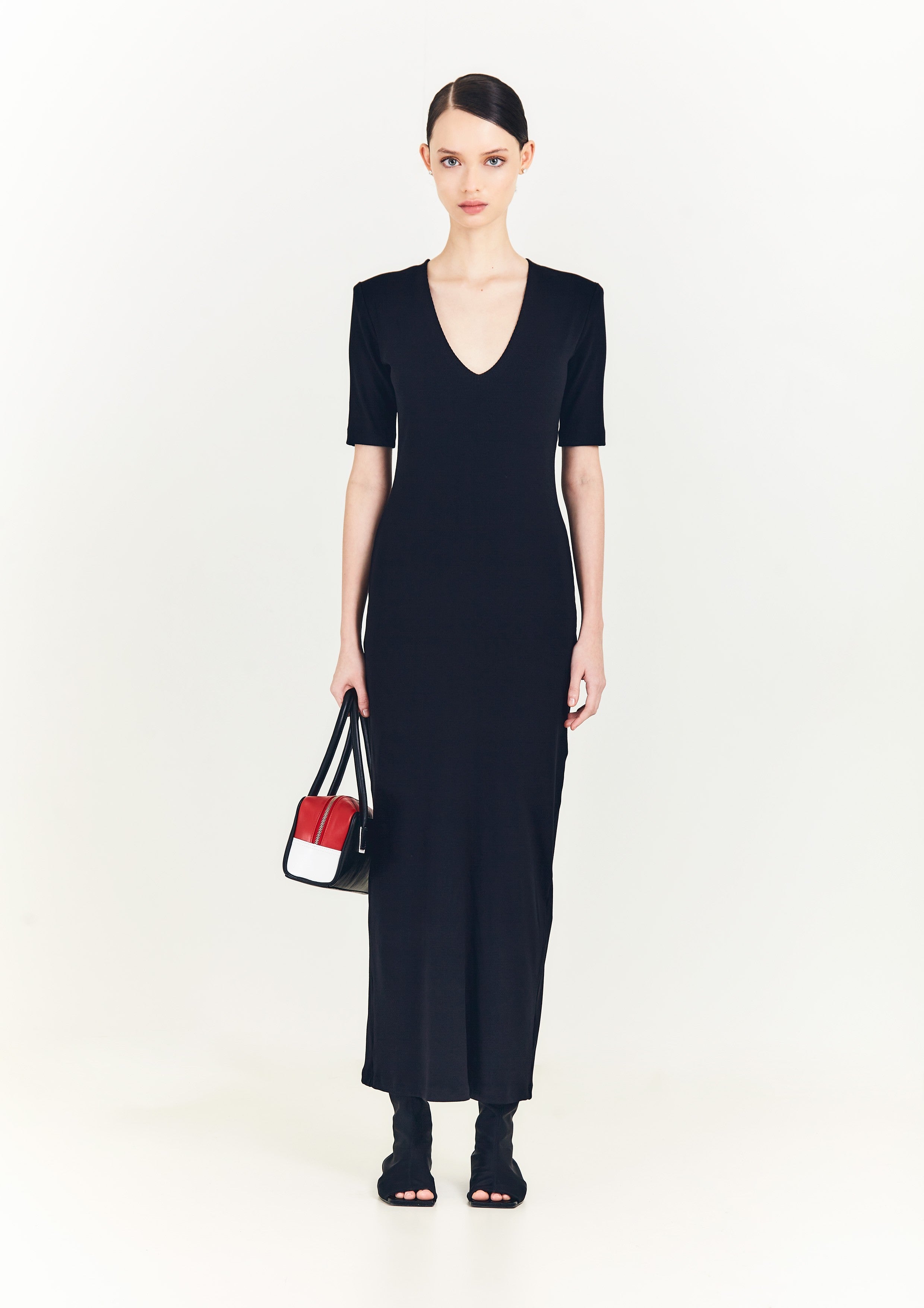 Vestido longo de malha, com decote V profundo e ombreiras.