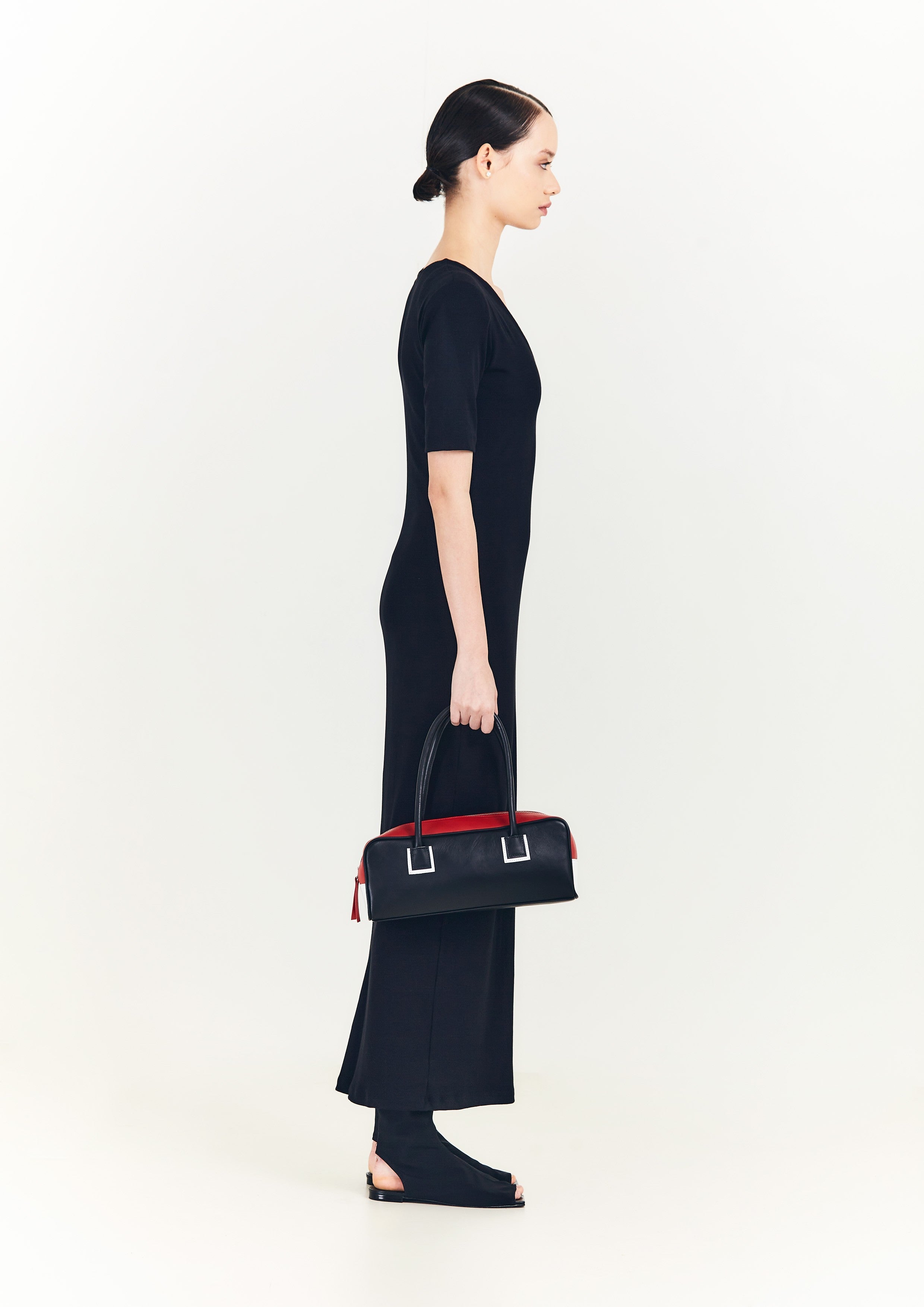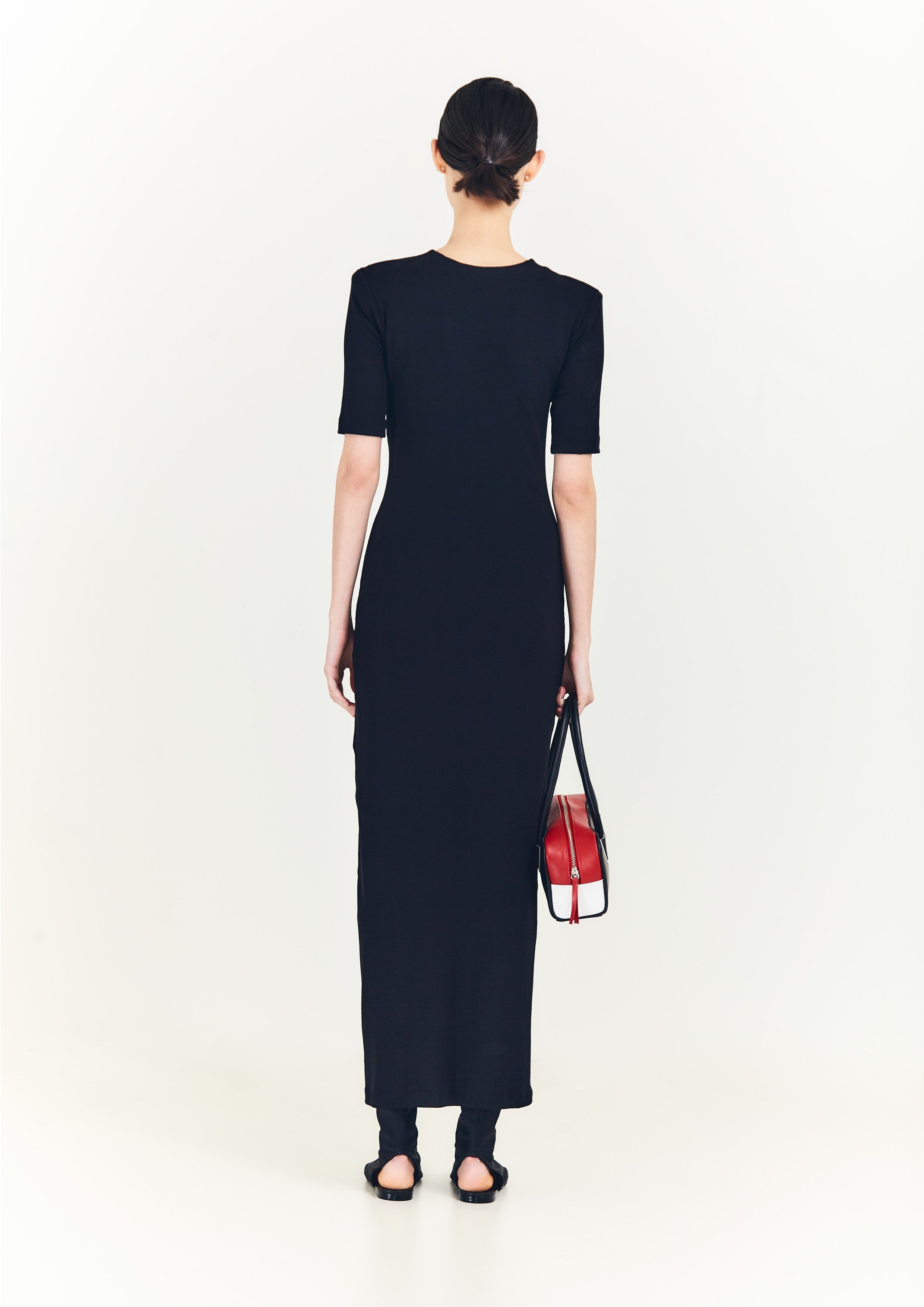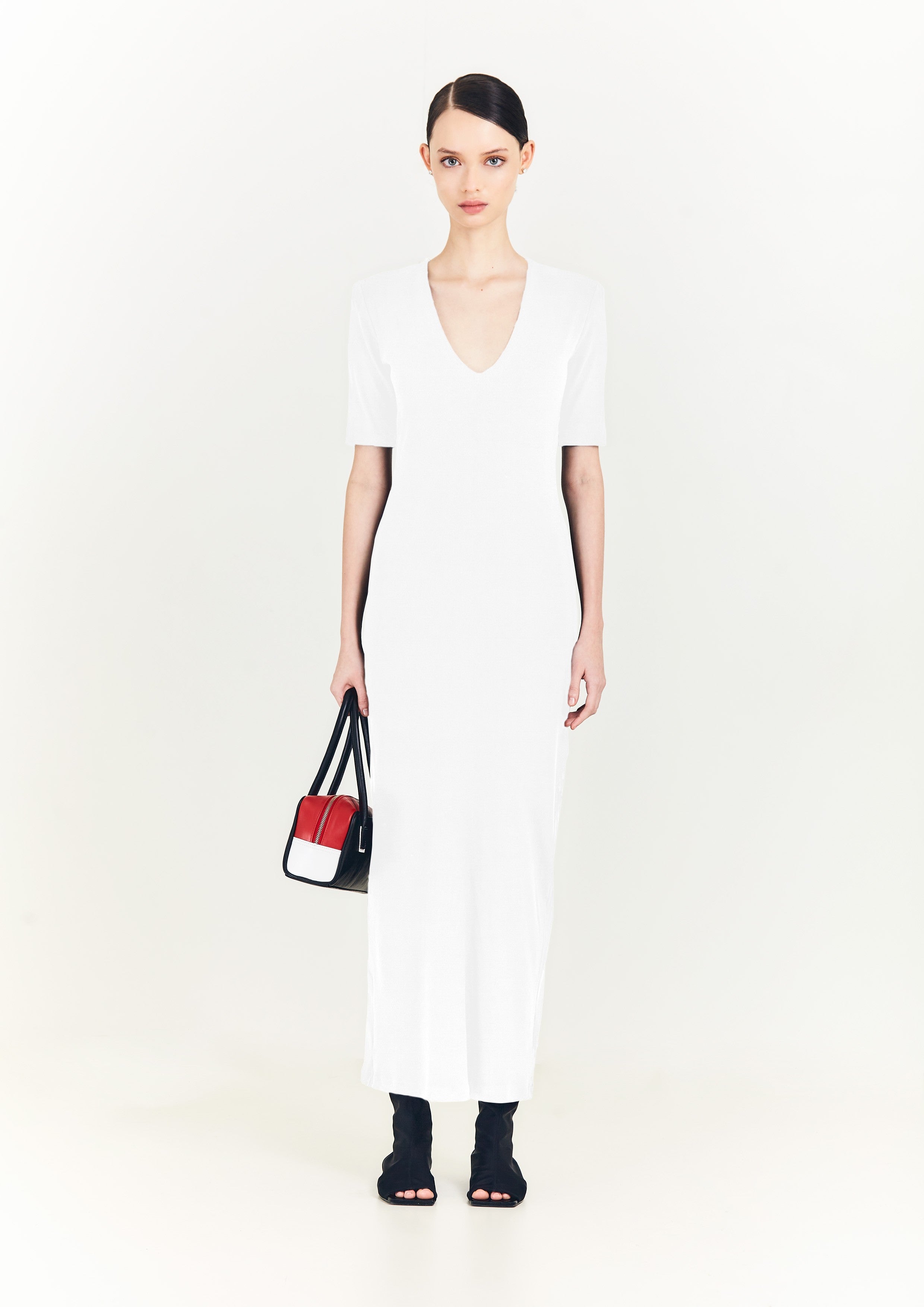 Vestido longo de malha, com decote V profundo e ombreiras.