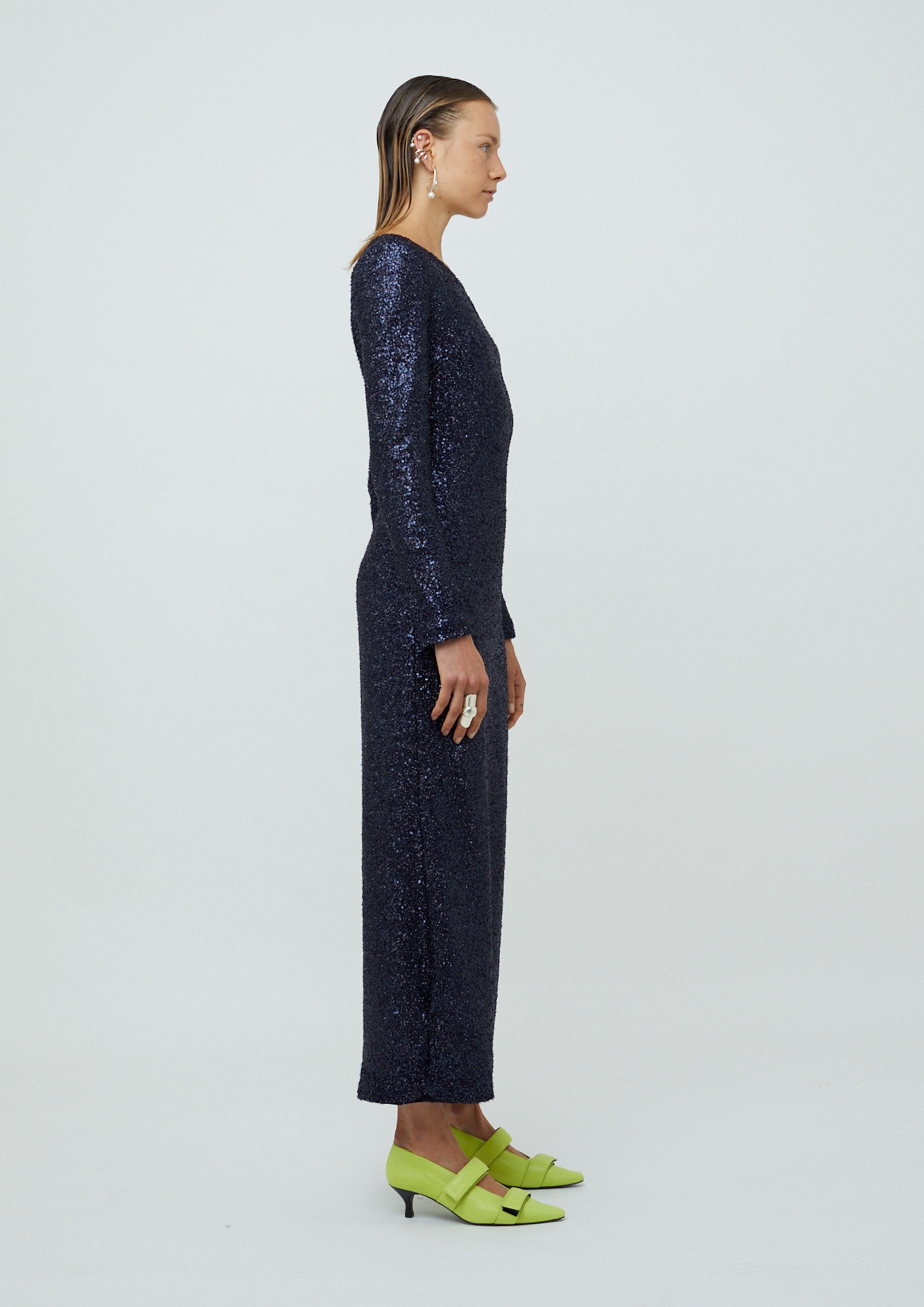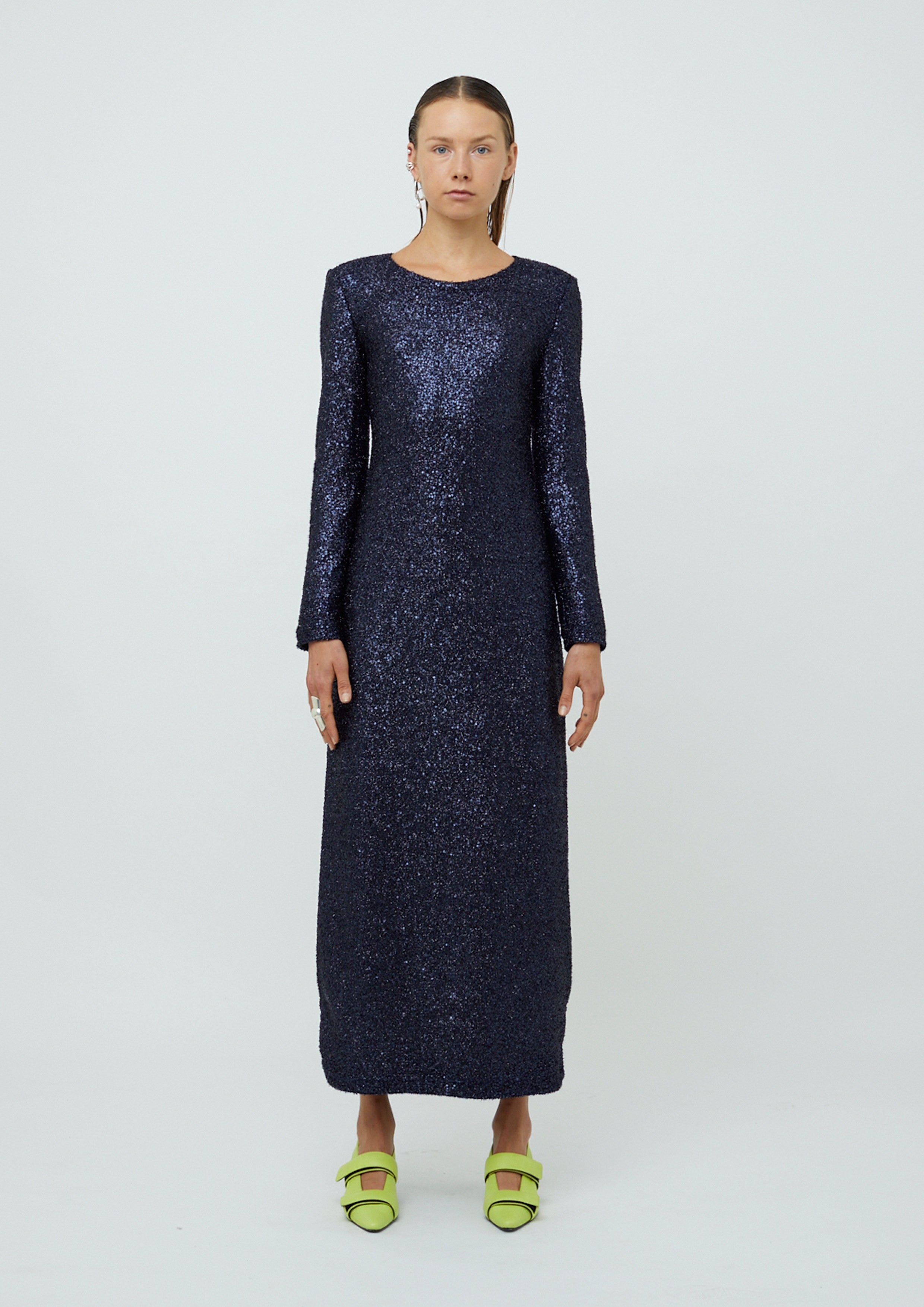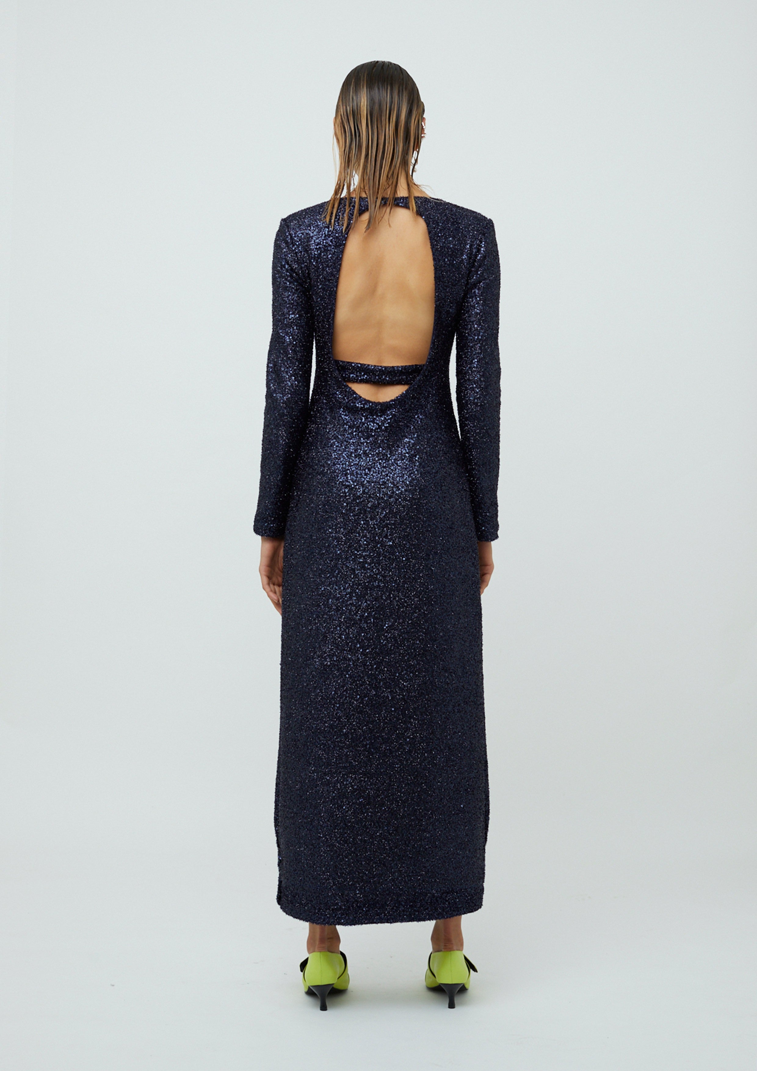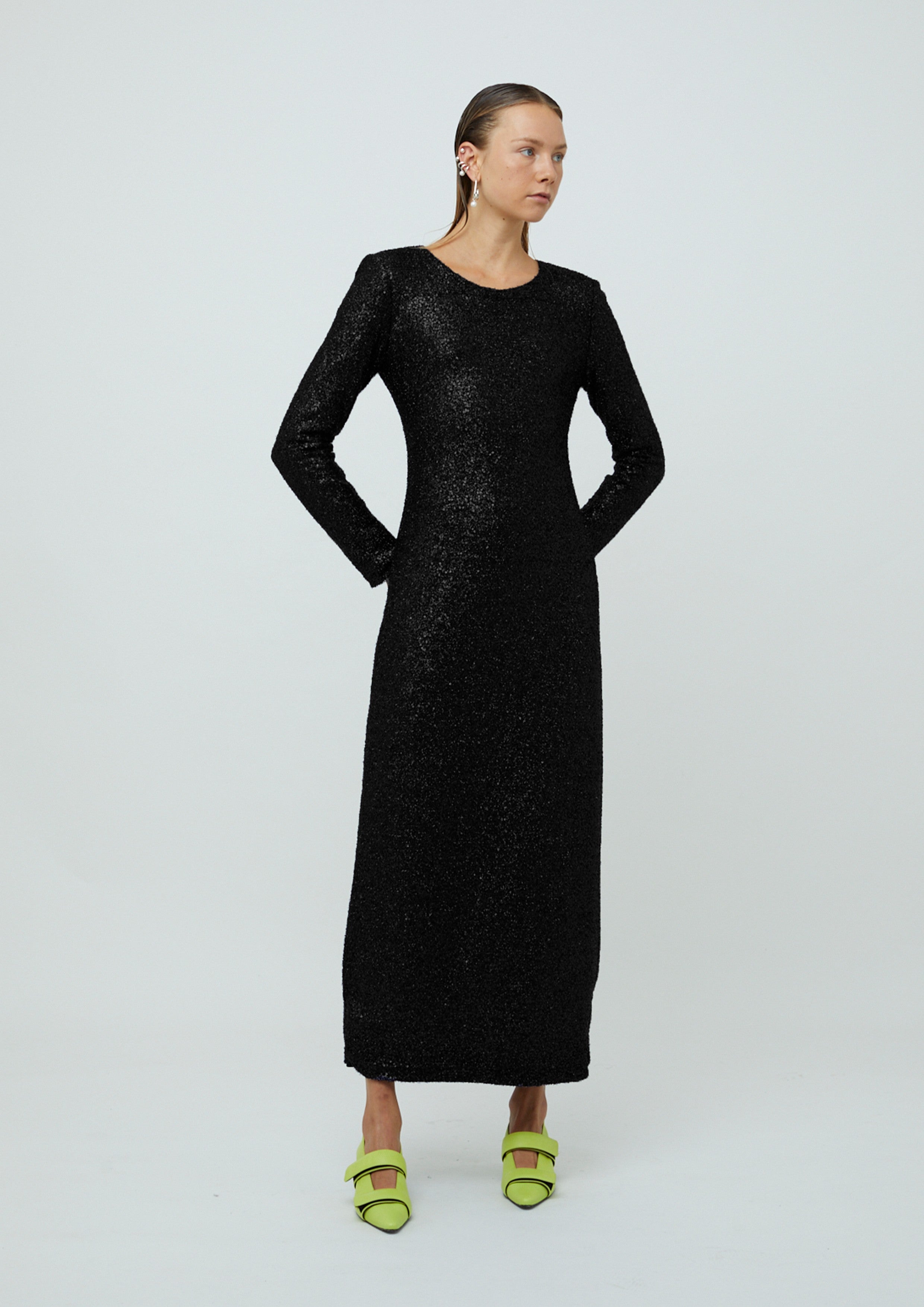 Vestido longo de paetê com mangas compridas e decote arredondado nas costas.