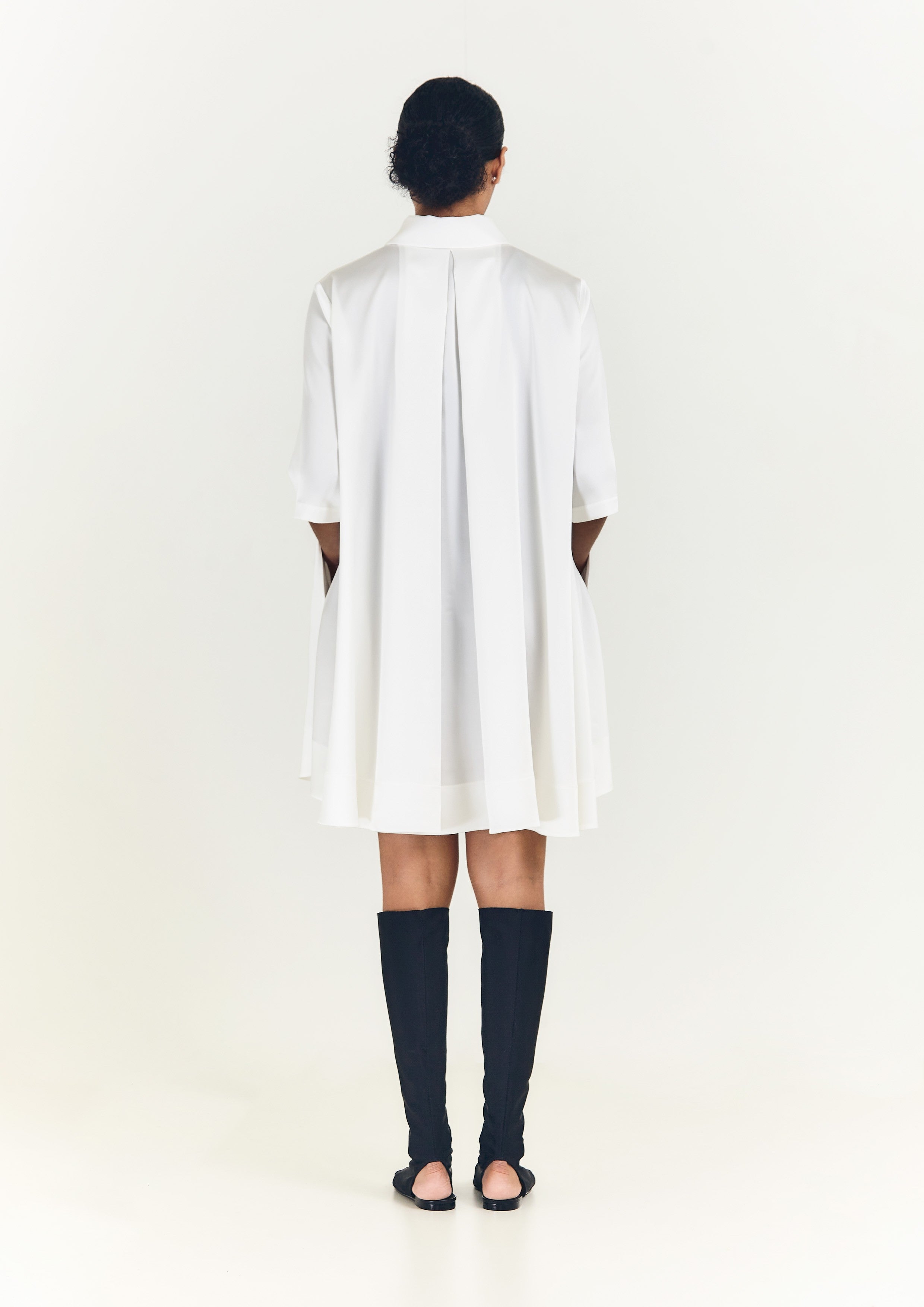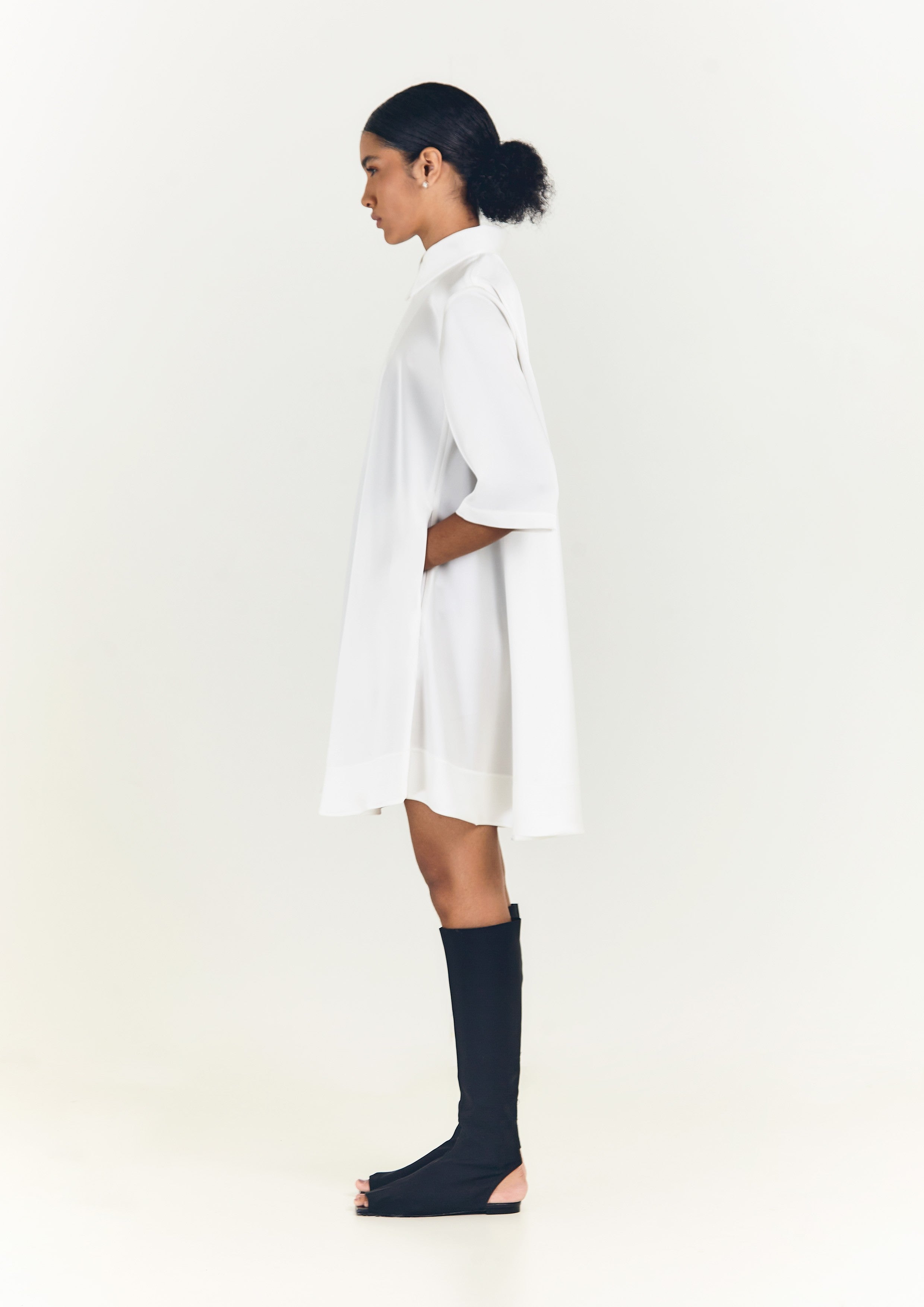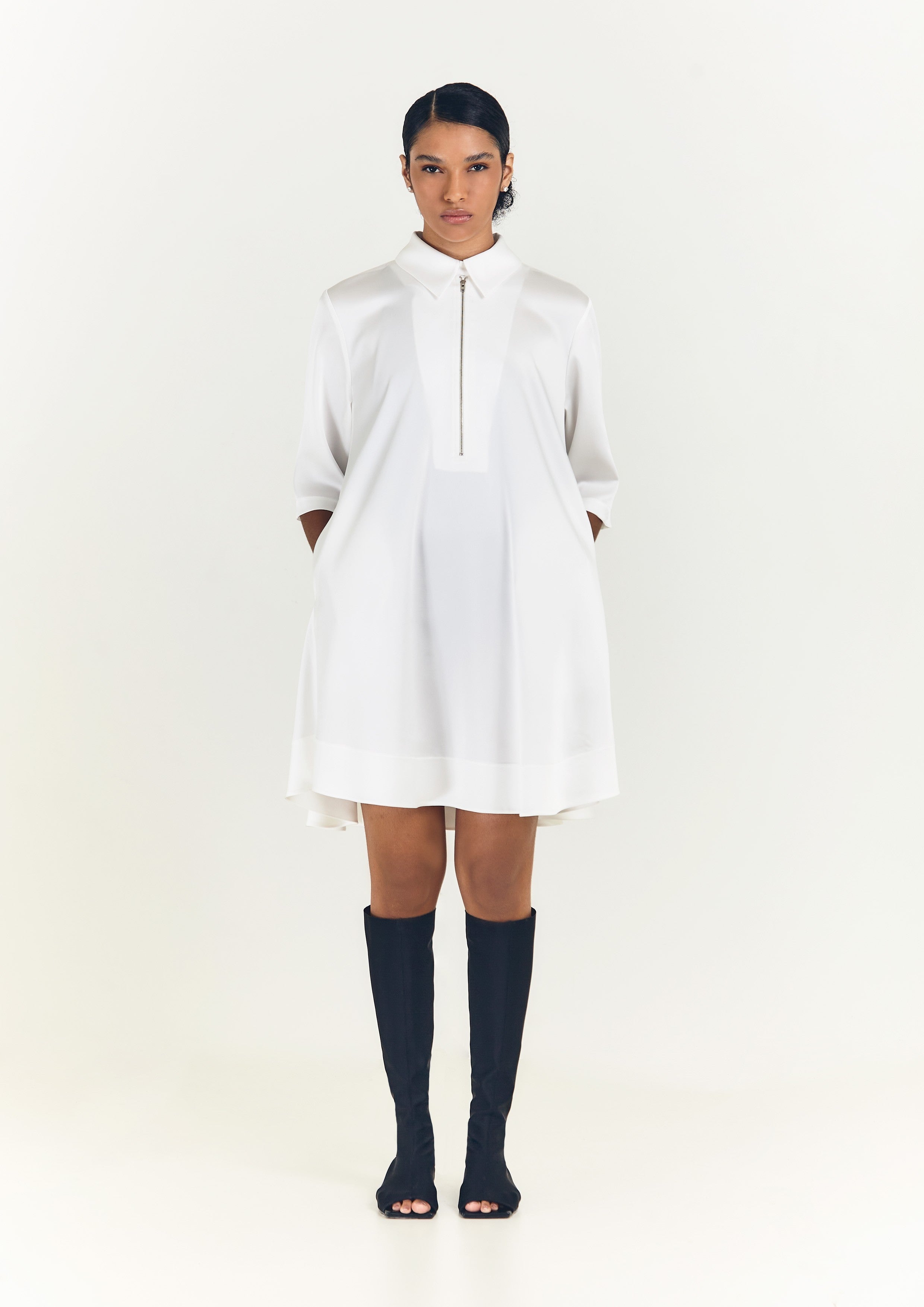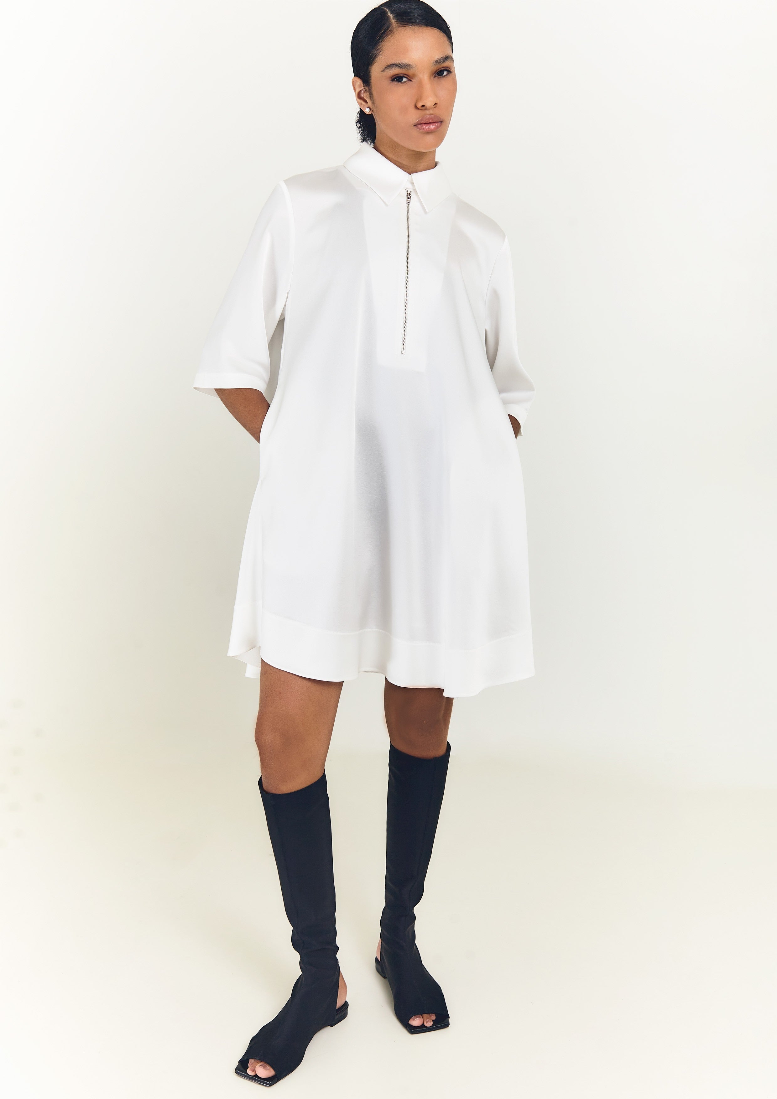 Vestido curto evasê de crepe, com gola polo, e bolsos.