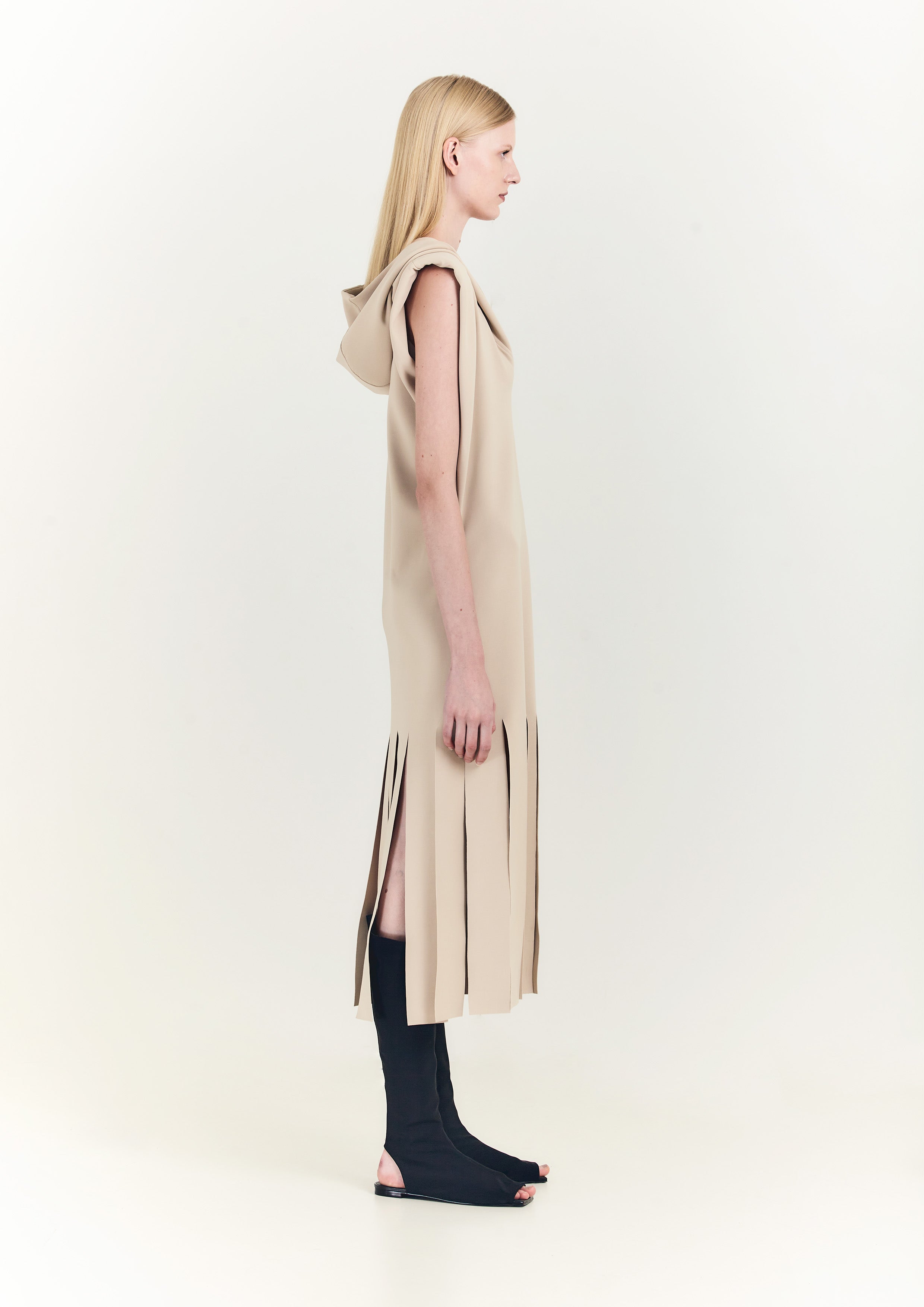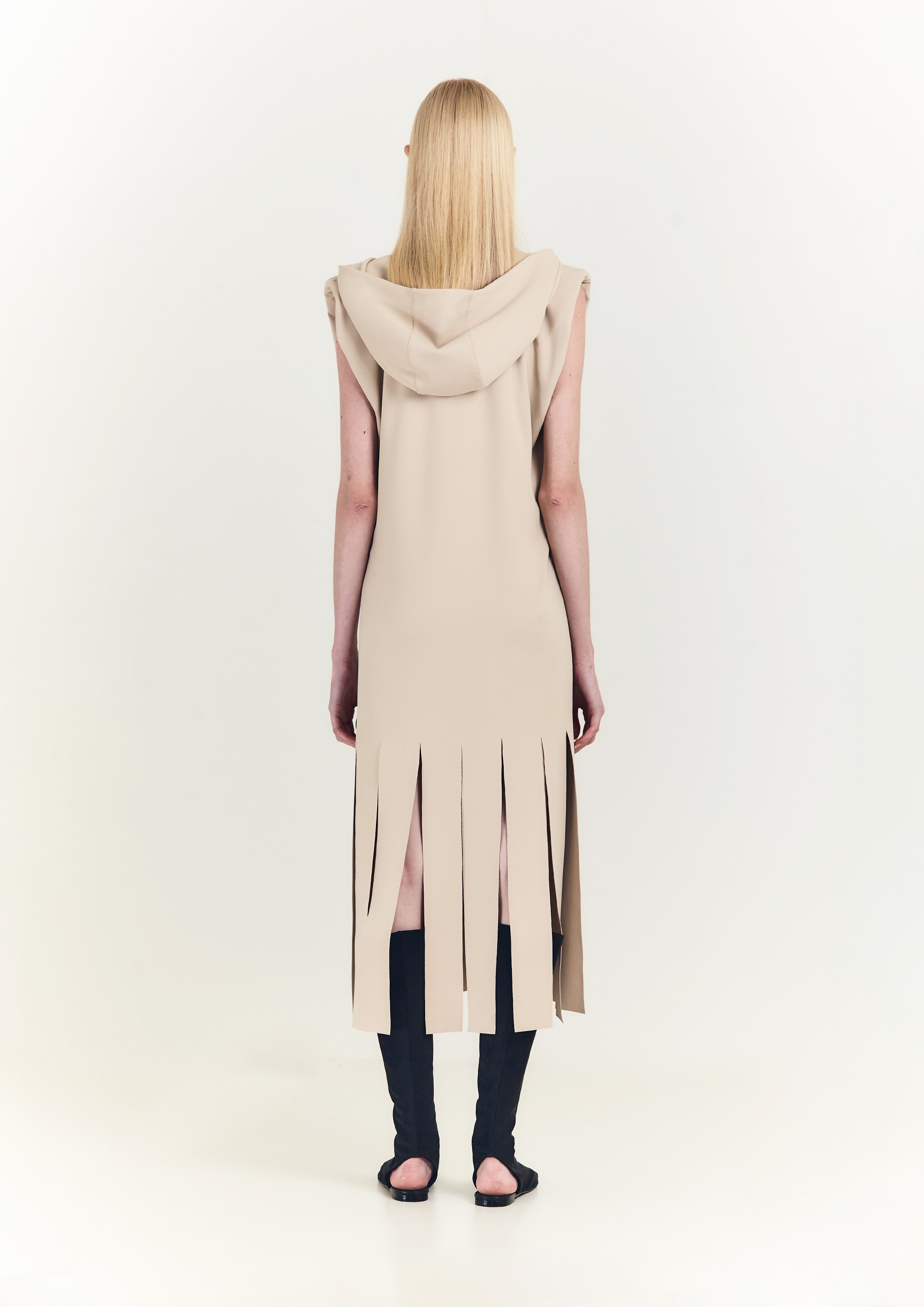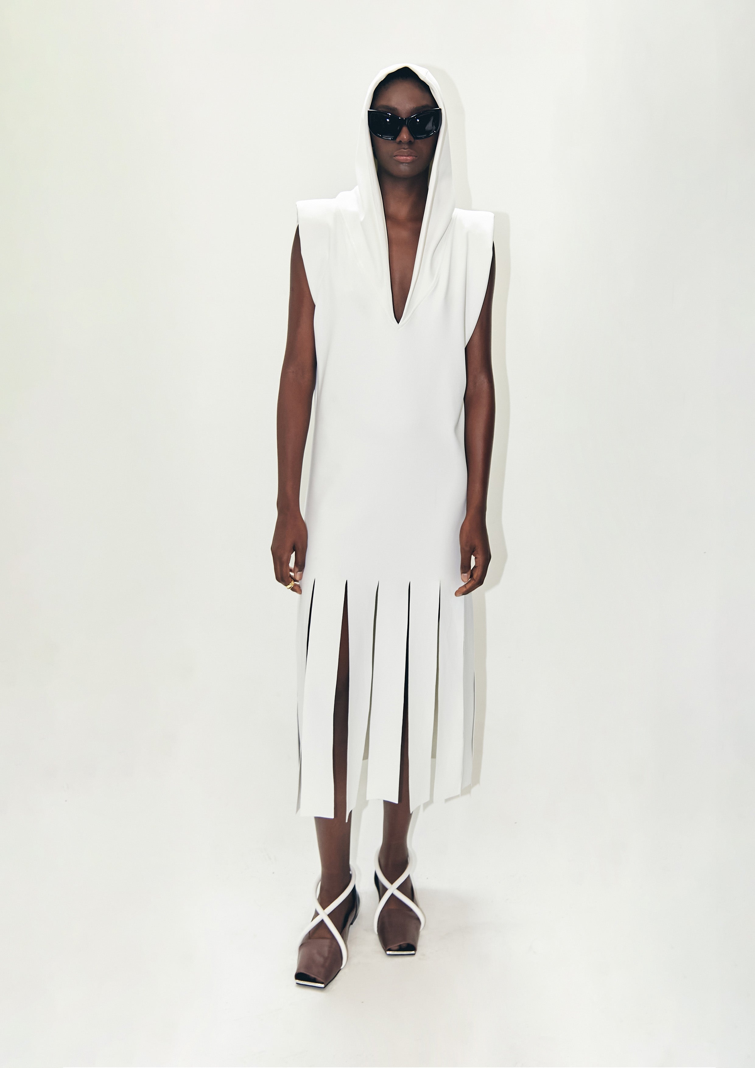 Vestido feito em Malha, com decote em v que encaixa em um capuz, ombros amplos com ombreiras, detalhe de franjas na barra.