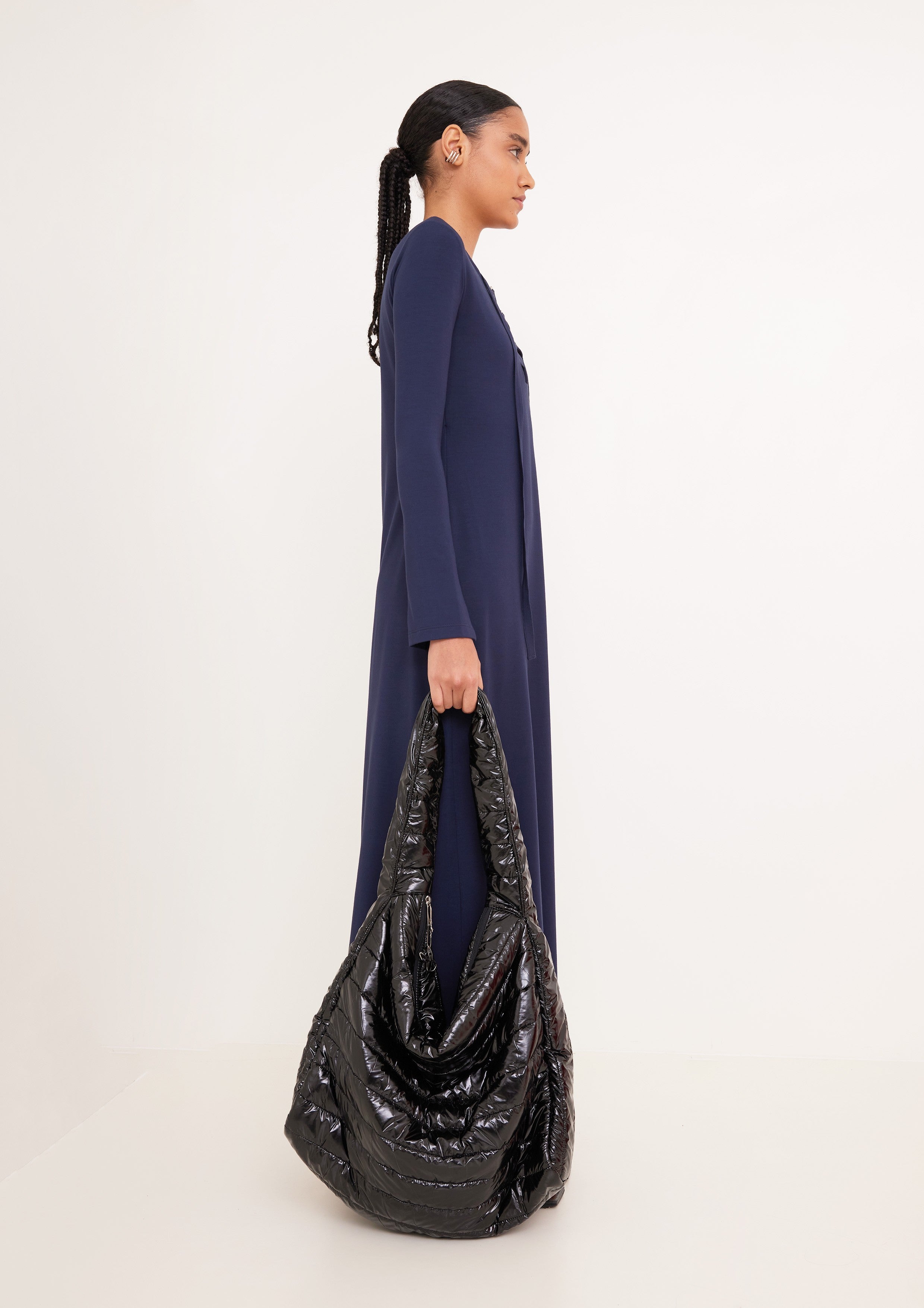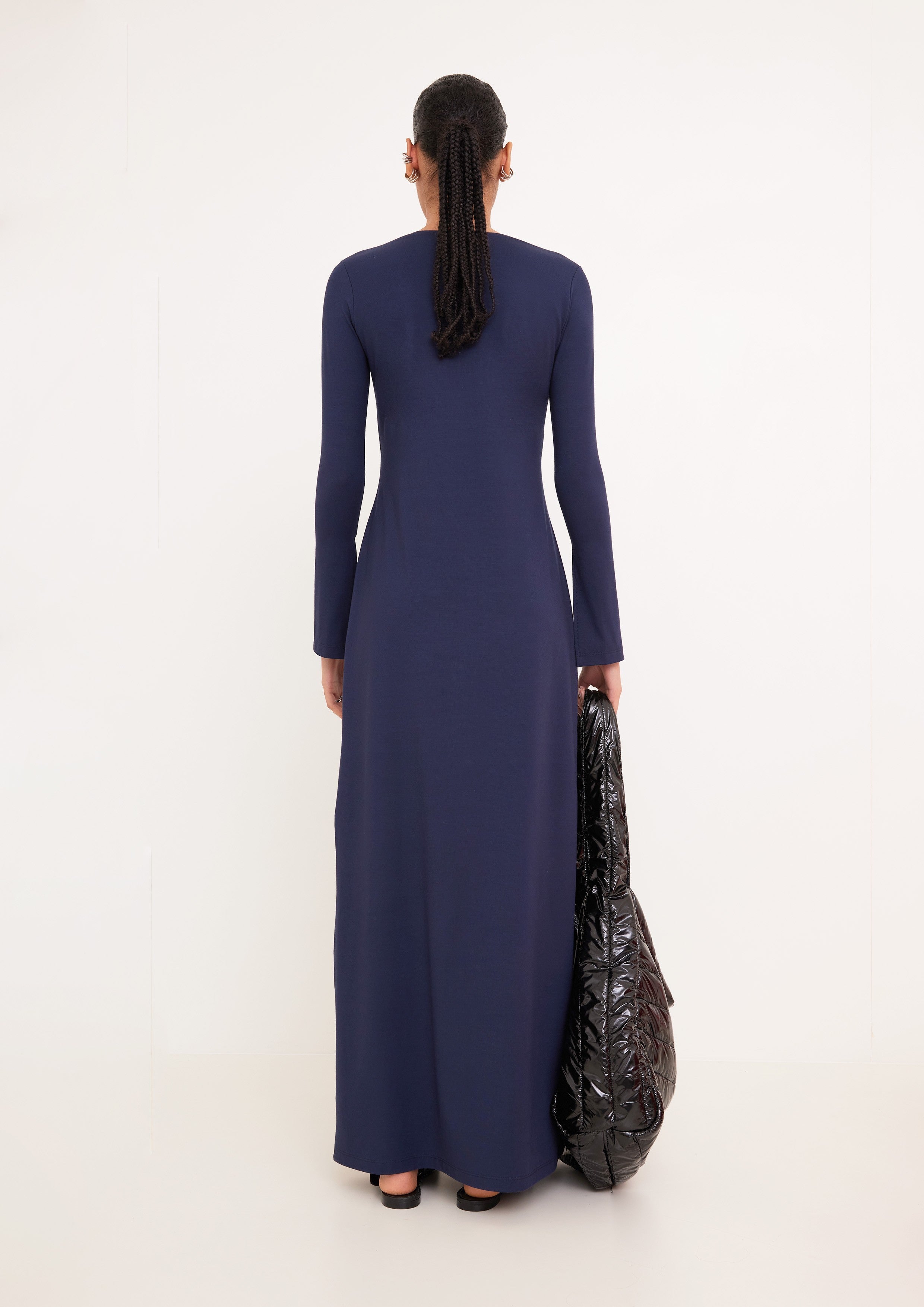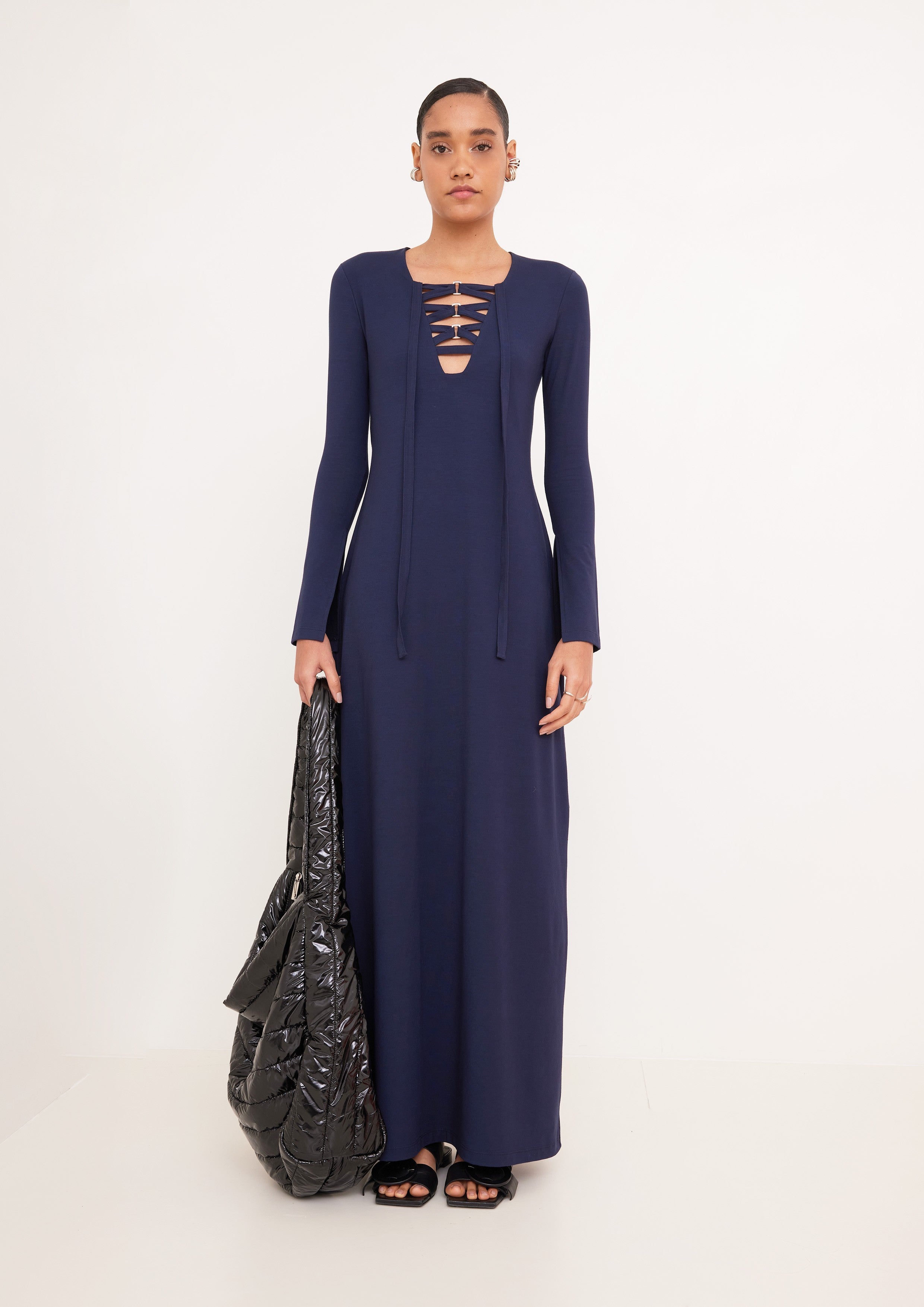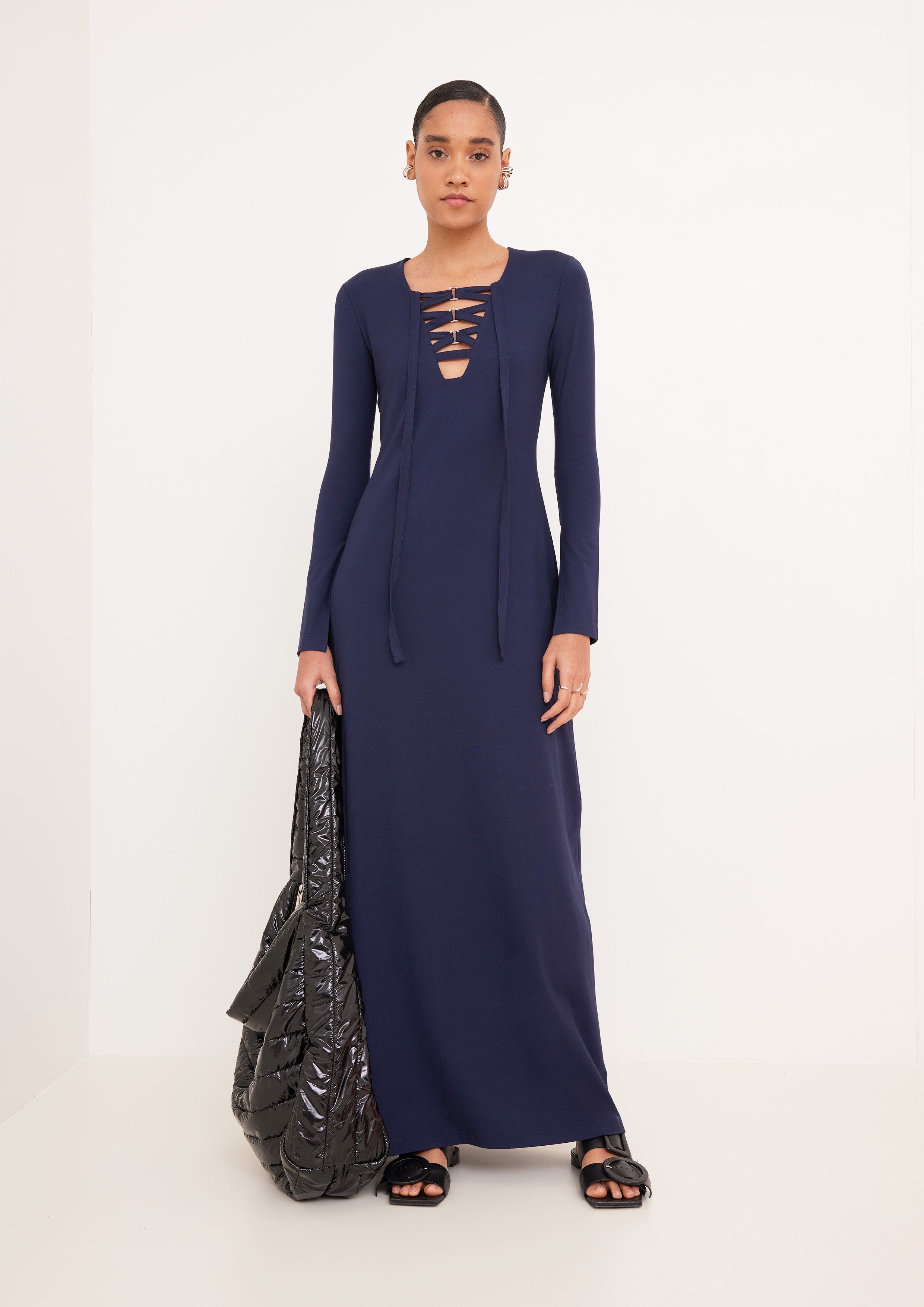 Vestido acinturado com comprimento e mangas longas. Possui decote V com detalhe de fita transpassada e fivelas.