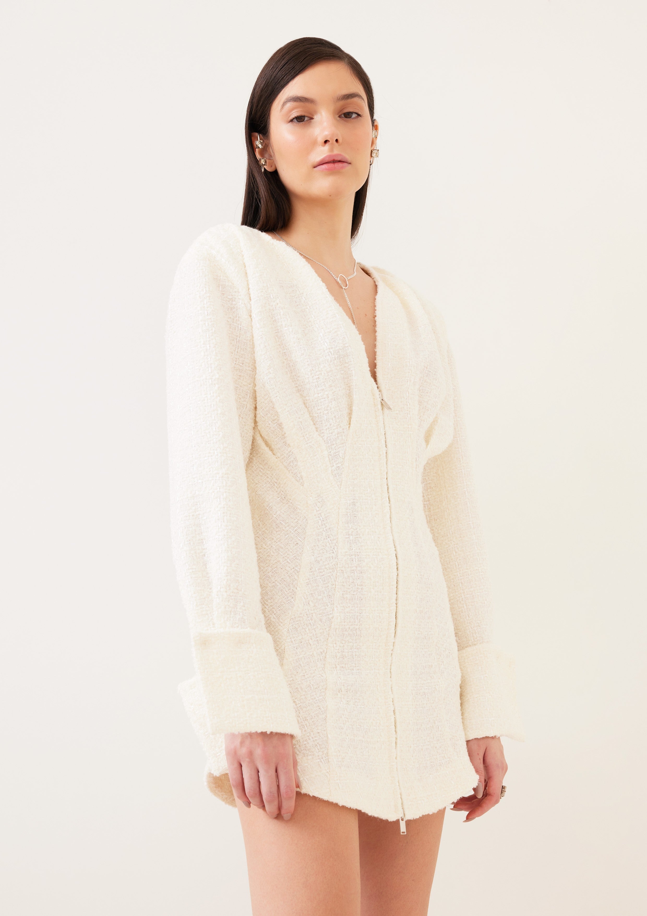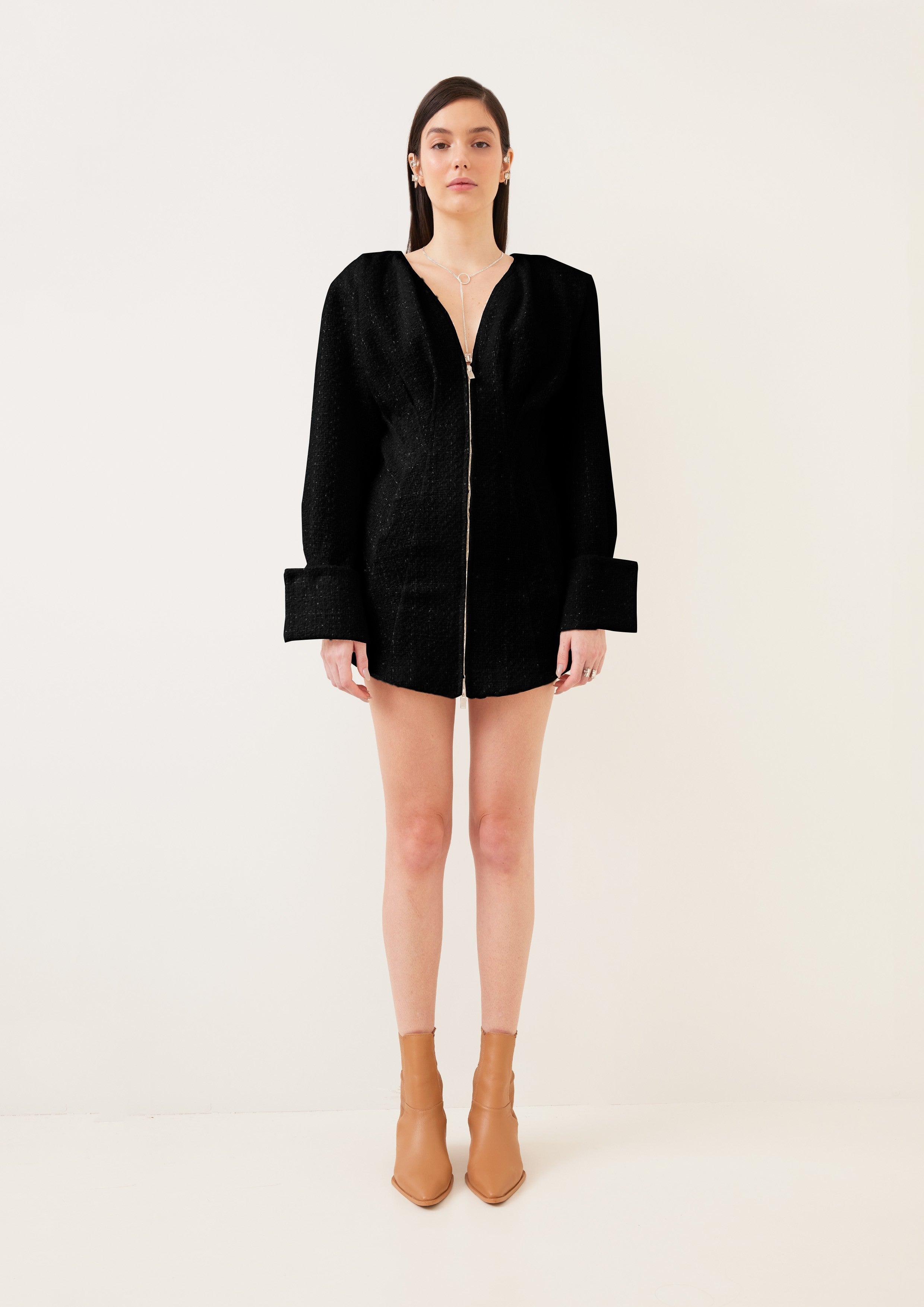 Vestido jaqueta de tweed com mangas compridas, decote V e fecho frontal em zíper.