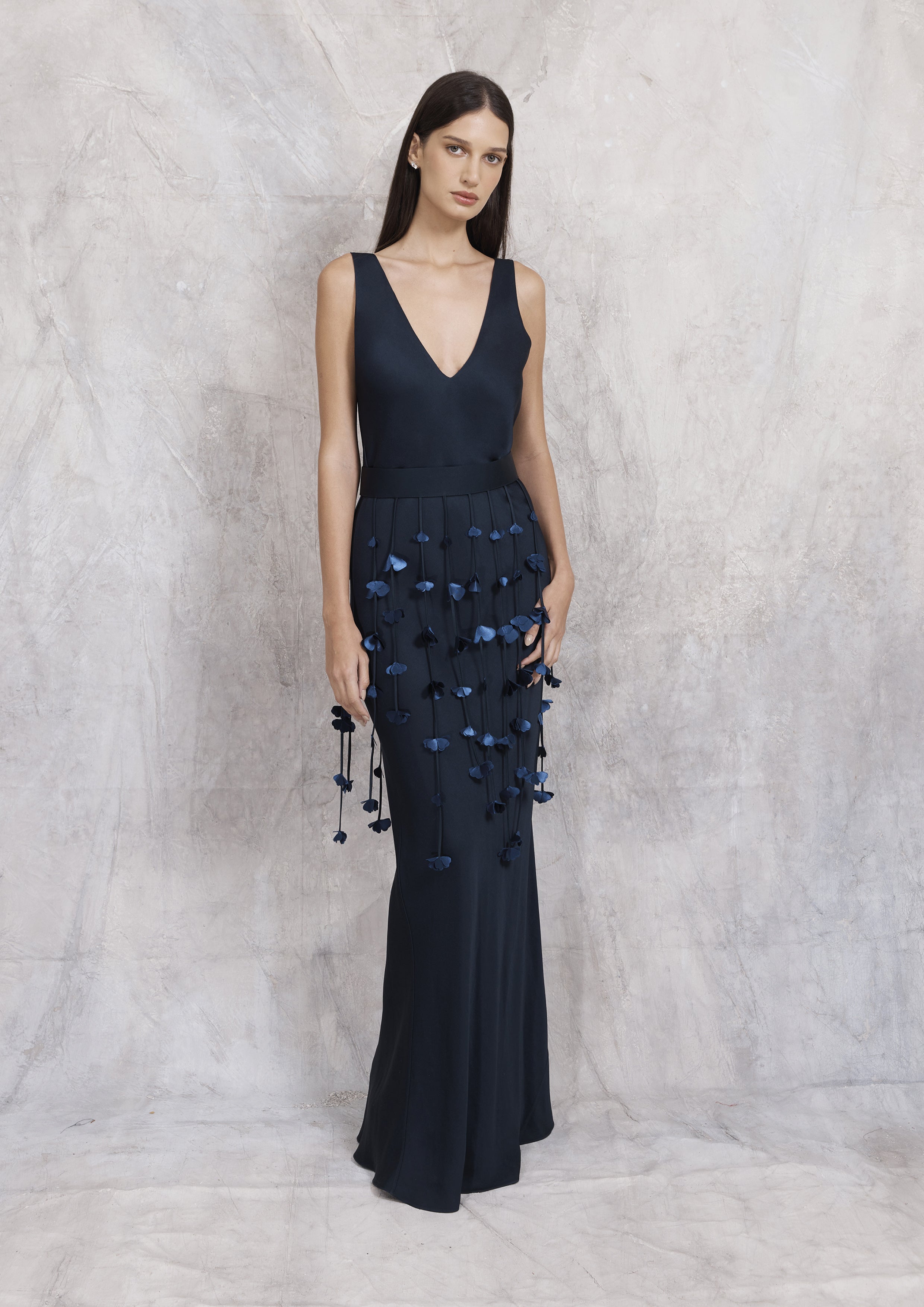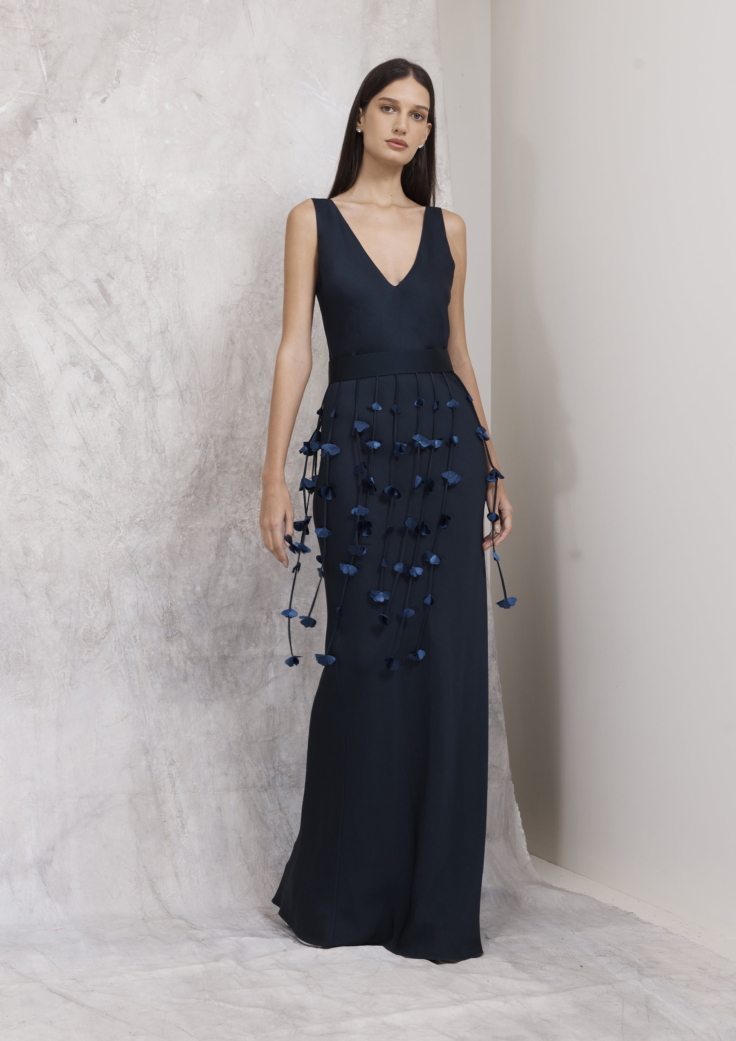 O detalhe do laço lateral confere um toque de delicadeza contemporânea, enquanto o comprimento alongado cria uma presença marcante e refinada. Ideal para eventos formais ou ocasiões especiais que pedem uma estética minimalista e sofisticada.