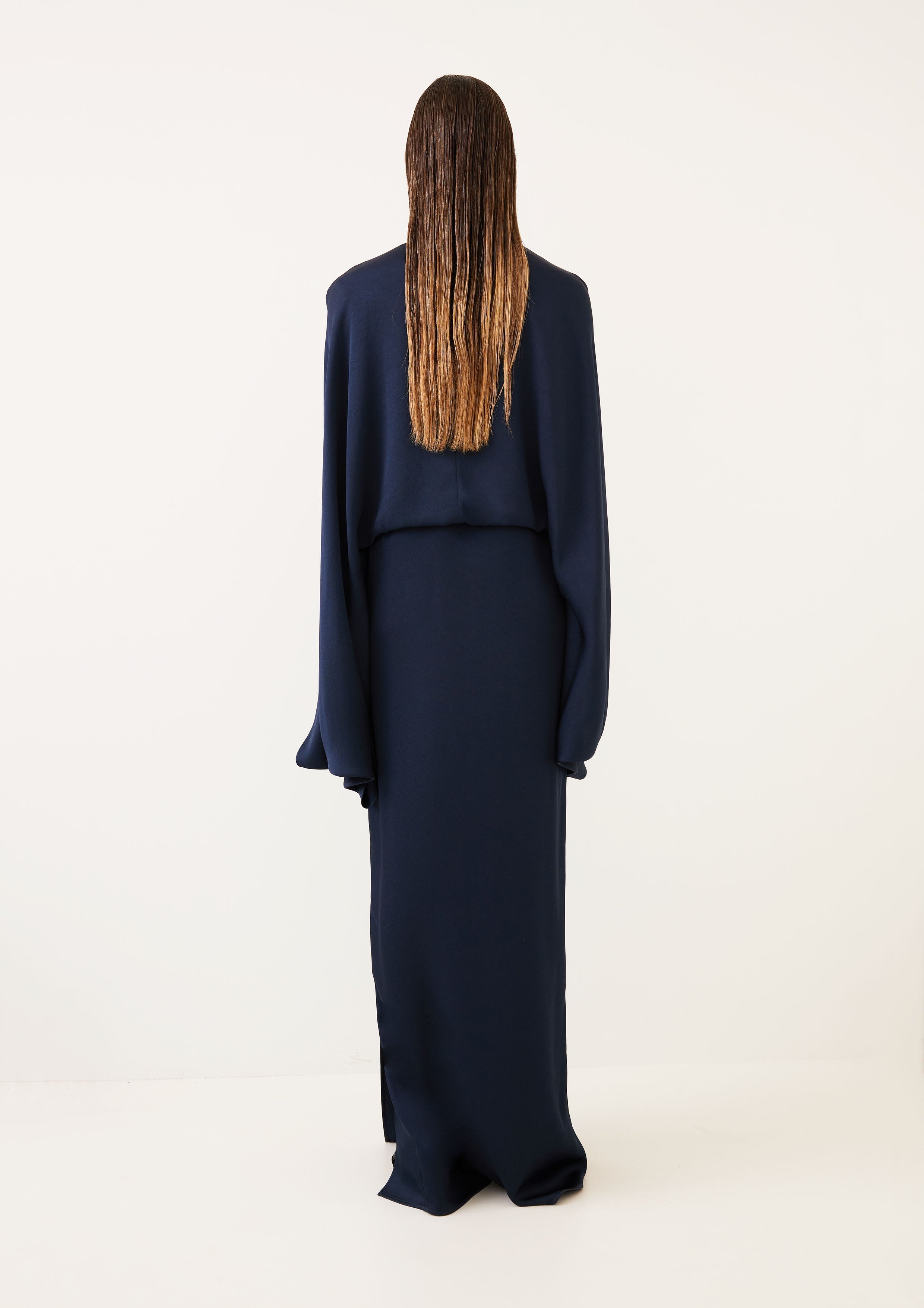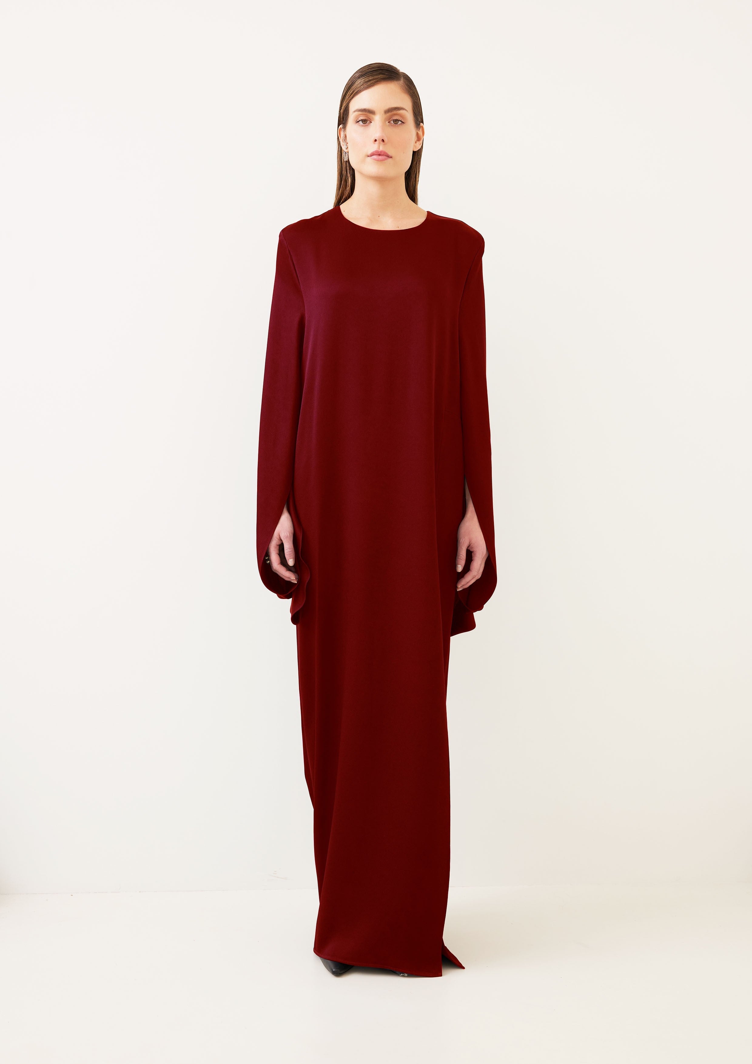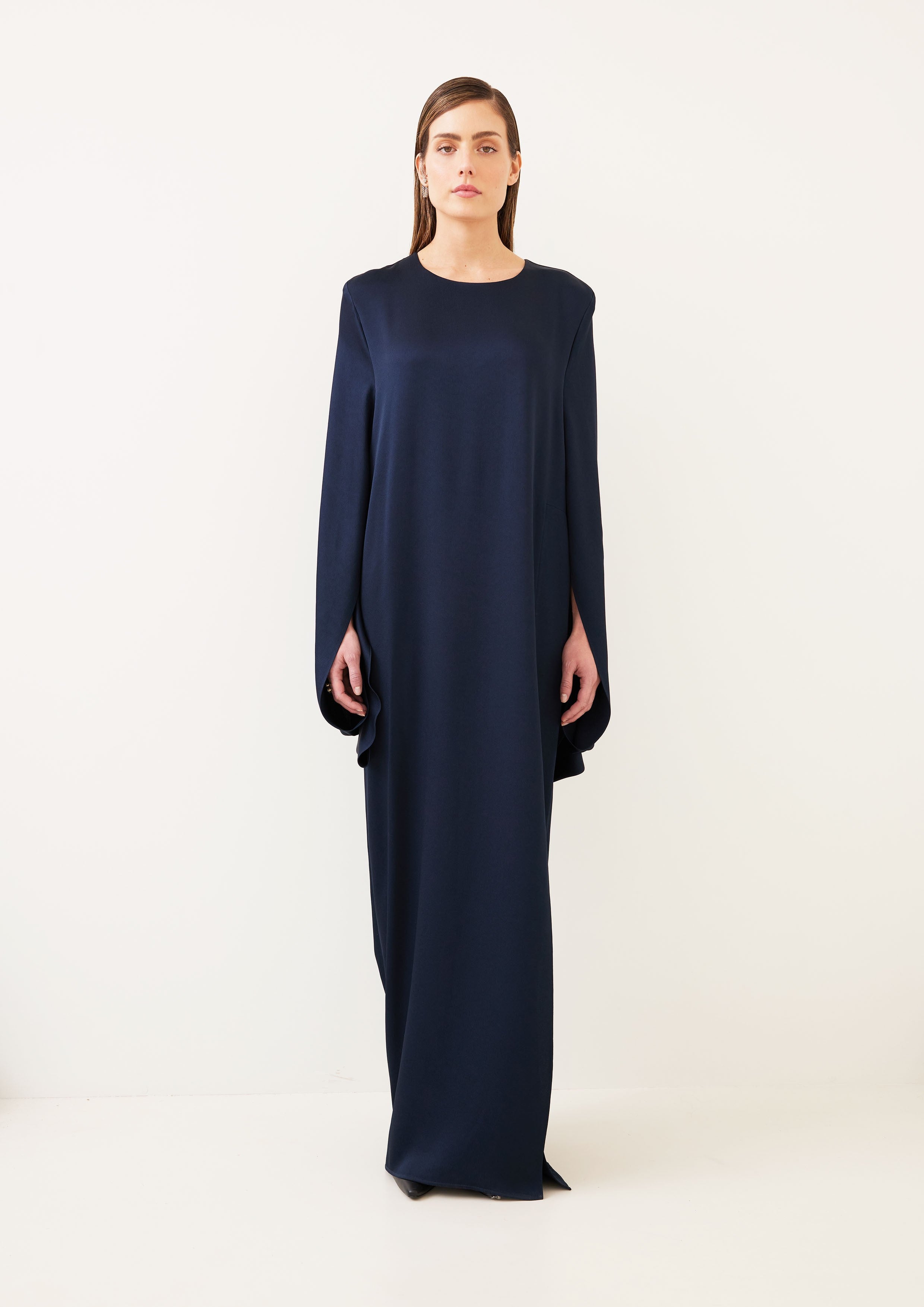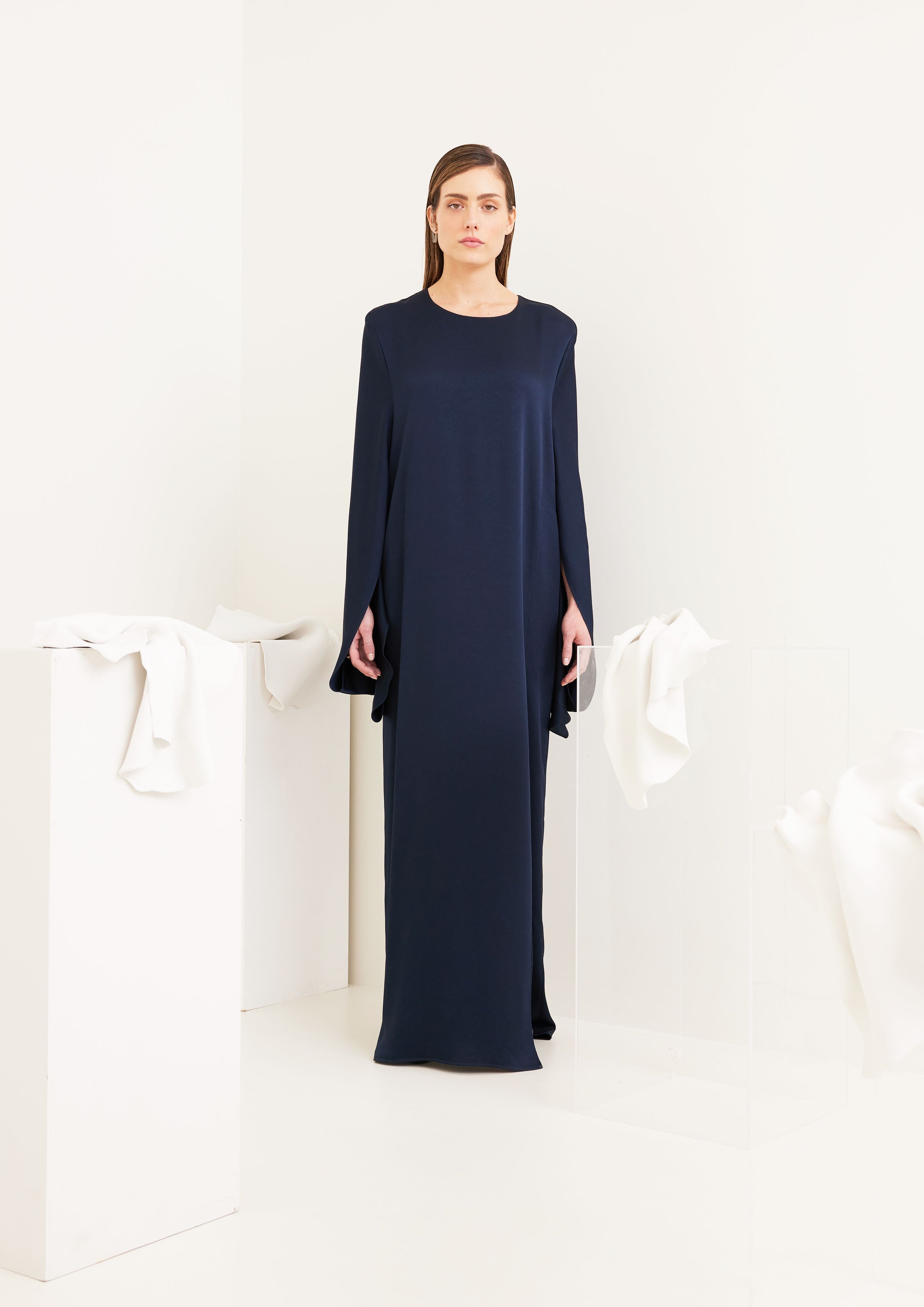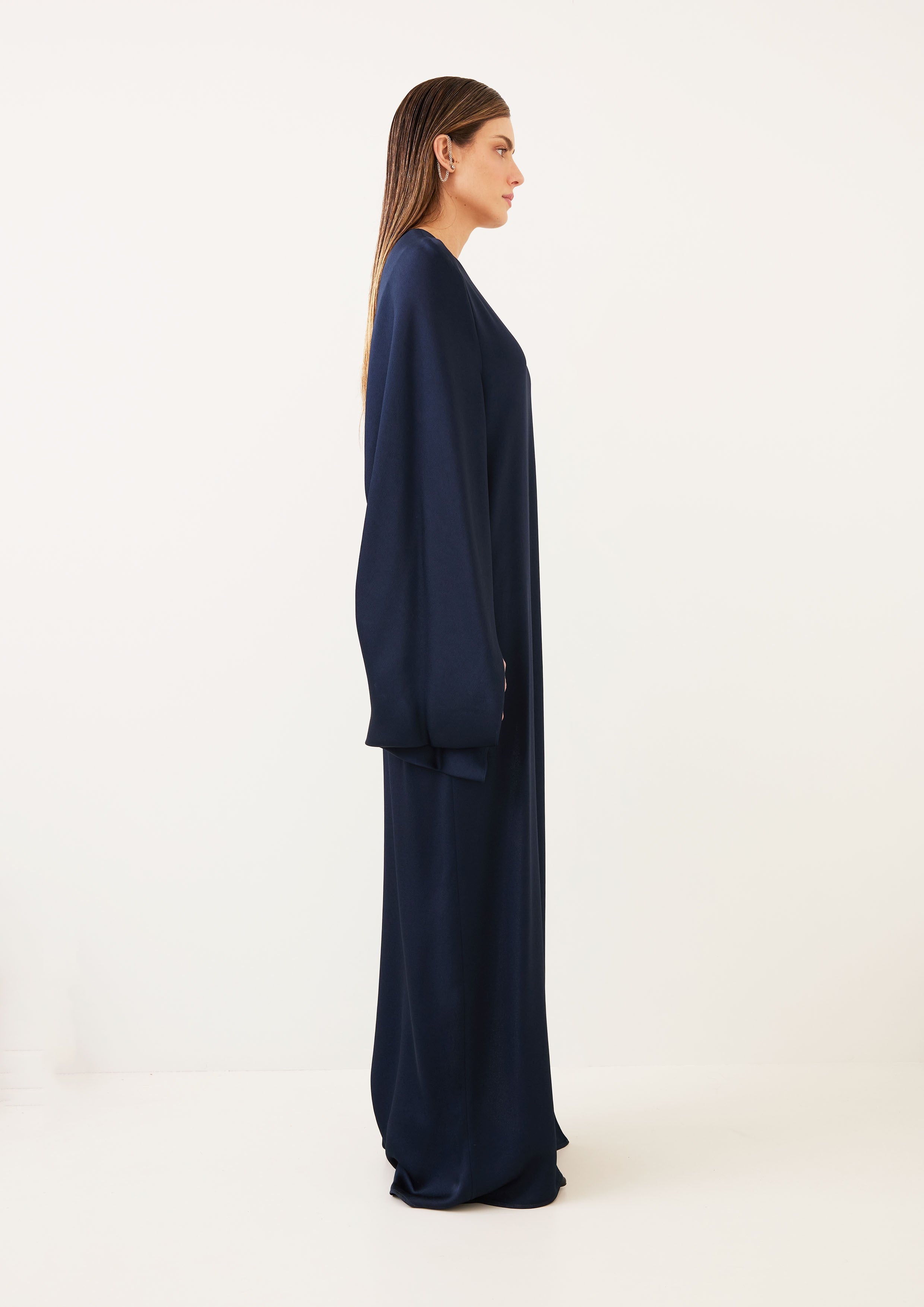 Vestido longo confeccionado em crepe. Possui gola canoa, mangas alongadas com abertura nos punhos e fecho por zíper invisível na parte traseira.