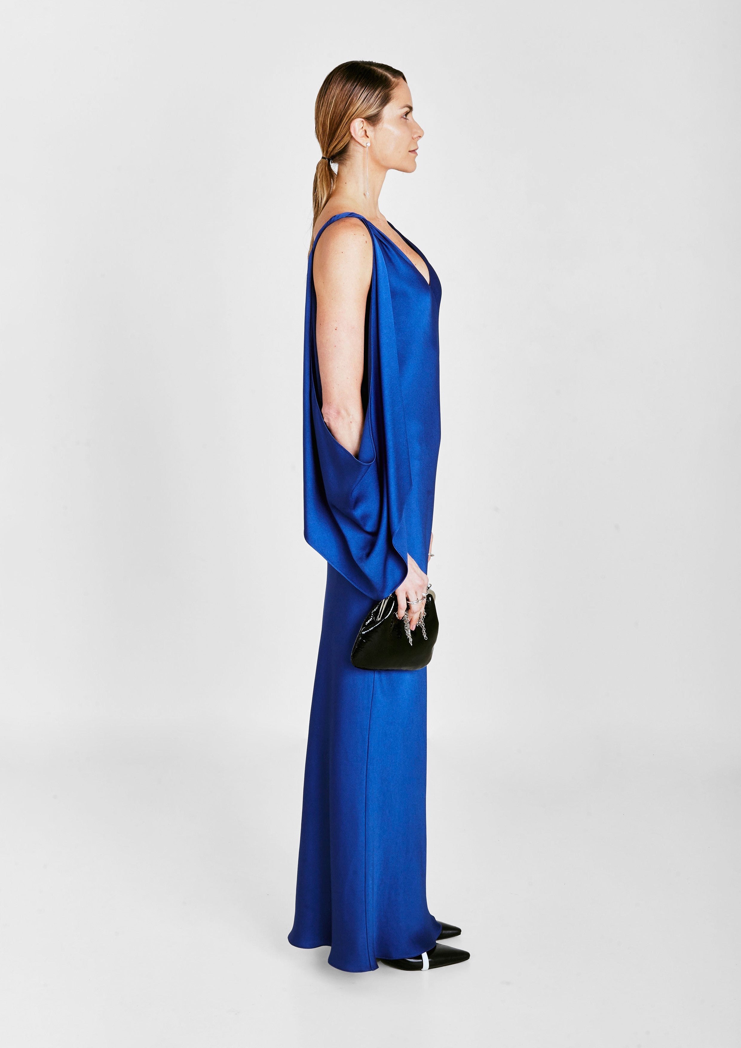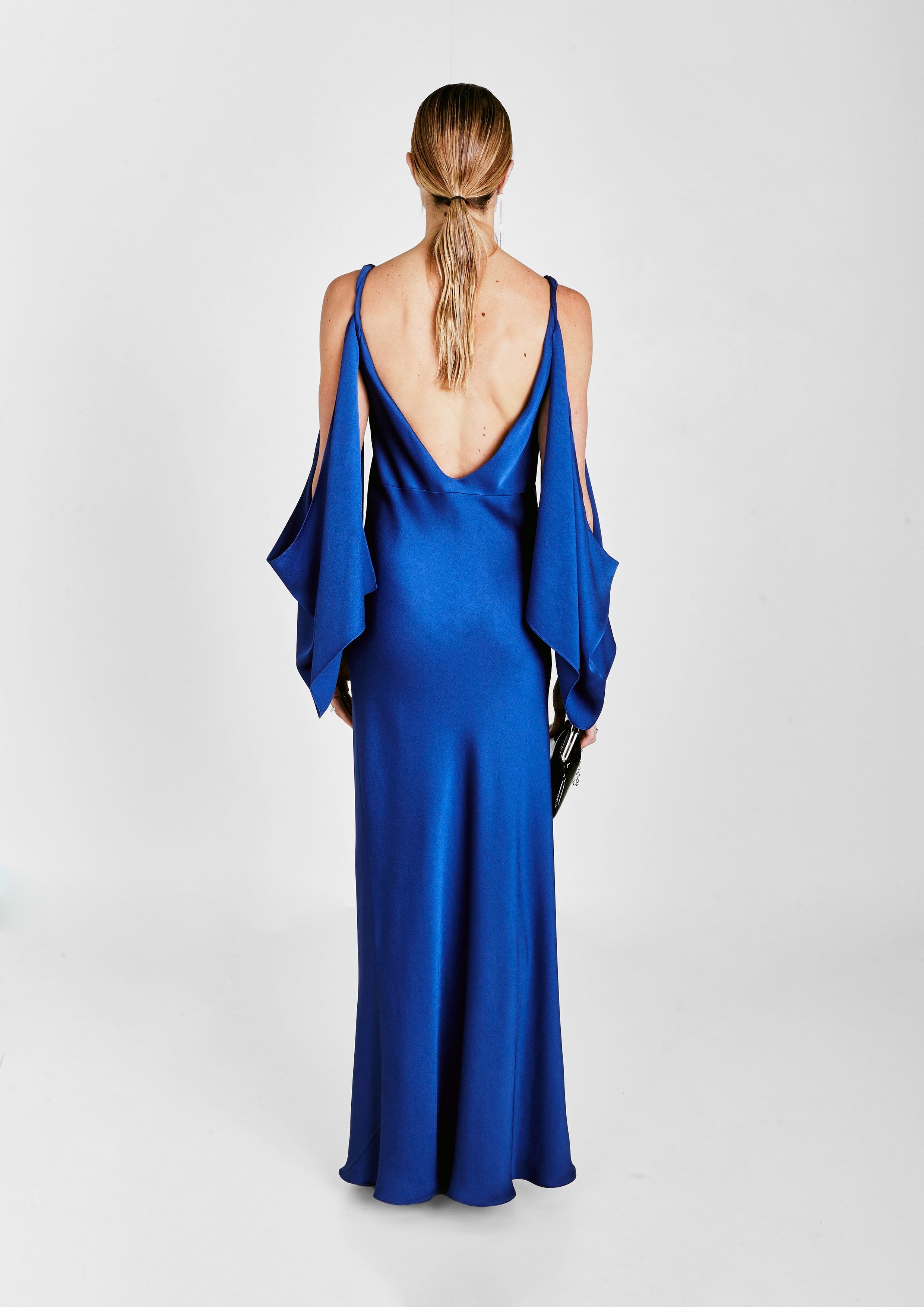 Vestido de festa longo de crepe em viés, com decote V, costas abertas, e mangas drapeadas.