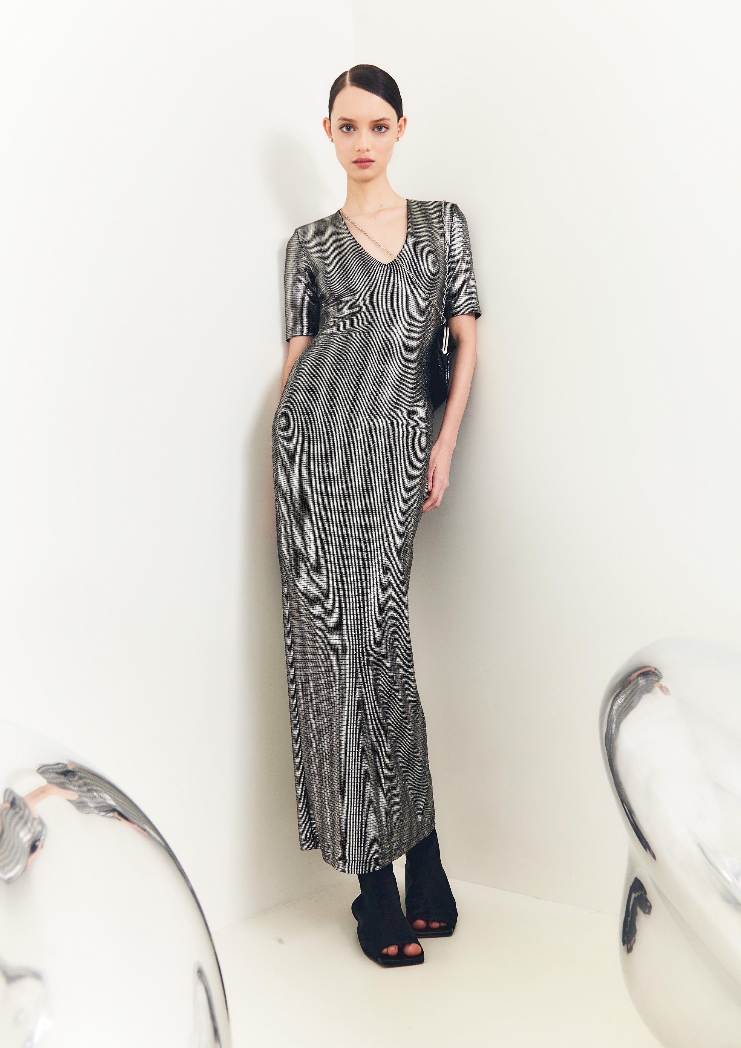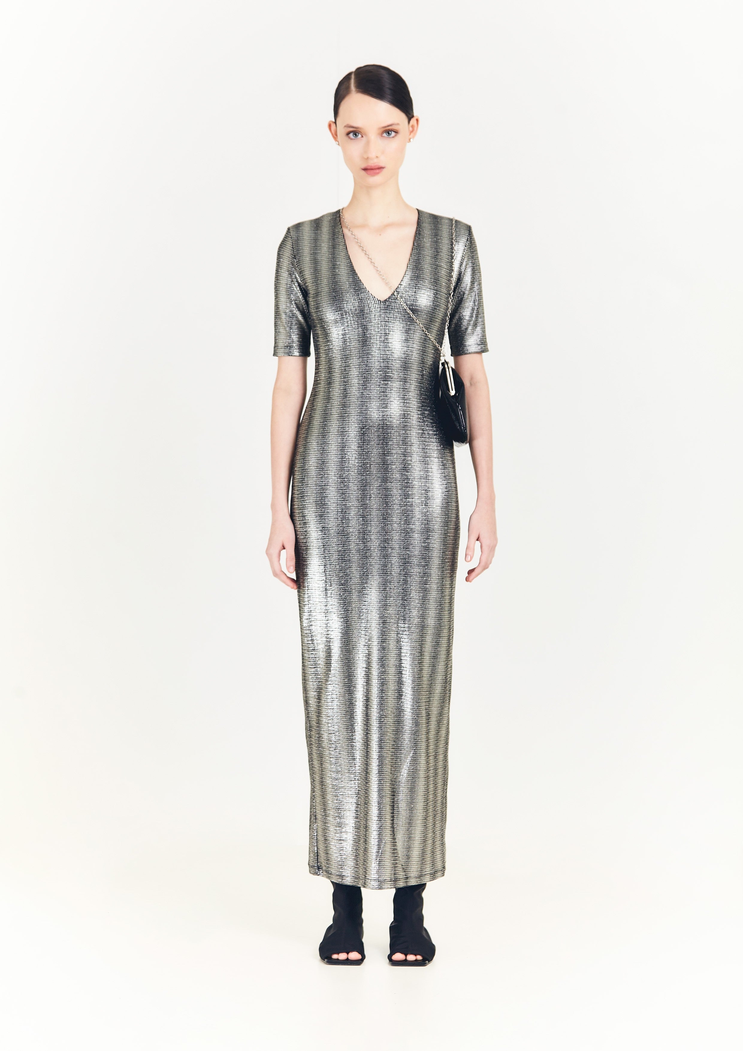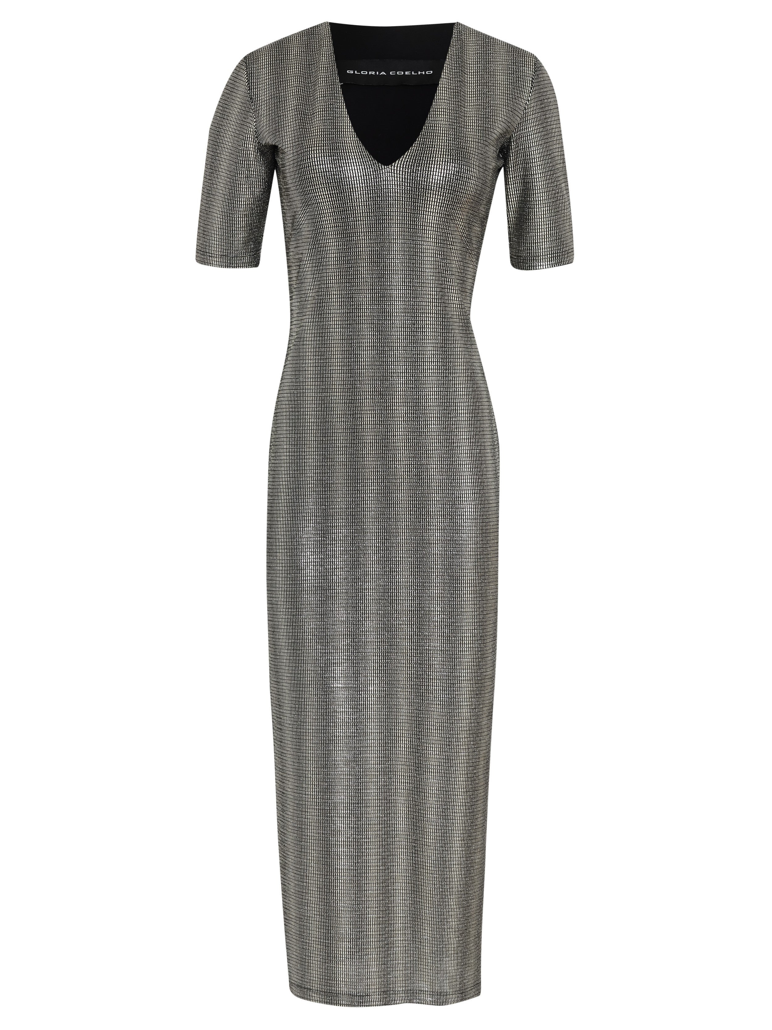 Vestido justo longo de malha, com decote V profundo na frente, e mangas justas.