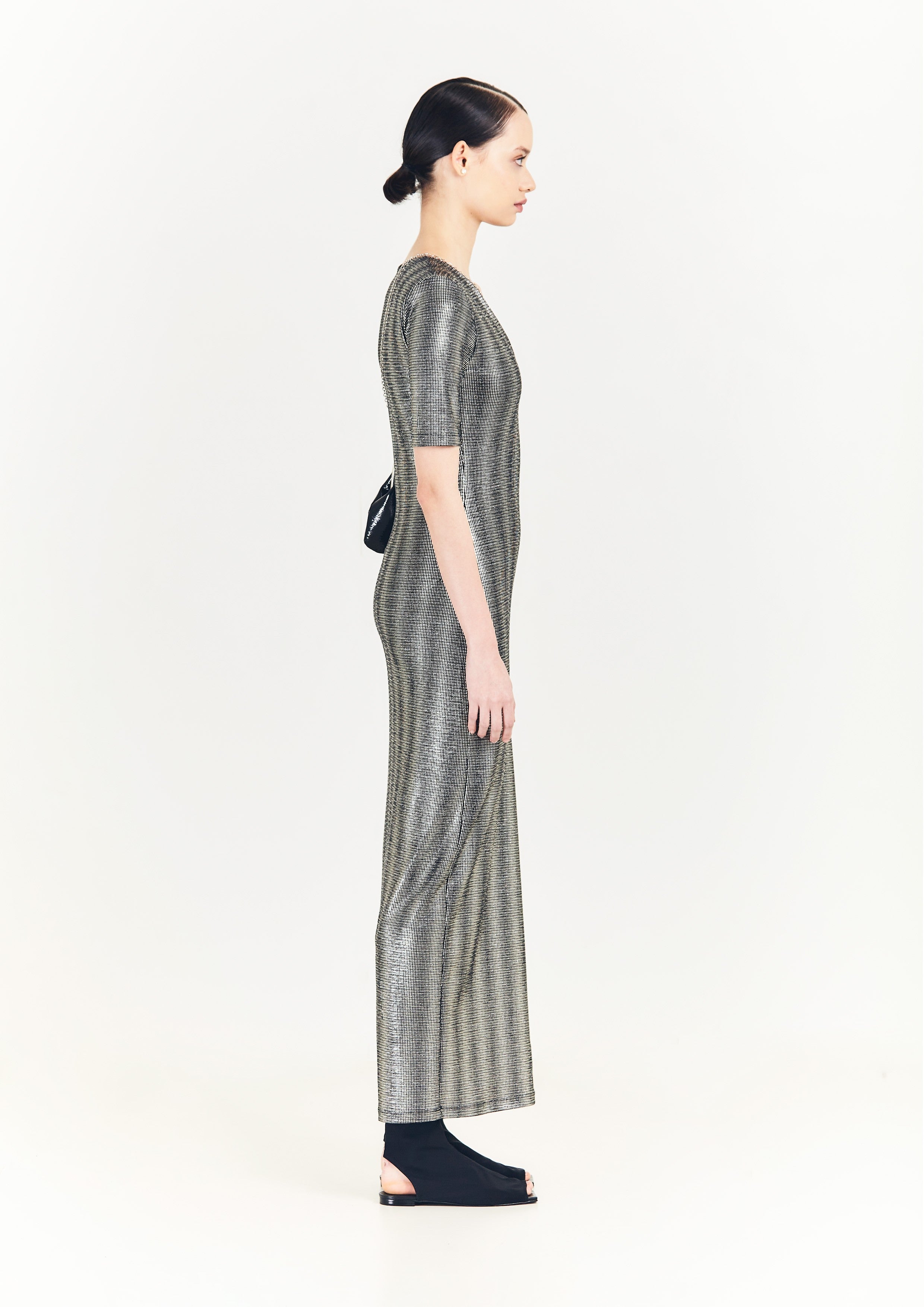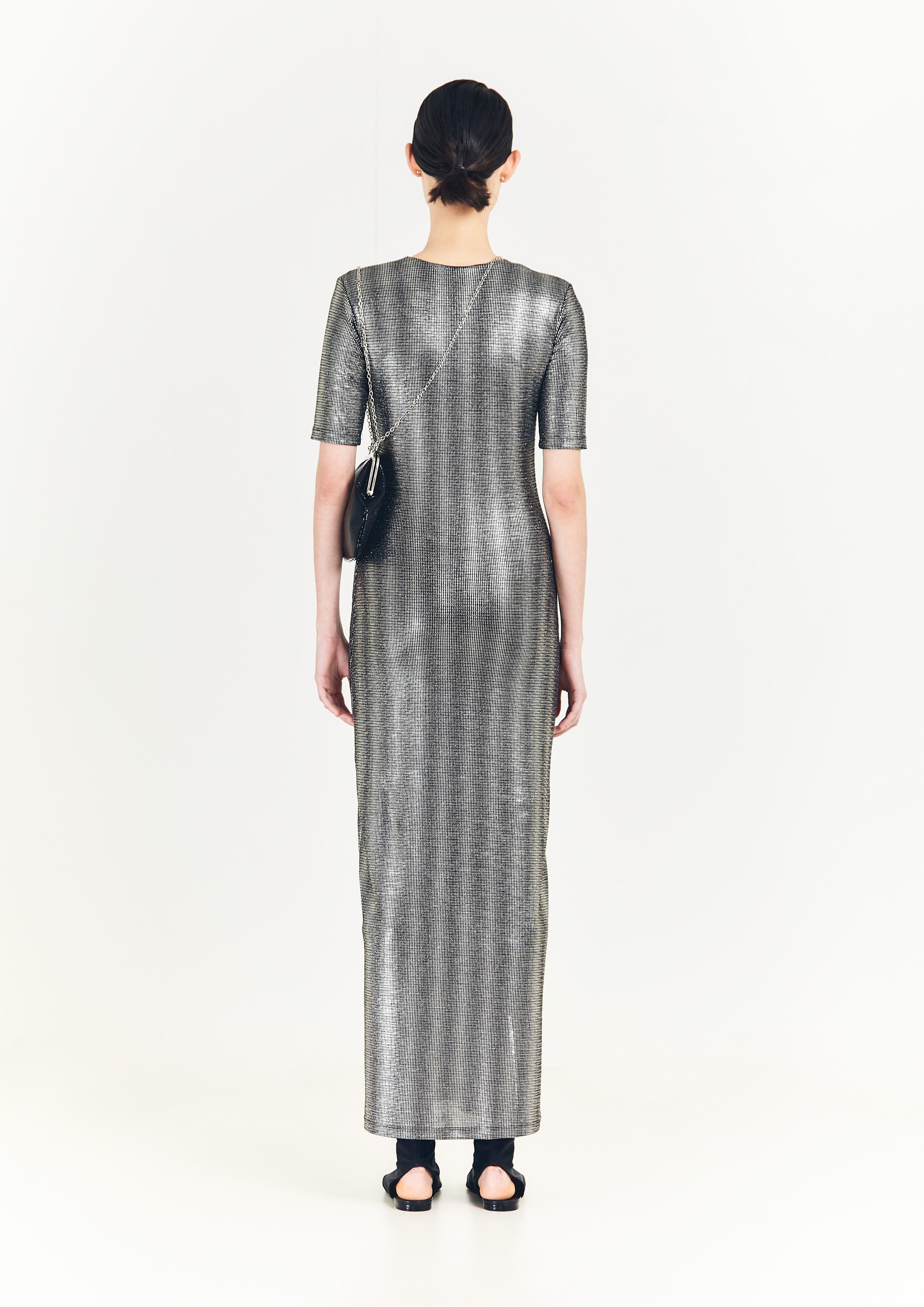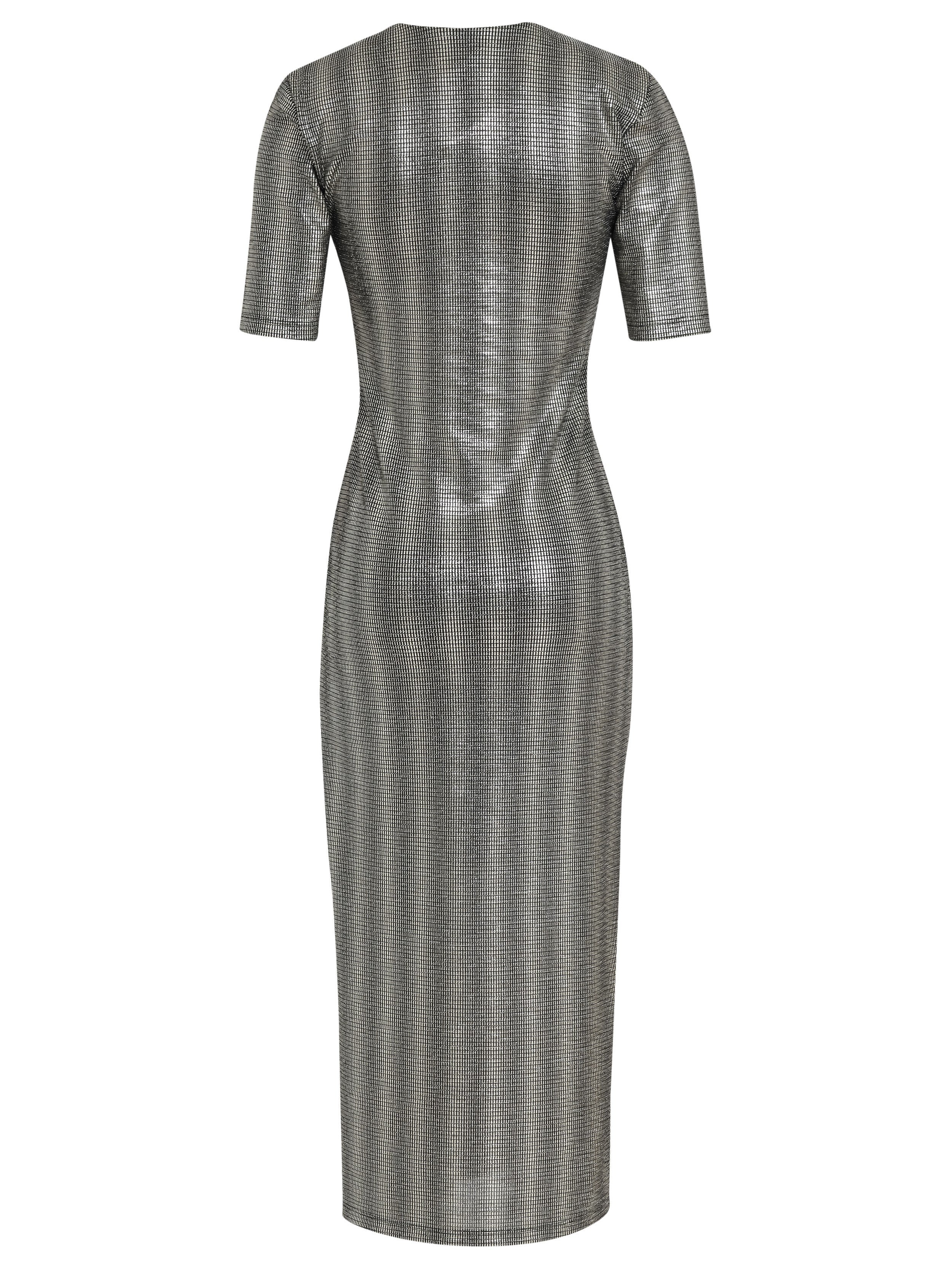 Vestido justo longo de malha, com decote V profundo na frente, e mangas justas.