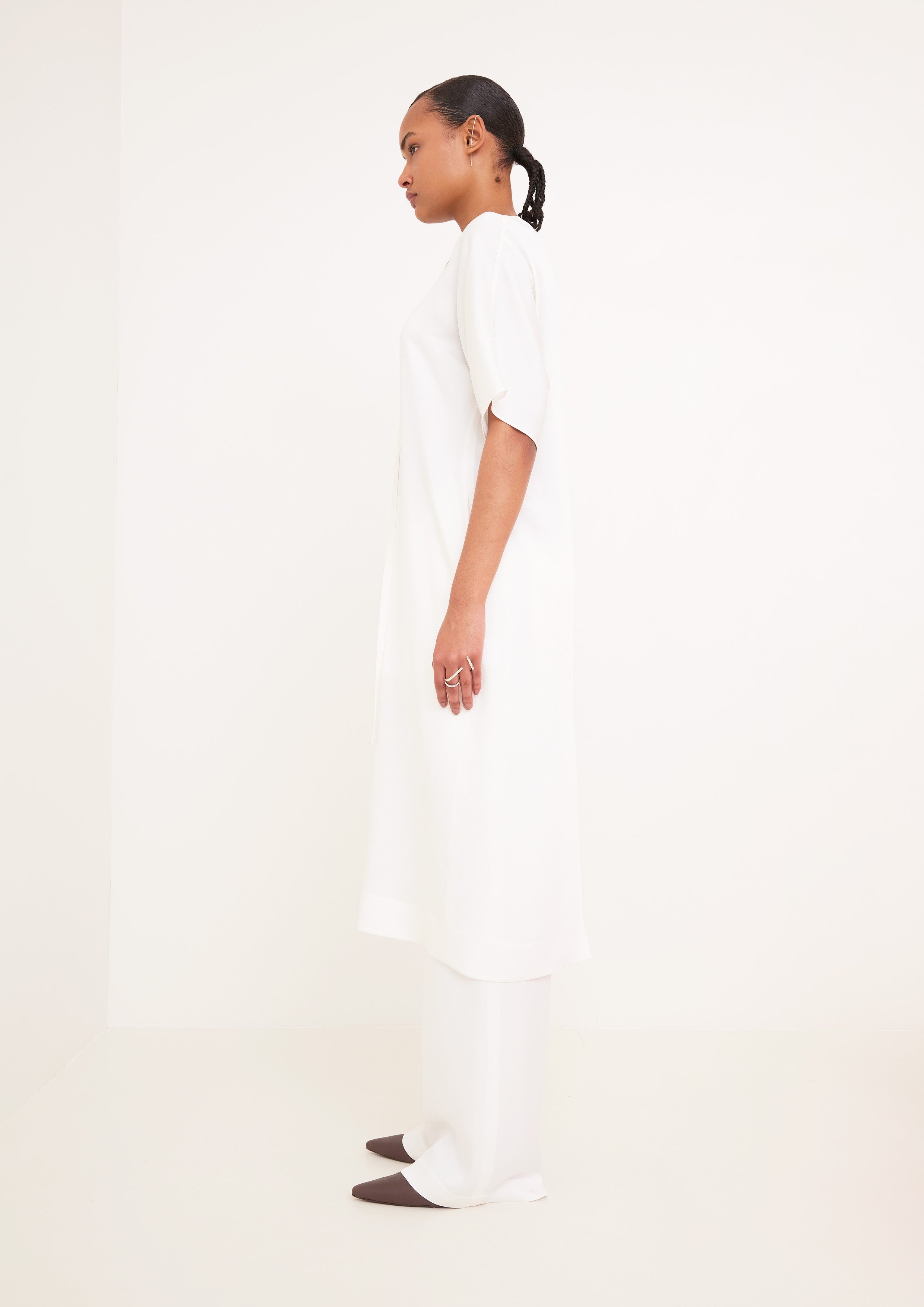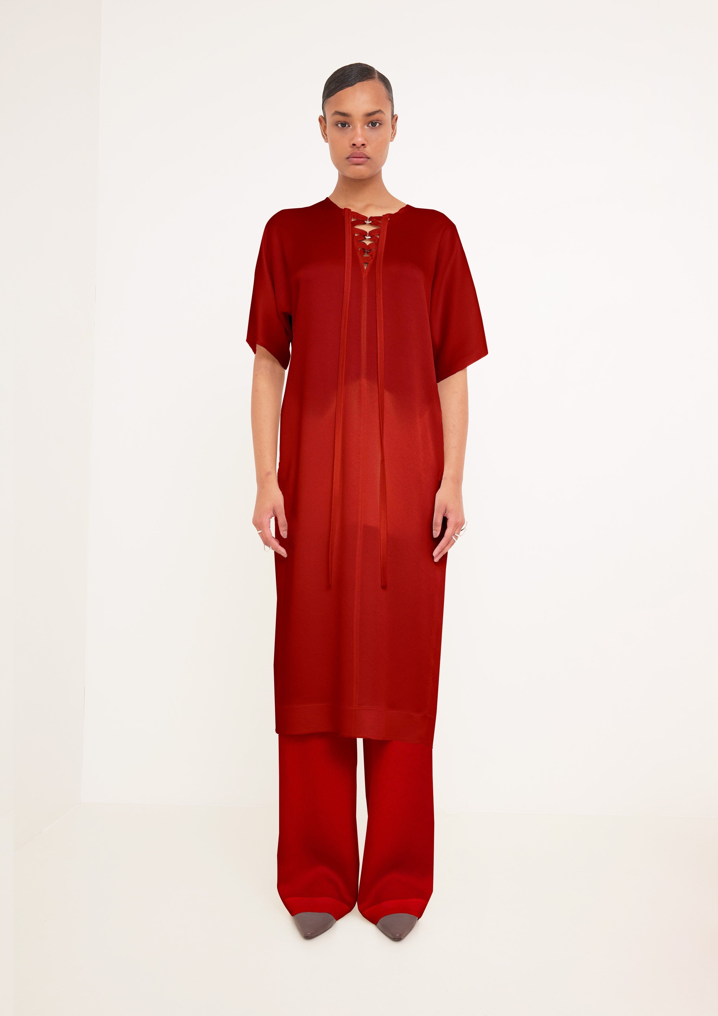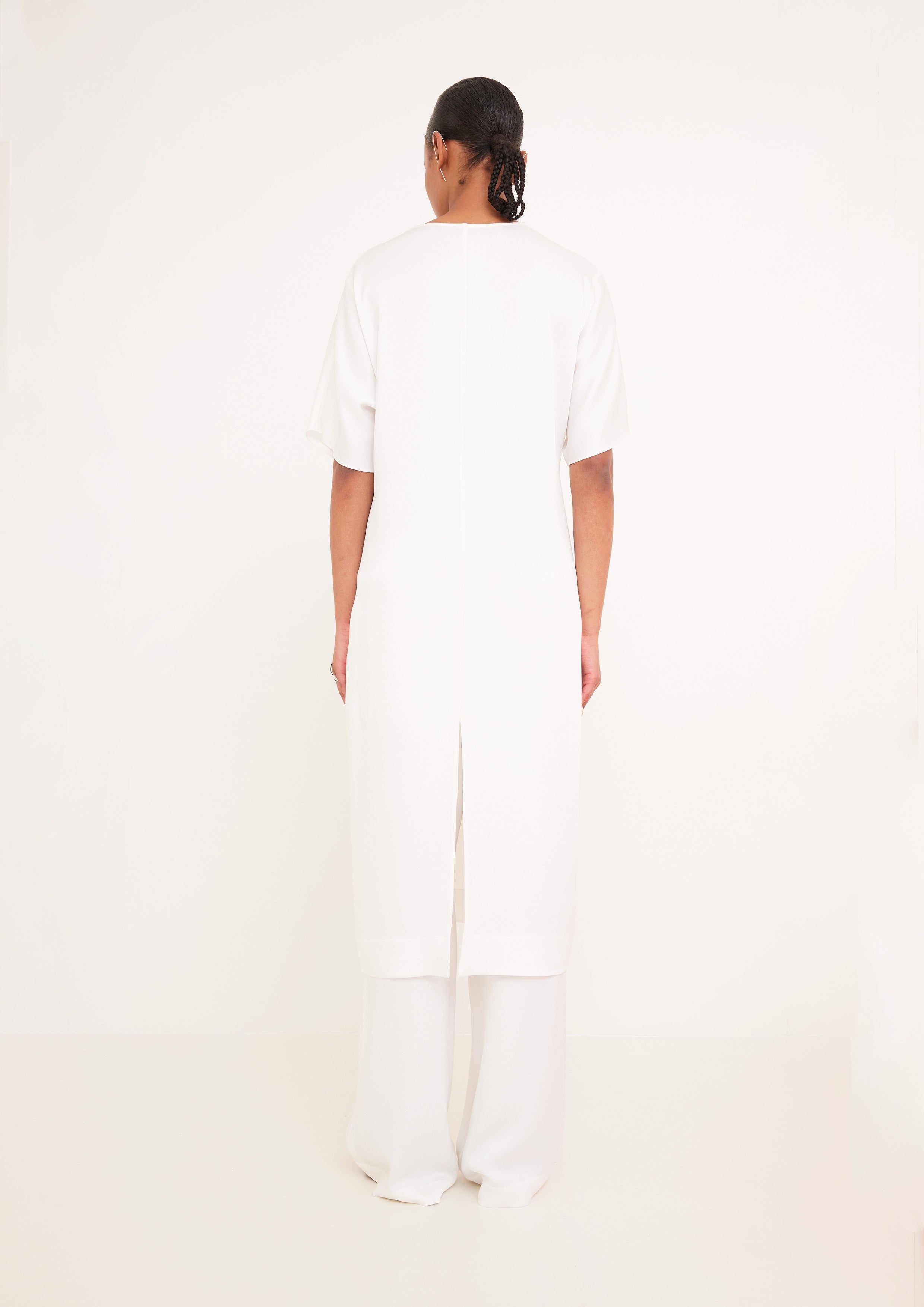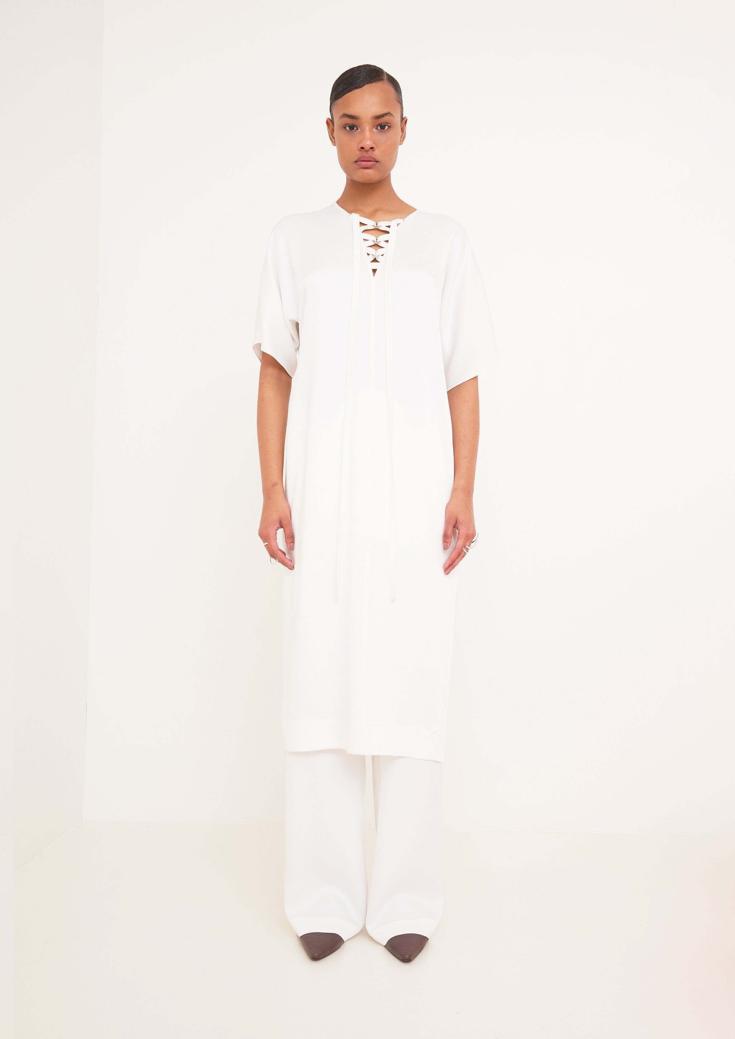 Vestido de comprimento midi com mangas amplas. Possui decote V com detalhe de fita transpassada e fivelas.