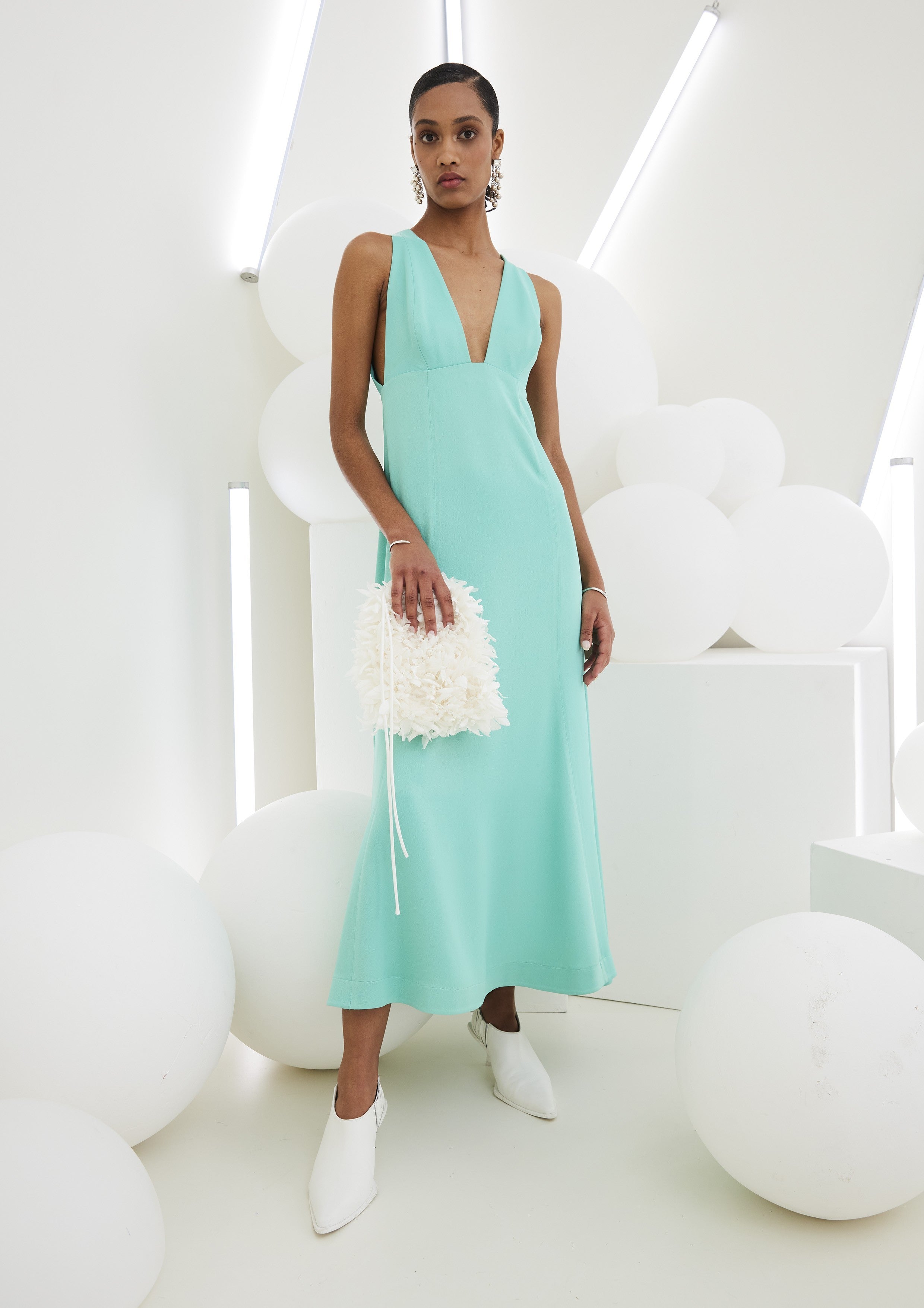 O vestido midi com decote V é confeccionado em acetato e viscose. Combina estilo e conforto em uma peça única.